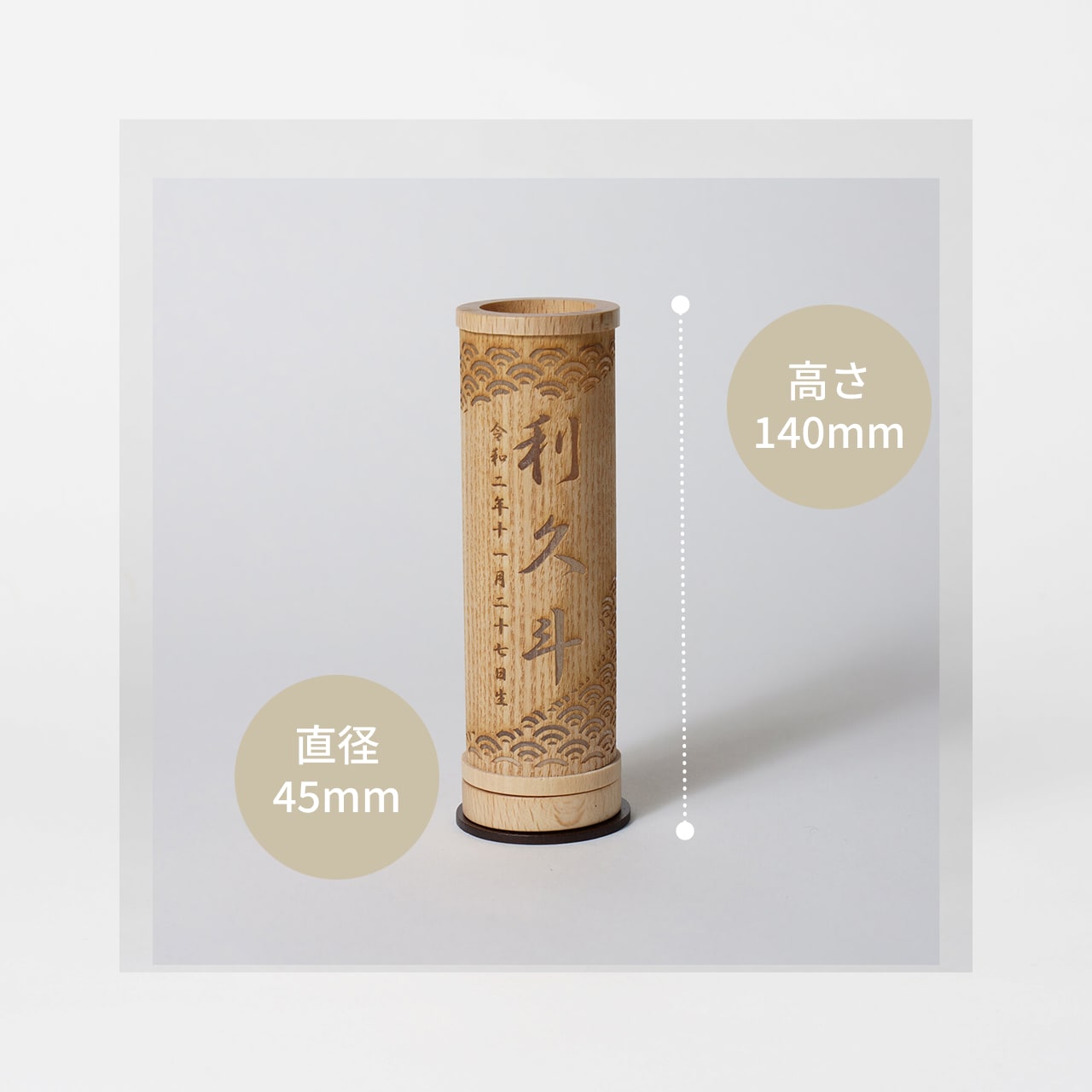 コンパクトでちょうどいいサイズコンパクトでちょうどいいサイズ今どきのおうちに合わせたコンパクトなサイズに仕上げました。飾るスペースが狭くなりがちなマンションや子ども部屋にもぴったり。天然ひのきの抗菌・防腐性天然ひのきの抗菌・防腐性素材には富士山麓の無垢ひのきを使用。ひのきには天然成分ヒノキチオールが含まれ、抗菌・防腐性があります。樹脂(ヤニ)が出る場合がありますが良質な木材の証です。伝統工芸の技術を活かした国産手作りの行燈伝統工芸の技術を活かした国産手作りの行燈伝統工芸の技術を最大限に活かし1つ1つ丁寧に職人が手作りで仕上げています。商品のご注文へ収納方法とセット内容素材:桧・タモサイズ:14 × Φ4.5 cm注意事項<名入れに関する注意事項>・生年月日は和暦・漢数字となります。・日付の後には「生」が入ります。・環境依存文字はお入れする事ができません。・旧漢字使用の場合には充分お気をつけ下さい。<お客様にお願い>※材質により目の刻印の濃淡に差が生じますが、不良品ではございません。木製品である限り自然なこととご承知下さいませ。※他の商品と一緒にご注文の場合は、納期が遅い商品にあわせてまとめての発送となります。ご不明点がございましたら > お問い合わせページ からご相談ください。