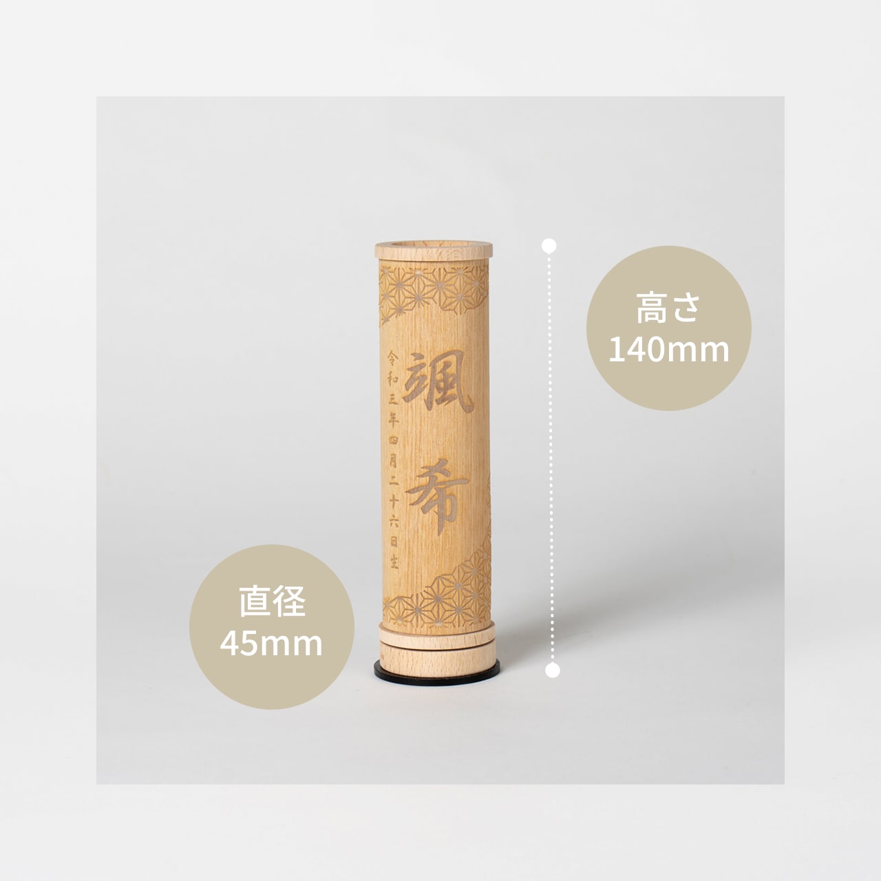 コンパクトでちょうどいいサイズコンパクトでちょうどいいサイズ今どきのおうちに合わせたコンパクトなサイズに仕上げました。飾るスペースが狭くなりがちなマンションや子ども部屋にもぴったり。天然ひのきの抗菌・防腐性天然ひのきの抗菌・防腐性素材には富士山麓の無垢ひのきを使用。ひのきには天然成分ヒノキチオールが含まれ、抗菌・防腐性があります。樹脂(ヤニ)が出る場合がありますが良質な木材の証です。伝統工芸の技術を活かした国産手作りの行燈伝統工芸の技術を活かした国産手作りの行燈伝統工芸の技術を最大限に活かし1つ1つ丁寧に職人が手作りで仕上げています。商品のご注文へ収納方法とセット内容素材:桧・タモサイズ:14 × Φ4.5 cm注意事項<名入れに関する注意事項>・生年月日は和暦・漢数字となります。・日付の後には「生」が入ります。・環境依存文字はお入れする事ができません。・旧漢字使用の場合には充分お気をつけ下さい。<お客様にお願い>※材質により目の刻印の濃淡に差が生じますが、不良品ではございません。木製品である限り自然なこととご承知下さいませ。※他の商品と一緒にご注文の場合は、納期が遅い商品にあわせてまとめての発送となります。ご不明点がございましたら > お問い合わせページ からご相談ください。