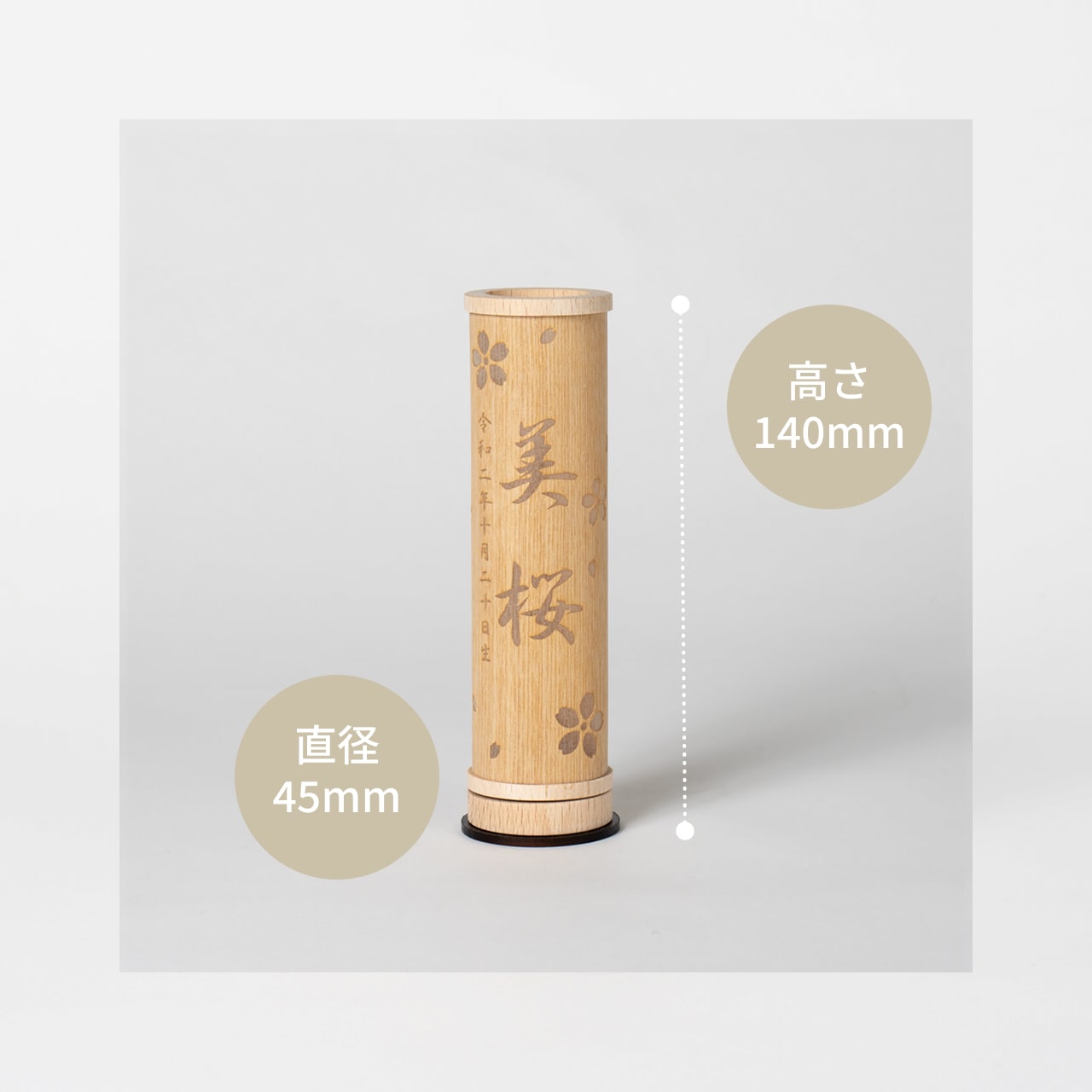 コンパクトでちょうどいいサイズコンパクトでちょうどいいサイズ今どきのおうちに合わせたコンパクトなサイズに仕上げました。飾るスペースが狭くなりがちなマンションや子ども部屋にもぴったり。天然ひのきの抗菌・防腐性天然ひのきの抗菌・防腐性素材には富士山麓の無垢ひのきを使用。ひのきには天然成分ヒノキチオールが含まれ、抗菌・防腐性があります。樹脂(ヤニ)が出る場合がありますが良質な木材の証です。伝統工芸の技術を活かした国産手作りの行燈伝統工芸の技術を活かした国産手作りの行燈伝統工芸の技術を最大限に活かし1つ1つ丁寧に職人が手作りで仕上げています。商品のご注文へ収納方法とセット内容素材:桧・タモサイズ:14 × Φ4.5 cm注意事項<名入れに関する注意事項>・生年月日は和暦・漢数字となります。・日付の後には「生」が入ります。・環境依存文字はお入れする事ができません。・旧漢字使用の場合には充分お気をつけ下さい。<お客様にお願い>※材質により目の刻印の濃淡に差が生じますが、不良品ではございません。木製品である限り自然なこととご承知下さいませ。※他の商品と一緒にご注文の場合は、納期が遅い商品にあわせてまとめての発送となります。ご不明点がございましたら > お問い合わせページ からご相談ください。