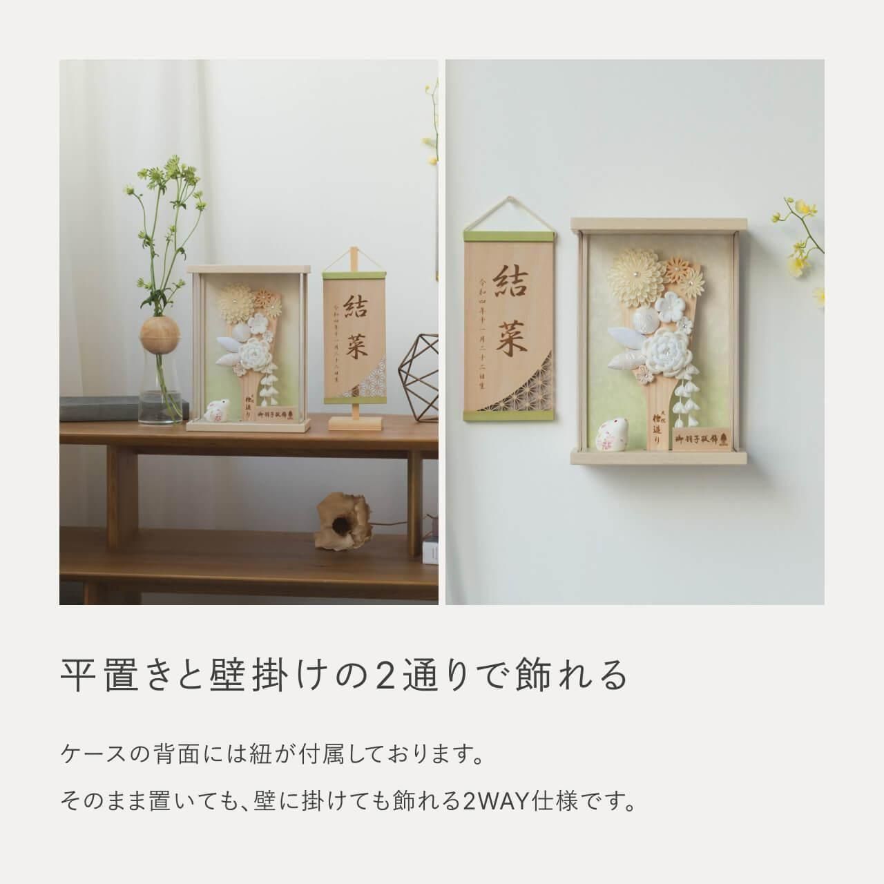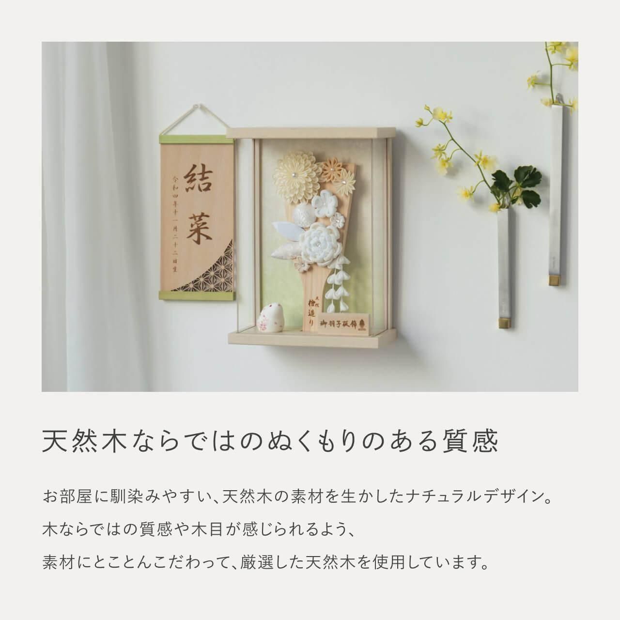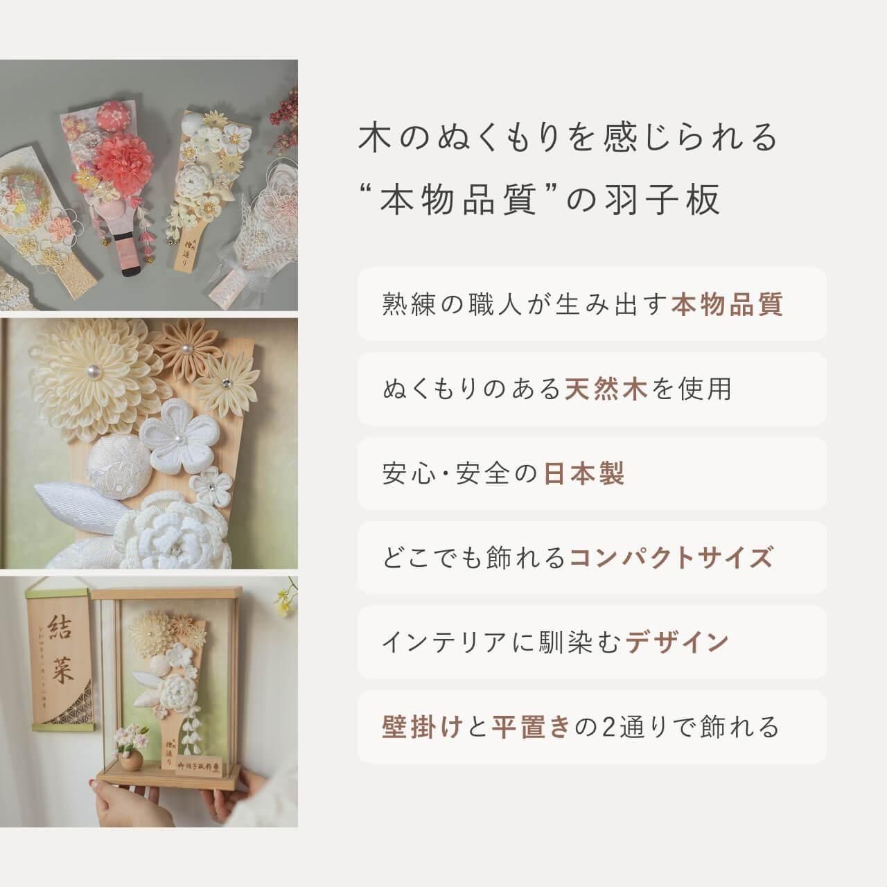 女の子の無病息災のお守りとして飾られる羽子板。熟練の職人が、伝統工芸の技術と天然木の素材を活かし、心を込めて一つひとつ丁寧につくりました。コンパクトでちょうどいいサイズコンパクトでちょうどいいサイズ今どきのおうちに合わせたコンパクトなサイズに仕上げました。飾るスペースが狭くなりがちなマンションや子ども部屋にもぴったり。インテリアに溶け込むナチュラルなデザインインテリアに溶け込むナチュラルなデザイン天然木の素材を活かしたシンプルなデザインだから、お部屋の雰囲気にもピッタリ。平置きと壁掛けの2通りで飾れる平置きと壁掛けの2通りで飾れるケースの背面には紐が付属しております。そのまま置いても、壁に掛けても飾れる2WAY仕様です。取り外せる前面アクリル板取り外せる前面アクリル板お客さまの声をもとにケース前面のアクリル板を取り外し可能なデザインにリニューアル。天然木ならではのぬくもりがより伝わるようになりました。日本の伝統工芸 つまみ細工日本の伝統工芸 つまみ細工江戸時代から伝わる日本の伝統工芸で、小さな布をつまんで様々なモチーフの形を作り、装飾品として仕上げる技法です。子供の健やかな成長を願う うさぎ子供の健やかな成長を願う うさぎ力強く跳ねるうさぎは、邪気を払い、幸福を運ぶとも言われます。コロンとしたシルエットが愛らしいお子様に人気のデザインです。最高品質の越前和紙最高品質の越前和紙ケースの背面には福井県越前市の伝統工芸品『越前和紙』を採用。受け継がれる美しい質感と優れた耐久性が魅力です。お子さまの感性を育む天然木へのこだわりお子さまの感性を育む天然木へのこだわり素材には、富士山麓の無垢のヒノキやタモ、ブナといった天然木を使用。お子さまへの一生に一度の贈り物だから、木都は自然素材の天然木にこだわり続けています。※ 生産時期により使用する素材が一部変更になる場合がございます。天然木が織りなす唯一無二の風合い天然木が織りなす唯一無二の風合い様々な種類の木材を組み合わせることで、それぞれの良さを活かした羽子板に仕上げました。タモ均一で美しい木目が特徴。弾力性と強度を持ち合わせており、耐久性があります。ブナ耐久性が高く長寿のため、家具によく用いられます。明るい色調でインテリアによく馴染みます。桧ひのき特有の香りにはリラックス効果や抗菌、防虫作用があります。湿気にも強く、耐久性に優れています。桐優れた抗菌・防腐効果をもつ成分を含み、高級家具に多く用いられています。上品さのある柔らかな光沢が特徴。熟練の職人による確かな手仕事熟練の職人による確かな手仕事伝統工芸の技術を受け継ぐ日本国内の熟練の職人が、一つひとつ丁寧に手づくりしています。おしゃれなギフト包装でお届けしますおしゃれなギフト包装でお届けします和の雰囲気を感じさせる越前和紙のギフト用ラッピングでお届け。料金がわかるものもお入れしていないので、そのまま贈り物として利用できます。収納方法とセット内容羽子板素材:桧重量:660gサイズ:W180mm × D90mm × H260mm梱包時:W195mm × D100mm × H280mm※ 本商品に名前旗は付属しておりません。別途お買い求めください。注意事項色合いなど実際のものと写真とでは多少の誤差が生じる場合がございます。また、手作りであり天然木を使用している為、多少の仕様の変化や風合いがひとつひとつ異なります。あらかじめご了承ください。材質により木の刻印の濃淡に差が生じますが不良品ではございません。木製品である限り自然なこととご承知下さいませ。保管場所は変色やカビ、サビの原因になりますので湿気の少ない場所・直射日光の当たらない場所に保管してください。本商品に名前旗は付属しておりません。別途お買い求めください。ご不明点がございましたら > お問い合わせページ からご相談ください。 型番 0103 ことの羽子板 このは BEケース ¥28,600税込 送料無料(一部離島を除く) 行燈別売 ¥11,000 あわせて購入 名前旗 雛人形や五月人形とご一緒に コンパクトサイズの雛人形や五月人形と一緒に飾るのにぴったりな名前旗です。5つのカラーと3種類のデザインをお好みでお選びいただけます。 商品情報へ 行燈付き商品の場合は行燈に名入れいたします。ご注文の際は備考欄にお名前・フリガナ・生年月日をご記入ください。空欄の場合は柄のみでお作りさせて頂きます。 個 カートに追加 特定商取引法に基づく表記(返品等) レビューを見る 0 レビューを投稿 関連記事 あなたにおすすめの商品 ことの木製ひな人形 5人飾り 収納 ¥48,000 税込 ことのオリジナル雑貨 名前旗 ¥11,200 税込 ことのオリジナル雑貨 名前羽子板 LED ¥7,500 税込 { "pid": "162935215" }