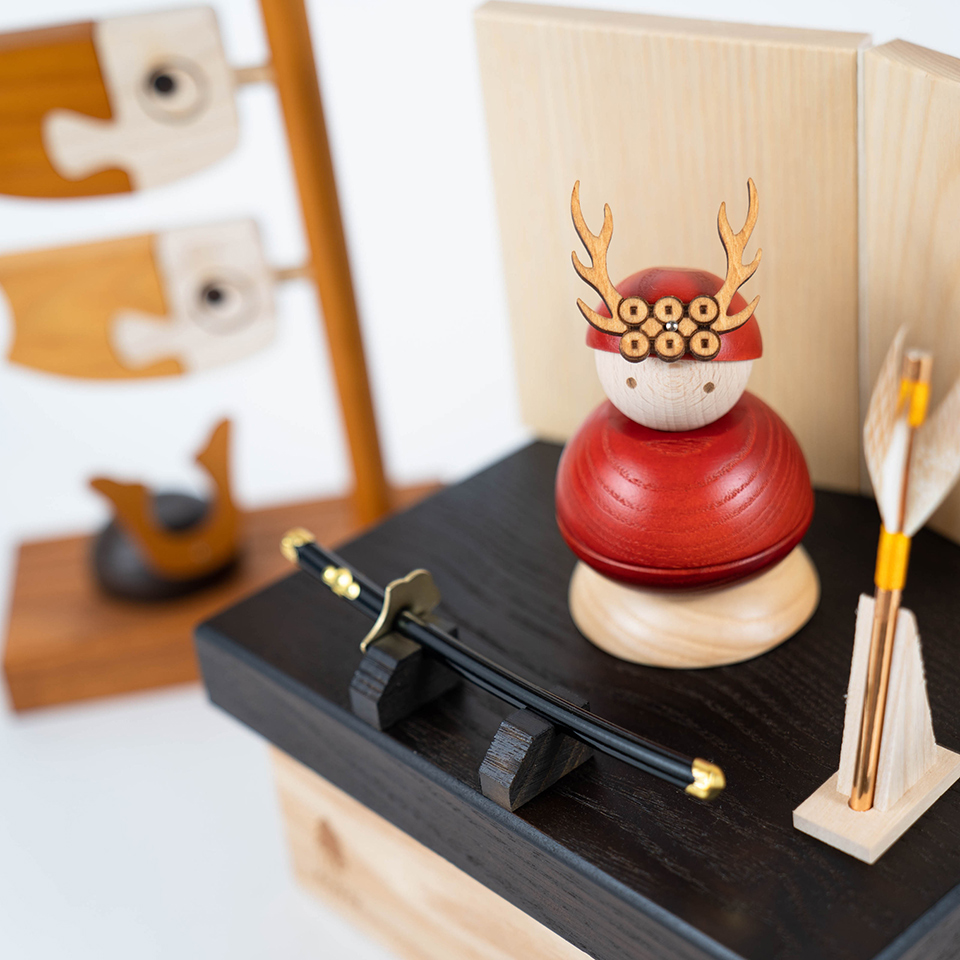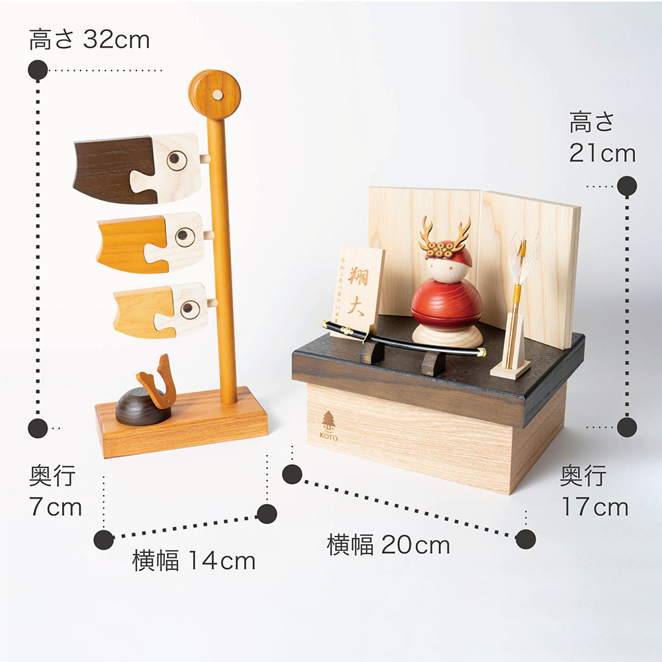 実際に手に取ると天然木の素材ならではの優しいぬくもりが伝わります。てづくり工房「木都」の職人が、伝統工芸の技術と天然木の素材を活かし、真心込めて1つ1つ丁寧につくりました。親しみやすく、お子様と一緒に飾れる積み木のような五月人形です。※ 細かい部品が含まれています。3歳未満のお子様は、保護者の方と一緒にお遊びください。コンパクトでちょうどいいサイズコンパクトでちょうどいいサイズ今どきのおうちに合わせたコンパクトなサイズに仕上げました。飾るスペースが狭くなりがちなマンションや子ども部屋にもぴったり。手にとって遊べる五月人形手にとって遊べる五月人形ことの木製鎧は、ちゃんと手にとって遊べる五月人形をコンセプトに設計されています。顔の角度や胴体の組み合わせなど自由自在。小さなお子様と遊びながら、健やかな成長を願う・・・そんな今しか体験できない「節句」をお過ごし下さい。兜の由来〜真田幸村兜の由来〜真田幸村古くから鹿は神の使いといわれてきました。その鹿の角と六文銭がモチーフです。六文銭は戦死に対する覚悟の表明といわれています。そもそも「六文銭」とは、納棺の際に死後の平安を祈るために「三途の川の渡し賃」として棺に六銭投げ込む慣習から生まれたもので、真田幸村は六文銭を兜に描くことで兵士に対する意思表明を行なっていたと考えられています。お部屋のイメージに調和するデザインお部屋のイメージに調和するデザイン天然木の素材を活かしたシンプルなデザインだから、お部屋の雰囲気にもピッタリ。お子さまの感性を育む天然木へのこだわりお子さまの感性を育む天然木へのこだわり素材には、タモ、ブナといった天然木を使用。お子さまへの一生に一度の贈り物だから、木都は自然素材の天然木にこだわり続けています。※ 生産時期により使用する素材が一部変更になる場合がございます。熟練の職人による確かな手仕事熟練の職人による確かな手仕事伝統工芸の技術を受け継ぐ日本国内の熟練の職人が、一つひとつ丁寧に手づくりしています。おしゃれなギフト包装でお届けしますおしゃれなギフト包装でお届けします和の雰囲気を感じさせる越前和紙のギフト用ラッピングでお届け。料金がわかるものもお入れしていないので、そのまま贈り物として利用できます。商品レビュー記入でもれなくもらえる天然木のミニ名前札プレゼント商品レビュー記入でもれなくもらえる天然木のミニ名前札プレゼントミニサイズのお名前札 (通常販売価格1,980円) をプレゼント♪商品到着後、商品レビューをご記入の上、商品と同梱のチラシ記載のQRコードから応募フォームへ必要事項をご入力ください。店舗よりレビュー特典を発送いたします。※ お名前札の生年月日の表記は和暦となります。(例:令和七年)商品のご注文へ収納方法とセット内容木製鎧:兜・顔・首・胴体・胴体中・胴体下・屏風・矢羽・矢羽立・刀・刀受×2・収納箱屏風は収納箱の上に乗せてダンボール箱におしまい下さい。鯉のぼり:鯉のぼり (父・母・子) 鯉のぼり台・矢車・兜素材:タモ・ブナ重量:1,000g重量:380g鯉のぼり木製鎧サイズ:W200mm × D170mm × H210mm梱包時:W255mm × D190mm × H115mm人形のみ:約 W60mm × D60mm × H110mm鯉のぼりサイズ:W140mm × D70mm × H320mm梱包時:W150mm × D80mm × H330mm注意事項鯉のぼりについて※こいのぼりの頭部と胴部は接着させており、取り外しできません。がたつきがあるものもございますが品質上問題ございません。無理に取り外すことはしないでください。※兜は部品が取れやすい為、引っ張ったり力を加えたりしないでください。※矢車は回転させることができます。また取り外しも可能です。※ポールからこいのぼりを取り外して飾ったり遊んだりしていただけます。木製鎧について※観賞用ではございますが手にとって遊んでいただくことも可能です。※首は取り外し可能です。顔の角度をお好みで調整してお楽しみ下さい。※鍬形部は折れやすくなっております。強い衝撃を与えたり落としたりしないで下さい。※色合いなど実際のものと写真とでは多少の誤差が生じる場合がございます。また、手作りであり天然木を使用している為、多少の仕様の変化や風合いがひとつひとつ異なります。あらかじめご了承ください。※部品には小さなものがございます。お子様がお口に入れないようにご注意ください。※材質により目の刻印の濃淡に差が生じますが不良品ではございません。木製品である限り自然なこととご承知下さいませ。※保管場所は変色やカビ、サビの原因になりますので湿気の少ない場所・直射日光の当たらない場所に保管してください。※受注生産品のため、時期によりお届け時期が前後する場合がございます。ご不明点がございましたら > お問い合わせページ からご相談ください。