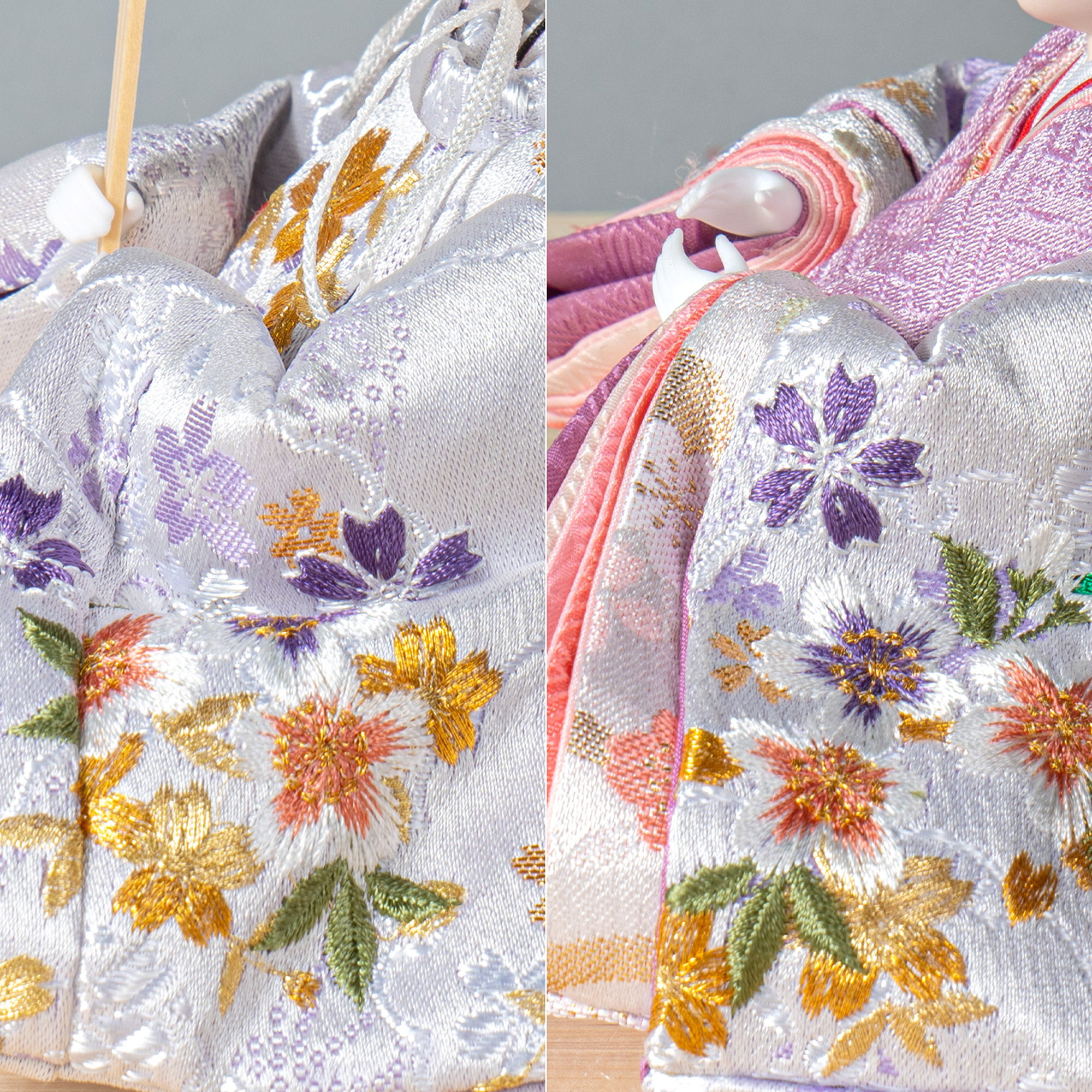 お人形の着物の柄、お色がとっても好みの色でお洒落だし、お雛様の着物の後ろにハート柄が隠れててとっても可愛い着物で母の私までキュンとなりました💓着物の生地も丁寧に仕上げられていて、じっくりみたくなる雛人形さんです🎎
