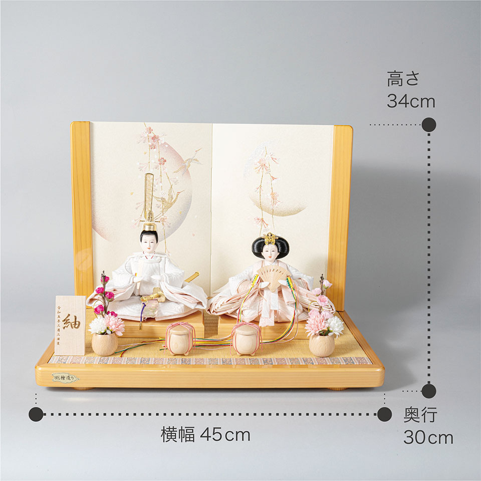 精巧な凛として美しい佇まいを天然木の優しいぬくもりが包み込む・・・まるで女の子の成長を温かく見守る家族の様に・・・そんなコンセプトから生まれた、親しみやすく、お子様と一緒に飾れる「ことの雛人形」です。コンパクトでちょうどいいサイズコンパクトでちょうどいいサイズ今どきのおうちに合わせたコンパクトなサイズに仕上げました。飾るスペースが狭くなりがちなマンションや子ども部屋にもぴったり。お部屋のイメージに調和するデザインお部屋のイメージに調和するデザイン天然木の素材を活かしたシンプルなデザインだから、お部屋の雰囲気にもピッタリ。お衣装へのこだわりお衣装へのこだわり柄は雲立涌柄といい、雲や蒸気が立ち昇る様で子供の運気上昇を願う縁起のいい文様です。手作りへのこだわり〜裂地(きれじ)の裁断手作りへのこだわり〜裂地(きれじ)の裁断和紙で衣裳の各種型紙を作り、へり部分にのみ糊をつけ、裂地裏面に貼り付けます。型紙に沿って裁断して衣裳部品を作っていきます。手作りへのこだわり〜縫製手作りへのこだわり〜縫製姫の十二単の唐衣(からぎぬ)・五衣(いつつぎぬ)・単衣(ひとえ)・裾、殿の着物・裾・中袖等、数多くの衣裳部品をミシン、または手縫いで細やかな部分まで縫い合わせ、折り込み仕上げていきます。手作りへのこだわり〜着付け・振付け手作りへのこだわり〜着付け・振付け仕上がった衣裳は両腕を後方に曲げて羽織らせるようにして着付けます。次にそれぞれの人形の形に振付けます。腕を曲げる角度や手の位置などで全体のバランスを取ります。手作りへのこだわり〜頭差し手作りへのこだわり〜頭差し頭さしは最終の人形検品を兼ねて行われます。包まれた顔紙を外し、汚れ等無いことを確認します。頭と衣紋の中心線が一直線になるように差し込みます。ことのお雛様ことのお雛様お雛様の顔は時代とともに人気のお顔があります。ことのお雛様のお顔は時代に左右されない普遍的なシンプルで可愛らしいお顔となっています。お子さまの感性を育む天然木へのこだわりお子さまの感性を育む天然木へのこだわり素材には、富士山麓の無垢のヒノキやタモ、ブナといった天然木を使用。お子さまへの一生に一度の贈り物だから、木都は自然素材の天然木にこだわり続けています。※ 生産時期により使用する素材が一部変更になる場合がございます。熟練の職人による確かな手仕事熟練の職人による確かな手仕事伝統工芸の技術を受け継ぐ日本国内の熟練の職人が、一つひとつ丁寧に手づくりしています。おしゃれなギフト包装でお届けしますおしゃれなギフト包装でお届けします和の雰囲気を感じさせる越前和紙のギフト用ラッピングでお届け。料金がわかるものもお入れしていないので、そのまま贈り物として利用できます。商品レビュー記入でもれなくもらえる天然木のミニ名前札プレゼント商品レビュー記入でもれなくもらえる天然木のミニ名前札プレゼントミニサイズのお名前札 (通常販売価格1,980円) をプレゼント♪商品到着後、商品レビューをご記入の上、商品と同梱のチラシ記載のQRコードから応募フォームへ必要事項をご入力ください。店舗よりレビュー特典を発送いたします。※ お名前札の生年月日の表記は和暦となります。(例:令和七年)商品のご注文へ収納方法とセット内容お内裏様・お雛様・屏風・平台・親王台・人形小道具・貝桶×2・花飾り×2屏風は平台と同様に個別でダンボール箱におしまい下さい。親王台は屏風のダンボールに入れます。素材:ヒノキ重量:2,680g サイズ:W450mm × D300mm × H340mm梱包時:W465mm × D335mm × H235mm殿:約 W185mm × D165mm × H215mm姫:約 W220mm × D190mm × H125mm注意事項色合いなど実際のものと写真とでは多少の誤差が生じる場合がございます。また、手作りであり天然木を使用している為、多少の仕様の変化や風合いがひとつひとつ異なります。あらかじめご了承ください。部品には小さなものがございます。お子様がお口に入れないようにご注意ください。材質により木の刻印の濃淡に差が生じますが不良品ではございません。木製品である限り自然なこととご承知下さいませ。保管場所は変色やカビ、サビの原因になりますので湿気の少ない場所・直射日光の当たらない場所に保管してください。雄雛の正面にあります飾り帯のビニールは外さないでください。本商品に行燈は付属しておりません。別途お買い求めください。ご不明点がございましたら > お問い合わせページ からご相談ください。