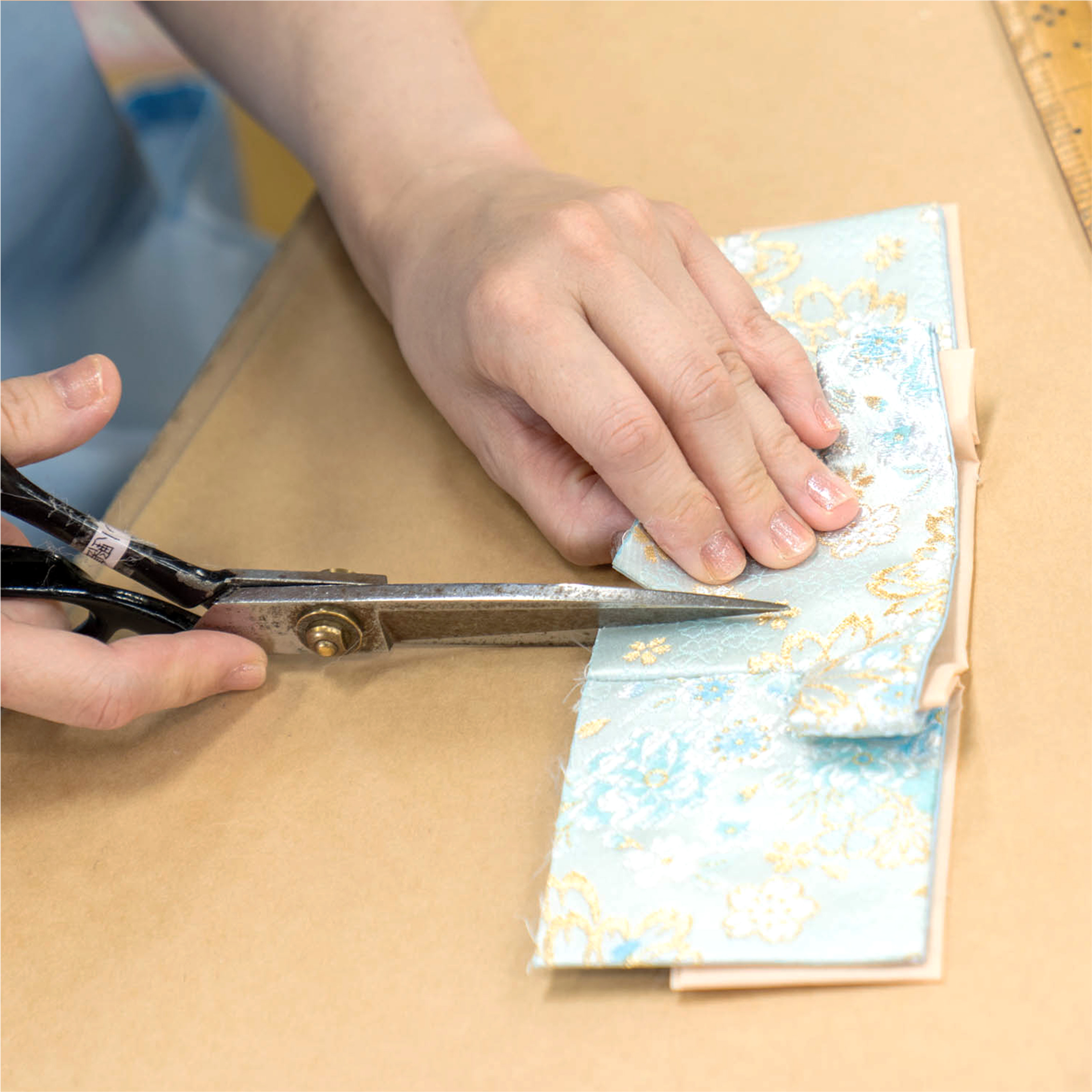 手作りへのこだわり〜縫製姫の十二単の唐衣(からぎぬ)・五衣(いつつぎぬ)・単衣(ひとえ)・裾、殿の着物・裾・中袖等、数多くの衣裳部品をミシン、または手縫いで細やかな部分まで縫い合わせ、折り込み仕上げていきます。