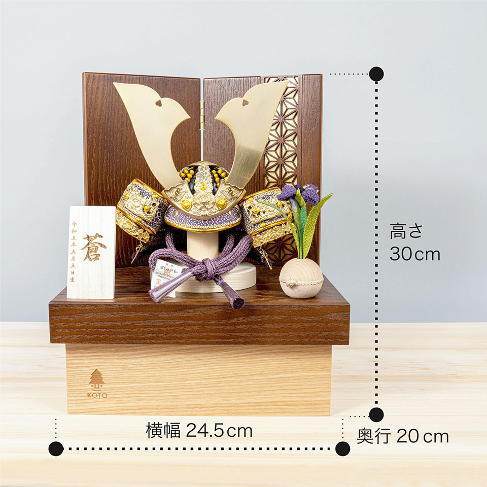 精巧な戦国兜の凛として強く美しい佇まいを天然木の優しいぬくもりが包み込む・・・まるで男の子の成長を温かく見守る家族の様に・・・そんなコンセプトから生まれた兜は、てづくり工房「木都」と甲冑工房「悠雅」のコラボレーションから生まれました。親しみやすく、お子様と一緒に飾れるKOTO×悠雅コラボ兜です。※ 細かい部品が含まれています。3歳未満のお子様は、保護者の方と一緒にお遊びください。選び抜いた素材と手間をかけた技法でつくる兜鉢選び抜いた素材と手間をかけた技法でつくる兜鉢KOTO×悠雅コラボ兜の兜鉢は、伝統的な本式の合せ鉢という技法でつくられています。本式の合せ鉢とは、戦国時代に頭部を守るために考案され、三角状の鉢部品を重ね合わせ、多数の星鋲をカシメる事で強度を高める技法です。選び抜いた素材と手間をかけた技法でつくる「庇」選び抜いた素材と手間をかけた技法でつくる「庇」兜の裏側にあたる庇は、甲州印伝革を使用し伝統的な技術で1つ1つ手作りで丁寧に作られています。選び抜いた素材と手間をかけた技法でつくる「小札」選び抜いた素材と手間をかけた技法でつくる「小札」小札は、細かい天然繊維である本物の絹糸を使用した正絹で結び合わせ繋げております。伝統的な兜をモダンに仕上げたシンプルなデザイン伝統的な兜をモダンに仕上げたシンプルなデザイン伝統的な製法で作られた兜に天然木の素材を活かしたシンプルなデザインの兜です。モダンでシンプルなデザインは、どんなお部屋の雰囲気にもピッタリ。コンパクトでちょうどいいサイズコンパクトでちょうどいいサイズ今どきのおうちに合わせたコンパクトなサイズに仕上げました。飾るスペースが狭くなりがちなマンションや子ども部屋にもぴったり。健やかな成長への願いを込めた麻の葉文様健やかな成長への願いを込めた麻の葉文様古来からの日本伝統の吉祥文様である麻の葉文様。麻の丈夫さ・成長の早さにあやかり、お子さまの健やかな成長への願いが込められています。お子さまの感性を育む天然木へのこだわりお子さまの感性を育む天然木へのこだわり素材には、タモ、ブナといった天然木を使用。お子さまへの一生に一度の贈り物だから、木都は自然素材の天然木にこだわり続けています。※ 生産時期により使用する素材が一部変更になる場合がございます。熟練の職人による確かな手仕事熟練の職人による確かな手仕事伝統工芸の技術を受け継ぐ日本国内の熟練の職人が、一つひとつ丁寧に手づくりしています。おしゃれなギフト包装でお届けしますおしゃれなギフト包装でお届けします和の雰囲気を感じさせる越前和紙のギフト用ラッピングでお届け。料金がわかるものもお入れしていないので、そのまま贈り物として利用できます。商品レビュー記入でもれなくもらえる天然木のミニ名前札プレゼント商品レビュー記入でもれなくもらえる天然木のミニ名前札プレゼントミニサイズのお名前札 (通常販売価格1,980円) をプレゼント♪商品到着後、商品レビューをご記入の上、商品と同梱のチラシ記載のQRコードから応募フォームへ必要事項をご入力ください。店舗よりレビュー特典を発送いたします。※ お名前札の生年月日の表記は和暦となります。(例:令和七年)商品のご注文へ収納方法とセット内容兜・鍬形・芯木・菖蒲・屏風・収納箱屏風は収納箱の上に乗せてダンボール箱におしまい下さい。素材:タモ重量:1,800g (兜のみ 250g)サイズ:W245mm × D200mm × H300mm梱包時:W290mm × D220mm × H145mm兜のみ:約 W150mm × D110mm × H150mm収納方法鍬形は専用袋に入れ、兜は風呂敷に包みます。その他の部品は不織布に入れ収納してください。兜置きの下台とポールは組み立ててご利用ください。注意事項甲冑について飾り付ける際に必ず手袋をご使用ください。錆や変色などの予防にもなります。本品の上には絶対に乗らないでください。本品または本品の部品は装飾品です。他の目的に使用しないで下さい。部品には小さなものがございます。お子様がお口に入れないようにご注意いください。木製品について色合いなど実際のものと写真とでは多少の誤差が生じる場合がございます。また、手作りであり天然木を使用している為、多少の仕様の変化や風合いがひとつひとつ異なります。あらかじめご了承ください。部品には小さなものがございます。お子様がお口に入れないようにご注意いください。菖蒲には針金が入っております。お好みで角度を調整して下さい。材質により刻印の濃淡に差が生じますが不良品ではございません。木製品である限り自然なこととご承知下さいませ。保管場所は変色やカビ、サビの原因になりますので湿気の少ない場所・直射日光の当たらない場所に保管してください。ご不明点がございましたら > お問い合わせページ からご相談ください。