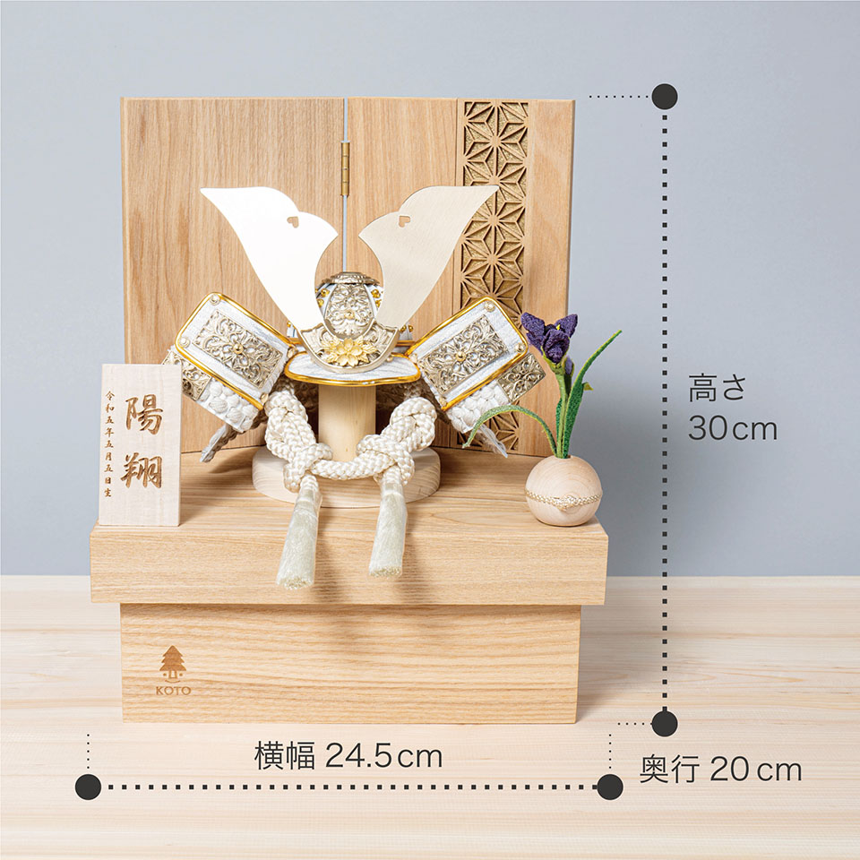 実際に手に取ると天然木の素材ならではの優しいぬくもりが伝わります。てづくり工房「木都」の職人が、伝統工芸の技術と天然木の素材を活かし、真心込めて1つ1つ丁寧につくりました。親しみやすく、お子様と一緒に飾れる「ことの兜」です。※ 細かい部品が含まれています。3歳未満のお子様は、保護者の方と一緒にお遊びください。コンパクトでちょうどいいサイズコンパクトでちょうどいいサイズ今どきのおうちに合わせたコンパクトなサイズに仕上げました。飾るスペースが狭くなりがちなマンションや子ども部屋にもぴったり。伝統的な兜をモダンに仕上げ白で統一されたシンプルなデザイン伝統的な兜をモダンに仕上げ白で統一されたシンプルなデザイン伝統的な製法で作られた兜に天然木の素材を活かしたシンプルなデザインの兜です。モダンで白に統一されたシンプルなデザインは、どんなお部屋の雰囲気にもピッタリ。選び抜いた素材と手間をかけた技法でつくる兜鉢選び抜いた素材と手間をかけた技法でつくる兜鉢ことの兜の兜鉢は、伝統的な本式の合せ鉢という技法でつくられています。本式の合せ鉢とは、戦国時代に頭部を守るために考案され、三角状の鉢部品を重ね合わせ、多数の星鋲をカシメる事で強度を高める技法です。健やかな成長への願いを込めた麻の葉文様健やかな成長への願いを込めた麻の葉文様古来からの日本伝統の吉祥文様である麻の葉文様。麻の丈夫さ・成長の早さにあやかり、お子さまの健やかな成長への願いが込められています。お子さまの感性を育む天然木へのこだわりお子さまの感性を育む天然木へのこだわり素材には、タモ、ブナといった天然木を使用。お子さまへの一生に一度の贈り物だから、木都は自然素材の天然木にこだわり続けています。※ 生産時期により使用する素材が一部変更になる場合がございます。熟練の職人による確かな手仕事熟練の職人による確かな手仕事伝統工芸の技術を受け継ぐ日本国内の熟練の職人が、一つひとつ丁寧に手づくりしています。おしゃれなギフト包装でお届けしますおしゃれなギフト包装でお届けします和の雰囲気を感じさせる越前和紙のギフト用ラッピングでお届け。料金がわかるものもお入れしていないので、そのまま贈り物として利用できます。商品レビュー記入でもれなくもらえる天然木のミニ名前札プレゼント商品レビュー記入でもれなくもらえる天然木のミニ名前札プレゼントミニサイズのお名前札 (通常販売価格1,980円) をプレゼント♪商品到着後、商品レビューをご記入の上、商品と同梱のチラシ記載のQRコードから応募フォームへ必要事項をご入力ください。店舗よりレビュー特典を発送いたします。※ お名前札の生年月日の表記は和暦となります。(例:令和七年)商品のご注文へ収納方法とセット内容兜・鍬形・芯木・菖蒲・屏風・収納箱屏風は収納箱の上に乗せてダンボール箱におしまい下さい。素材:タモ重量:1,750g (兜のみ 200g)サイズ:W245mm × D200mm × H300mm梱包時:W290mm × D220mm × H145mm兜のみ:約 W200mm × D160mm × H150mm注意事項本品は、金属をふんだんに使用しております。取り扱われる方の人体にすり傷、切り傷、刺傷を及ぼす場合がございますので、左記注意事項をよく読んでお取り扱い下さい。甲冑について飾り付ける際に必ず手袋をご使用ください。錆や変色などの予防にもなります。本品の上には絶対に乗らないでください。本品または本品の部品は装飾品です。他の目的に使用しないで下さい。部品には小さなものがございます。お子様がお口に入れないようにご注意いください。木製品について色合いなど実際のものと写真とでは多少の誤差が生じる場合がございます。また、手作りであり天然木を使用している為、多少の仕様の変化や風合いがひとつひとつ異なります。あらかじめご了承ください。部品には小さなものがございます。お子様がお口に入れないようにご注意いください。菖蒲には針金が入っております。お好みで角度を調整して下さい。材質により刻印の濃淡に差が生じますが不良品ではございません。木製品である限り自然なこととご承知下さいませ。保管場所は変色やカビ、サビの原因になりますので湿気の少ない場所・直射日光の当たらない場所に保管してください。ご不明点がございましたら > お問い合わせページ からご相談ください。