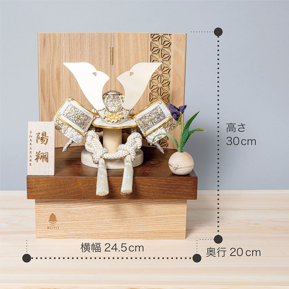 実際に手に取ると天然木の素材ならではの優しいぬくもりが伝わります。てづくり工房「木都」の職人が、伝統工芸の技術と天然木の素材を活かし、真心込めて1つ1つ丁寧につくりました。親しみやすく、お子様と一緒に飾れる「ことの兜」です。※ 細かい部品が含まれています。3歳未満のお子様は、保護者の方と一緒にお遊びください。コンパクトでちょうどいいサイズコンパクトでちょうどいいサイズ今どきのおうちに合わせたコンパクトなサイズに仕上げました。飾るスペースが狭くなりがちなマンションや子ども部屋にもぴったり。伝統的な兜をモダンに仕上げ白で統一されたシンプルなデザイン伝統的な兜をモダンに仕上げ白で統一されたシンプルなデザイン伝統的な製法で作られた兜に天然木の素材を活かしたシンプルなデザインの兜です。モダンで白に統一されたシンプルなデザインは、どんなお部屋の雰囲気にもピッタリ。選び抜いた素材と手間をかけた技法でつくる兜鉢選び抜いた素材と手間をかけた技法でつくる兜鉢ことの兜の兜鉢は、伝統的な本式の合せ鉢という技法でつくられています。本式の合せ鉢とは、戦国時代に頭部を守るために考案され、三角状の鉢部品を重ね合わせ、多数の星鋲をカシメる事で強度を高める技法です。健やかな成長への願いを込めた麻の葉文様健やかな成長への願いを込めた麻の葉文様古来からの日本伝統の吉祥文様である麻の葉文様。麻の丈夫さ・成長の早さにあやかり、お子さまの健やかな成長への願いが込められています。お子さまの感性を育む天然木へのこだわりお子さまの感性を育む天然木へのこだわり素材には、タモ、ブナといった天然木を使用。お子さまへの一生に一度の贈り物だから、木都は自然素材の天然木にこだわり続けています。※ 生産時期により使用する素材が一部変更になる場合がございます。熟練の職人による確かな手仕事熟練の職人による確かな手仕事伝統工芸の技術を受け継ぐ日本国内の熟練の職人が、一つひとつ丁寧に手づくりしています。おしゃれなギフト包装でお届けしますおしゃれなギフト包装でお届けします和の雰囲気を感じさせる越前和紙のギフト用ラッピングでお届け。料金がわかるものもお入れしていないので、そのまま贈り物として利用できます。商品レビュー記入でもれなくもらえる天然木のミニ名前札プレゼント商品レビュー記入でもれなくもらえる天然木のミニ名前札プレゼントミニサイズのお名前札 (通常販売価格1,980円) をプレゼント♪商品到着後、商品レビューをご記入の上、商品と同梱のチラシ記載のQRコードから応募フォームへ必要事項をご入力ください。店舗よりレビュー特典を発送いたします。※ お名前札の生年月日の表記は和暦となります。(例:令和七年)商品のご注文へ収納方法とセット内容兜・鍬形・芯木・菖蒲・屏風・収納箱屏風は収納箱の上に乗せてダンボール箱におしまい下さい。素材:タモ重量:1,750g (兜のみ 200g)サイズ:W245mm × D200mm × H300mm梱包時:W290mm × D220mm × H145mm兜のみ:約 W200mm × D160mm × H150mm注意事項本品は、金属をふんだんに使用しております。取り扱われる方の人体にすり傷、切り傷、刺傷を及ぼす場合がございますので、左記注意事項をよく読んでお取り扱い下さい。甲冑について飾り付ける際に必ず手袋をご使用ください。錆や変色などの予防にもなります。本品の上には絶対に乗らないでください。本品または本品の部品は装飾品です。他の目的に使用しないで下さい。部品には小さなものがございます。お子様がお口に入れないようにご注意いください。木製品について色合いなど実際のものと写真とでは多少の誤差が生じる場合がございます。また、手作りであり天然木を使用している為、多少の仕様の変化や風合いがひとつひとつ異なります。あらかじめご了承ください。部品には小さなものがございます。お子様がお口に入れないようにご注意いください。菖蒲には針金が入っております。お好みで角度を調整して下さい。材質により刻印の濃淡に差が生じますが不良品ではございません。木製品である限り自然なこととご承知下さいませ。保管場所は変色やカビ、サビの原因になりますので湿気の少ない場所・直射日光の当たらない場所に保管してください。ご不明点がございましたら > お問い合わせページ からご相談ください。