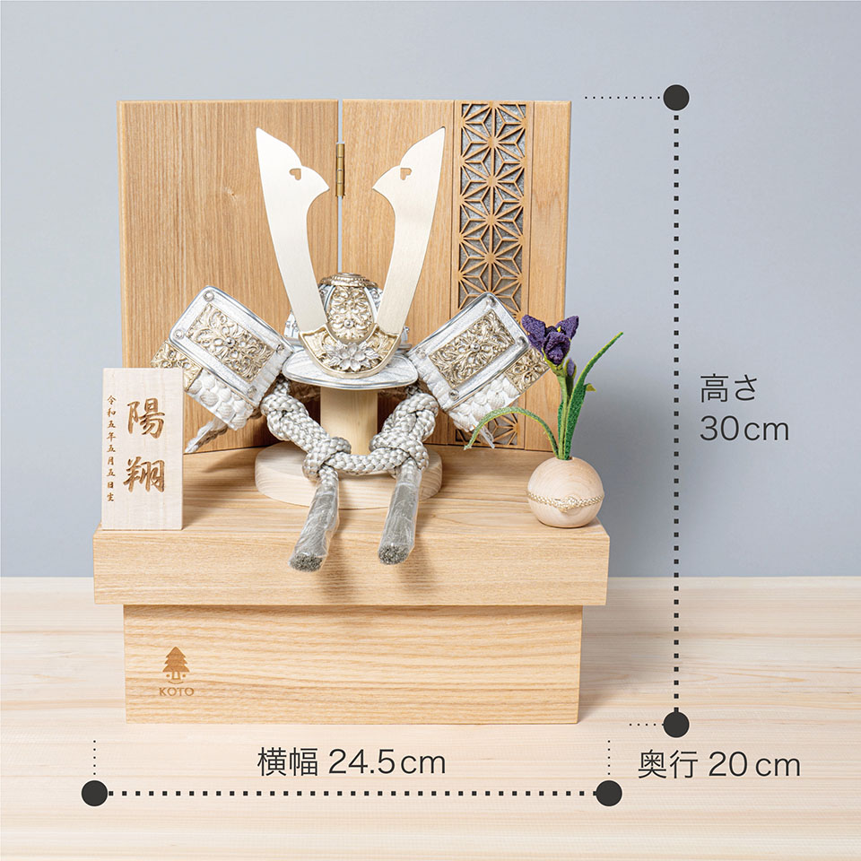 実際に手に取ると天然木の素材ならではの優しいぬくもりが伝わります。てづくり工房「木都」の職人が、伝統工芸の技術と天然木の素材を活かし、真心込めて1つ1つ丁寧につくりました。親しみやすく、お子様と一緒に飾れる「ことの兜」です。※ 細かい部品が含まれています。3歳未満のお子様は、保護者の方と一緒にお遊びください。コンパクトでちょうどいいサイズコンパクトでちょうどいいサイズ今どきのおうちに合わせたコンパクトなサイズに仕上げました。飾るスペースが狭くなりがちなマンションや子ども部屋にもぴったり。伝統的な兜をモダンに仕上げ白で統一されたシンプルなデザイン伝統的な兜をモダンに仕上げ白で統一されたシンプルなデザイン伝統的な製法で作られた兜に天然木の素材を活かしたシンプルなデザインの兜です。モダンで白に統一されたシンプルなデザインは、どんなお部屋の雰囲気にもピッタリ。選び抜いた素材と手間をかけた技法でつくる兜鉢選び抜いた素材と手間をかけた技法でつくる兜鉢ことの兜の兜鉢は、伝統的な本式の合せ鉢という技法でつくられています。本式の合せ鉢とは、戦国時代に頭部を守るために考案され、三角状の鉢部品を重ね合わせ、多数の星鋲をカシメる事で強度を高める技法です。お子さまの感性を育む天然木へのこだわりお子さまの感性を育む天然木へのこだわり素材には、タモ、ブナといった天然木を使用。お子さまへの一生に一度の贈り物だから、木都は自然素材の天然木にこだわり続けています。※ 生産時期により使用する素材が一部変更になる場合がございます。熟練の職人による確かな手仕事熟練の職人による確かな手仕事伝統工芸の技術を受け継ぐ日本国内の熟練の職人が、一つひとつ丁寧に手づくりしています。おしゃれなギフト包装でお届けしますおしゃれなギフト包装でお届けします和の雰囲気を感じさせる越前和紙のギフト用ラッピングでお届け。料金がわかるものもお入れしていないので、そのまま贈り物として利用できます。商品レビュー記入でもれなくもらえる天然木のミニ名前札プレゼント商品レビュー記入でもれなくもらえる天然木のミニ名前札プレゼントミニサイズのお名前札 (通常販売価格1,980円) をプレゼント♪商品到着後、商品レビューをご記入の上、商品と同梱のチラシ記載のQRコードから応募フォームへ必要事項をご入力ください。店舗よりレビュー特典を発送いたします。※ お名前札の生年月日の表記は和暦となります。(例:令和七年)商品のご注文へ収納方法とセット内容兜・鍬形・芯木・菖蒲・衝立・平台素材:タモ重量:1,880g (兜のみ 280g)サイズ:W245mm × D200mm × H300mm梱包時:W290mm × D220mm × H145mm兜のみ:約 W200mm × D160mm × H170mm注意事項本品は、金属をふんだんに使用しております。取り扱われる方の人体にすり傷、切り傷、刺傷を及ぼす場合がございますので、左記注意事項をよく読んでお取り扱い下さい。甲冑について飾り付ける際に必ず手袋をご使用ください。錆や変色などの予防にもなります。本品の上には絶対に乗らないでください。本品または本品の部品は装飾品です。他の目的に使用しないで下さい。部品には小さなものがございます。お子様がお口に入れないようにご注意いください。木製品について色合いなど実際のものと写真とでは多少の誤差が生じる場合がございます。また、手作りであり天然木を使用している為、多少の仕様の変化や風合いがひとつひとつ異なります。あらかじめご了承ください。部品には小さなものがございます。お子様がお口に入れないようにご注意いください。菖蒲には針金が入っております。お好みで角度を調整して下さい。材質により刻印の濃淡に差が生じますが不良品ではございません。木製品である限り自然なこととご承知下さいませ。保管場所は変色やカビ、サビの原因になりますので湿気の少ない場所・直射日光の当たらない場所に保管してください。ご不明点がございましたら > お問い合わせページ からご相談ください。
