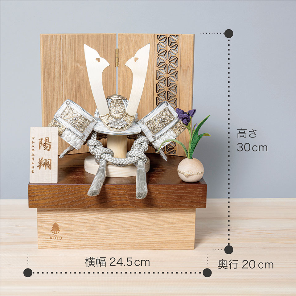 実際に手に取ると天然木の素材ならではの優しいぬくもりが伝わります。てづくり工房「木都」の職人が、伝統工芸の技術と天然木の素材を活かし、真心込めて1つ1つ丁寧につくりました。親しみやすく、お子様と一緒に飾れる「ことの兜」です。※ 細かい部品が含まれています。3歳未満のお子様は、保護者の方と一緒にお遊びください。コンパクトでちょうどいいサイズコンパクトでちょうどいいサイズ今どきのおうちに合わせたコンパクトなサイズに仕上げました。飾るスペースが狭くなりがちなマンションや子ども部屋にもぴったり。伝統的な兜をモダンに仕上げ白で統一されたシンプルなデザイン伝統的な兜をモダンに仕上げ白で統一されたシンプルなデザイン伝統的な製法で作られた兜に天然木の素材を活かしたシンプルなデザインの兜です。モダンで白に統一されたシンプルなデザインは、どんなお部屋の雰囲気にもピッタリ。選び抜いた素材と手間をかけた技法でつくる兜鉢選び抜いた素材と手間をかけた技法でつくる兜鉢ことの兜の兜鉢は、伝統的な本式の合せ鉢という技法でつくられています。本式の合せ鉢とは、戦国時代に頭部を守るために考案され、三角状の鉢部品を重ね合わせ、多数の星鋲をカシメる事で強度を高める技法です。お子さまの感性を育む天然木へのこだわりお子さまの感性を育む天然木へのこだわり素材には、タモ、ブナといった天然木を使用。お子さまへの一生に一度の贈り物だから、木都は自然素材の天然木にこだわり続けています。※ 生産時期により使用する素材が一部変更になる場合がございます。熟練の職人による確かな手仕事熟練の職人による確かな手仕事伝統工芸の技術を受け継ぐ日本国内の熟練の職人が、一つひとつ丁寧に手づくりしています。おしゃれなギフト包装でお届けしますおしゃれなギフト包装でお届けします和の雰囲気を感じさせる越前和紙のギフト用ラッピングでお届け。料金がわかるものもお入れしていないので、そのまま贈り物として利用できます。商品レビュー記入でもれなくもらえる天然木のミニ名前札プレゼント商品レビュー記入でもれなくもらえる天然木のミニ名前札プレゼントミニサイズのお名前札 (通常販売価格1,980円) をプレゼント♪商品到着後、商品レビューをご記入の上、商品と同梱のチラシ記載のQRコードから応募フォームへ必要事項をご入力ください。店舗よりレビュー特典を発送いたします。※ お名前札の生年月日の表記は和暦となります。(例:令和七年)商品のご注文へ収納方法とセット内容兜・鍬形・芯木・菖蒲・衝立・平台素材:タモ重量:1,880g (兜のみ 280g)サイズ:W245mm × D200mm × H300mm梱包時:W290mm × D220mm × H145mm兜のみ:約 W200mm × D160mm × H170mm注意事項本品は、金属をふんだんに使用しております。取り扱われる方の人体にすり傷、切り傷、刺傷を及ぼす場合がございますので、左記注意事項をよく読んでお取り扱い下さい。甲冑について飾り付ける際に必ず手袋をご使用ください。錆や変色などの予防にもなります。本品の上には絶対に乗らないでください。本品または本品の部品は装飾品です。他の目的に使用しないで下さい。部品には小さなものがございます。お子様がお口に入れないようにご注意いください。木製品について色合いなど実際のものと写真とでは多少の誤差が生じる場合がございます。また、手作りであり天然木を使用している為、多少の仕様の変化や風合いがひとつひとつ異なります。あらかじめご了承ください。部品には小さなものがございます。お子様がお口に入れないようにご注意いください。菖蒲には針金が入っております。お好みで角度を調整して下さい。材質により刻印の濃淡に差が生じますが不良品ではございません。木製品である限り自然なこととご承知下さいませ。保管場所は変色やカビ、サビの原因になりますので湿気の少ない場所・直射日光の当たらない場所に保管してください。ご不明点がございましたら > お問い合わせページ からご相談ください。