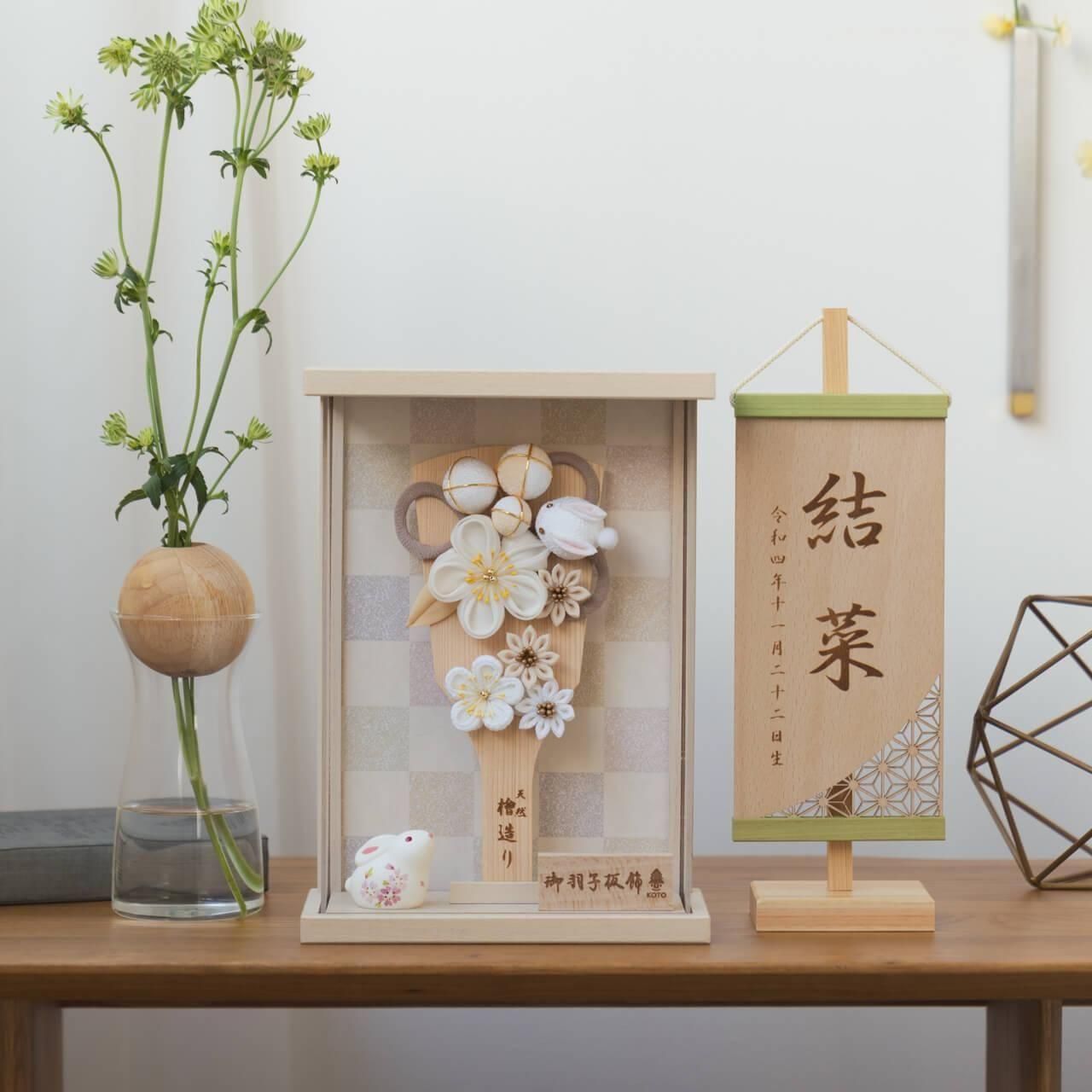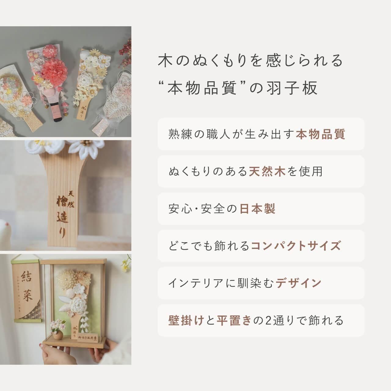 女の子の無病息災のお守りとして飾られる羽子板。熟練の職人が、伝統工芸の技術と天然木の素材を活かし、心を込めて一つひとつ丁寧につくりました。コンパクトでちょうどいいサイズコンパクトでちょうどいいサイズ今どきのおうちに合わせたコンパクトなサイズに仕上げました。飾るスペースが狭くなりがちなマンションや子ども部屋にもぴったり。インテリアに溶け込むナチュラルなデザインインテリアに溶け込むナチュラルなデザイン天然木の素材を活かしたシンプルなデザインだから、お部屋の雰囲気にもピッタリ。平置きと壁掛けの2通りで飾れる平置きと壁掛けの2通りで飾れるケースの背面には紐が付属しております。そのまま置いても、壁に掛けても飾れる2WAY仕様です。取り外せる前面アクリル板取り外せる前面アクリル板お客さまの声をもとにケース前面のアクリル板を取り外し可能なデザインにリニューアル。天然木ならではのぬくもりがより伝わるようになりました。日本の伝統工芸 つまみ細工日本の伝統工芸 つまみ細工江戸時代から伝わる日本の伝統工芸で、小さな布をつまんで様々なモチーフの形を作り、装飾品として仕上げる技法です。子供の健やかな成長を願う うさぎ子供の健やかな成長を願う うさぎ力強く跳ねるうさぎは、邪気を払い、幸福を運ぶとも言われます。コロンとしたシルエットが愛らしいお子様に人気のデザインです。お子さまの感性を育む天然木へのこだわりお子さまの感性を育む天然木へのこだわり素材には、富士山麓の無垢のヒノキやタモ、ブナといった天然木を使用。お子さまへの一生に一度の贈り物だから、木都は自然素材の天然木にこだわり続けています。※ 生産時期により使用する素材が一部変更になる場合がございます。天然木が織りなす唯一無二の風合い天然木が織りなす唯一無二の風合い様々な種類の木材を組み合わせることで、それぞれの良さを活かした羽子板に仕上げました。タモ均一で美しい木目が特徴。弾力性と強度を持ち合わせており、耐久性があります。ブナ耐久性が高く長寿のため、家具によく用いられます。明るい色調でインテリアによく馴染みます。桧ひのき特有の香りにはリラックス効果や抗菌、防虫作用があります。湿気にも強く、耐久性に優れています。桐優れた抗菌・防腐効果をもつ成分を含み、高級家具に多く用いられています。上品さのある柔らかな光沢が特徴。熟練の職人による確かな手仕事熟練の職人による確かな手仕事伝統工芸の技術を受け継ぐ日本国内の熟練の職人が、一つひとつ丁寧に手づくりしています。おしゃれなギフト包装でお届けしますおしゃれなギフト包装でお届けします和の雰囲気を感じさせる越前和紙のギフト用ラッピングでお届け。料金がわかるものもお入れしていないので、そのまま贈り物として利用できます。収納方法とセット内容羽子板素材:桧重量:660gサイズ:W180mm × D90mm × H260mm梱包時:W195mm × D100mm × H280mm※ 本商品に名前旗は付属しておりません。別途お買い求めください。注意事項色合いなど実際のものと写真とでは多少の誤差が生じる場合がございます。また、手作りであり天然木を使用している為、多少の仕様の変化や風合いがひとつひとつ異なります。あらかじめご了承ください。材質により木の刻印の濃淡に差が生じますが不良品ではございません。木製品である限り自然なこととご承知下さいませ。保管場所は変色やカビ、サビの原因になりますので湿気の少ない場所・直射日光の当たらない場所に保管してください。本商品に名前旗は付属しておりません。別途お買い求めください。ご不明点がございましたら > お問い合わせページ からご相談ください。 型番 0111 ことの羽子板 うさぎ BEケース ¥28,600税込 送料無料(一部離島を除く) 行燈別売 ¥11,000 あわせて購入 名前旗 雛人形や五月人形とご一緒に コンパクトサイズの雛人形や五月人形と一緒に飾るのにぴったりな名前旗です。5つのカラーと3種類のデザインをお好みでお選びいただけます。 商品情報へ 行燈付き商品の場合は行燈に名入れいたします。ご注文の際は備考欄にお名前・フリガナ・生年月日をご記入ください。空欄の場合は柄のみでお作りさせて頂きます。 個 カートに追加 特定商取引法に基づく表記(返品等) のりこばあば 50代 女性 2024/11/29 21:33:09 うさぎ 2023年の卯年生まれの孫に贈りたくて 昨年検索しておりましたが 完売しておりまして 一年越しに注文させて頂きました。一つ一つ心を込めて手作りして下さっているのが伝わる商品で 娘家族も大変喜んでおります。コンパクトに納められていますのも有り難いです。そのケースの中に素敵に飾られた羽子板が可愛くて見事です。ありがとうございます。 レビューを見る 1 レビューを投稿 関連記事 あなたにおすすめの商品 ことの木製ひな人形 5人飾り 収納 ¥48,000 税込 ことのオリジナル雑貨 名前旗 ¥11,200 税込 ことのオリジナル雑貨 名前羽子板 LED ¥7,500 税込 { "