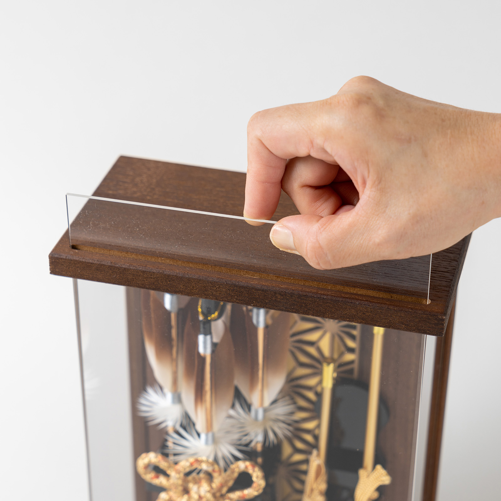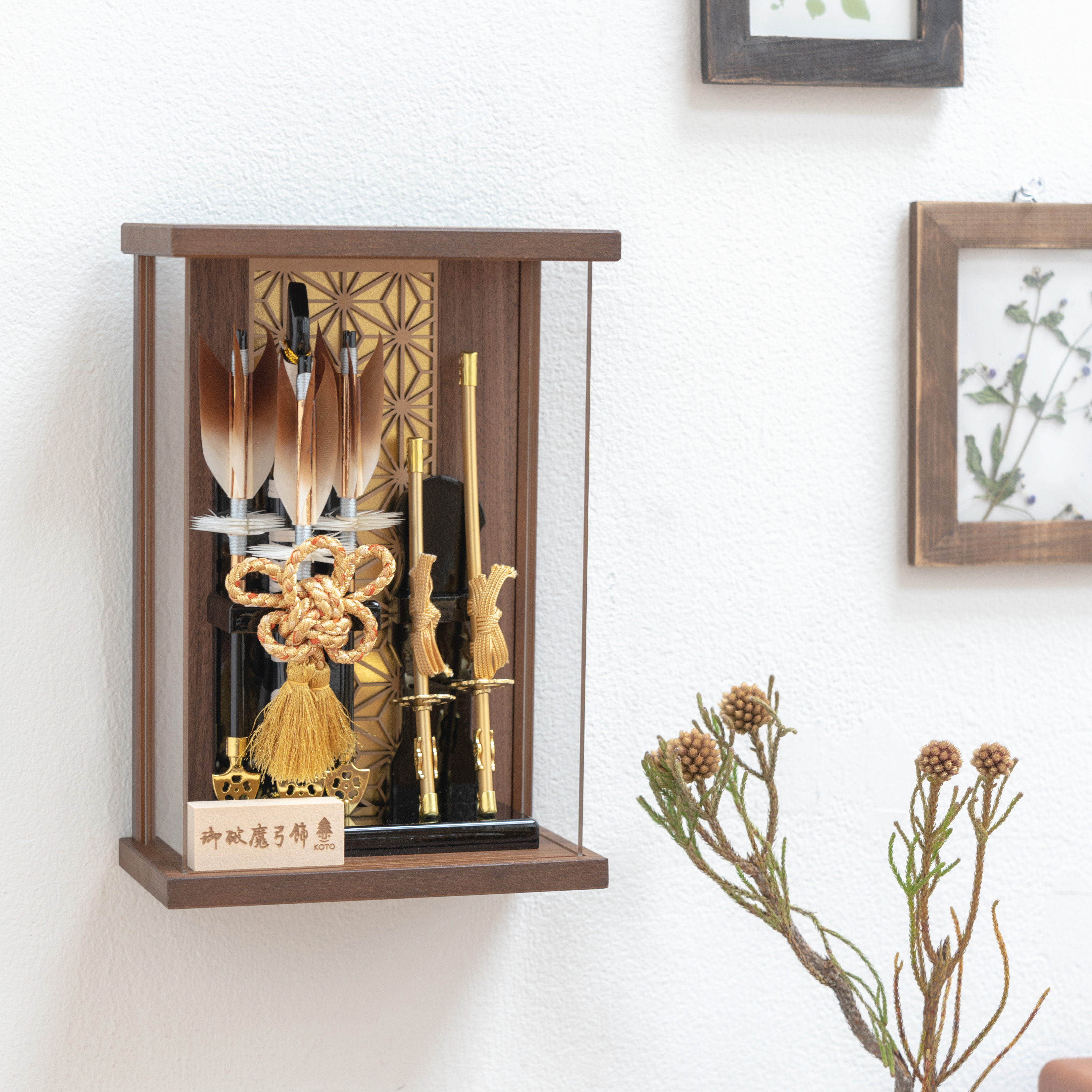 破魔弓は、魔よけ、厄払いのお守りです。男の子の元気な成長を願いお正月の縁起の祝い物となっています。古来からの行事であった新春の年占いや厄払いがその始まりです。男の子が弓矢で的を射て年占いをしたのがのちに破魔弓となりました。そんな破魔弓をてづくり工房「木都」の職人が、伝統工芸の技術と天然木の素材を活かし、真心込めて1つ1つ丁寧につくりました。コンパクトでちょうどいいサイズコンパクトでちょうどいいサイズ今どきのおうちに合わせたコンパクトなサイズに仕上げました。飾るスペースが狭くなりがちなマンションや子ども部屋にもぴったり。お部屋のイメージに調和するデザインお部屋のイメージに調和するデザイン天然木の素材を活かしたシンプルなデザインだから、お部屋の雰囲気にもピッタリ。壁掛け対応壁掛け対応破魔弓の背面には紐が付属しております。そのまま置いても、壁に掛けても飾れます。新しくなったケース新しくなったケースお客様の声をもとにケース前面のアクリル板を取り外し可能なデザインにリニューアルしました。天然木の素材ならではの温もりをより深く感じることができます。男の子の成長を願って男の子の成長を願って破魔弓には、矢を弓で「射る」という特性から、チャンスを射止めることにご利益があると言われています。四本の矢は四神 (東の青龍・西の白虎・南の朱雀・北の玄武) を表しており、東西南北からの厄災に備えるという意味が込められています。日本の伝統工芸 天然羽根日本の伝統工芸 天然羽根ことの破魔弓には伝統的な天然羽根が使用されています。天然羽根は軽くて、しなやかな素材のため古くから高価な伝統工芸品の素材として重宝されています。日本の伝統工芸 梅結び日本の伝統工芸 梅結び『固く結ばれた絆』『魔除け』『運命向上』の3つの意味が込められています。寒い季節に先駆けて花を咲かせる梅にちなんで、潔さや開運などの意味を持つ縁起の良い結び方です。日本の伝統柄 麻の葉日本の伝統柄 麻の葉模様は、麻の葉と呼ばれています。麻の丈夫さ・成長の早さにあやかり、子供の健やかな成長の願いが込められています。お子さまの感性を育む天然木へのこだわりお子さまの感性を育む天然木へのこだわり素材には、タモ、竹といった天然木を使用。お子さまへの一生に一度の贈り物だから、木都は自然素材の天然木にこだわり続けています。※ 生産時期により使用する素材が一部変更になる場合がございます。天然木が織りなす唯一無二の風合い天然木が織りなす唯一無二の風合い様々な種類の木材を組み合わせることで、それぞれの良さを活かした破魔弓に仕上げました。タモ均一で美しい木目が特徴。弾力性と強度を持ち合わせており、耐久性があります。桧日本の伝統的な最高級木材として知られる桧。特有の香りにはリラックス効果や抗菌、防虫作用があります。 湿気にも強く、耐久性に優れています。竹軽量でありながら非常に高い強度を持っています。表面は滑らかで光沢があり、自然な美しさを放ちます。まゆみ硬さとしなやかさを持ち合わせ、弓の素材として使われます。均一で細かい木目の美しさが特徴です。熟練の職人による確かな手仕事熟練の職人による確かな手仕事伝統工芸の技術を受け継ぐ日本国内の熟練の職人が、一つひとつ丁寧に手づくりしています。おしゃれなギフト包装でお届けしますおしゃれなギフト包装でお届けします和の雰囲気を感じさせる越前和紙のギフト用ラッピングでお届け。料金がわかるものもお入れしていないので、そのまま贈り物として利用できます。収納方法とセット内容破魔弓素材:タモ・竹重量:800g サイズ:W180mm × D90mm × H260mm梱包時:W195mm × D100mm × H280mm※ 本商品に名前旗は付属しておりません。別途お買い求めください。注意事項色合いなど実際のものと写真とでは多少の誤差が生じる場合がございます。また、手作りであり天然木を使用している為、多少の仕様の変化や風合いがひとつひとつ異なります。あらかじめご了承ください。材質により木の刻印の濃淡に差が生じますが不良品ではございません。木製品である限り自然なこととご承知下さいませ。保管場所は変色やカビ、サビの原因になりますので湿気の少ない場所・直射日光の当たらない場所に保管してください。本商品に名前旗は付属しておりません。別途お買い求めください。ご不明点がございましたら > お問い合わせページ からご相談ください。 型番 0204-1 ことの破魔弓 つき 麻の葉Bケース ¥28,000税込 送料無料(一部離島を除く) 行燈別売 ¥11,000 あわせて購入 名前旗 雛人形や五月人形とご一緒に コンパクトサイズの雛人形や五月人形と一緒に飾るのにぴったりな名前旗です。5つのカラーと3種類のデザインをお好みでお選びいただけます。 商品情報へ 行燈付き商品の場合は行燈に名入れいたします。ご注文の際は備考欄にお名前・フリガナ・生年月日をご記入ください。空欄の場