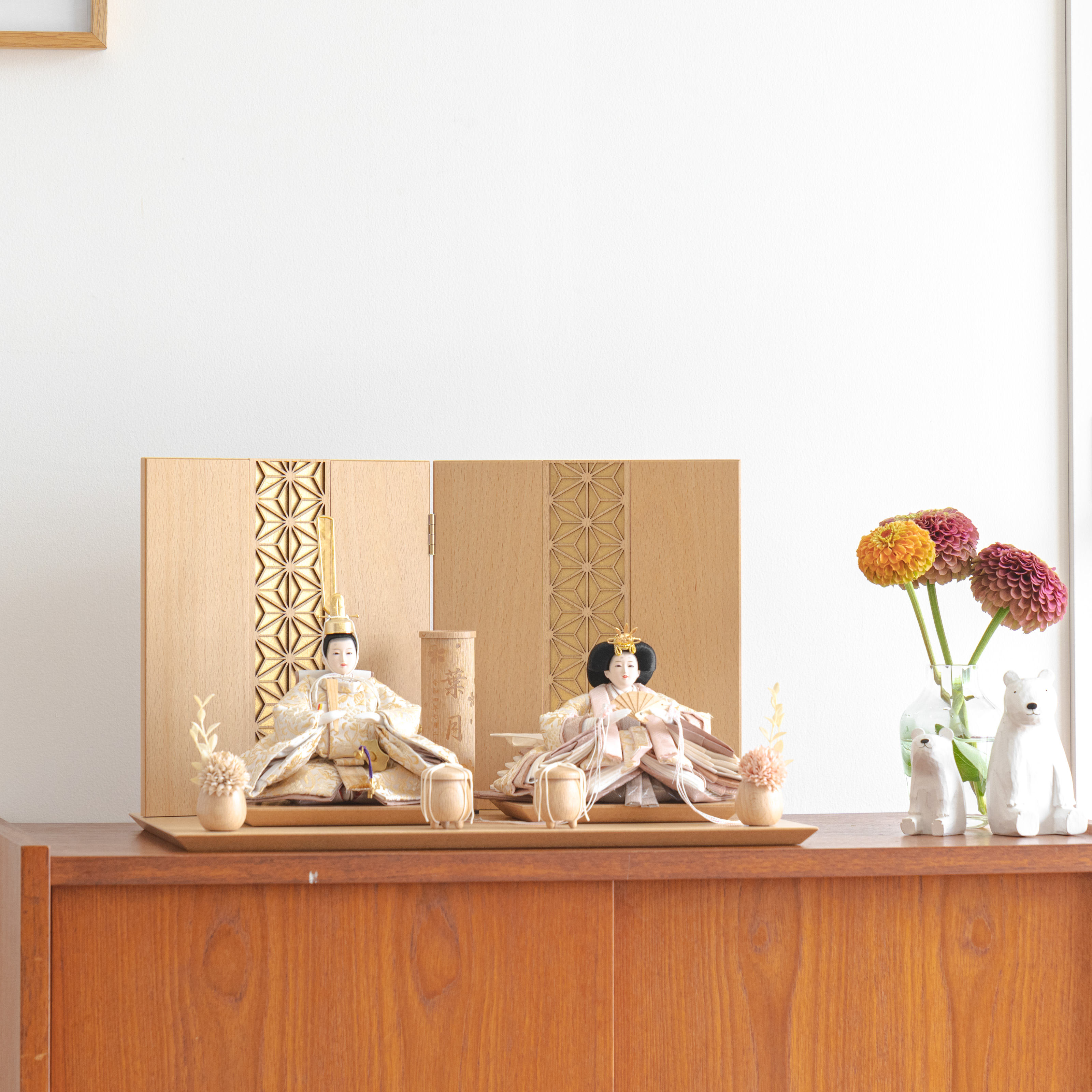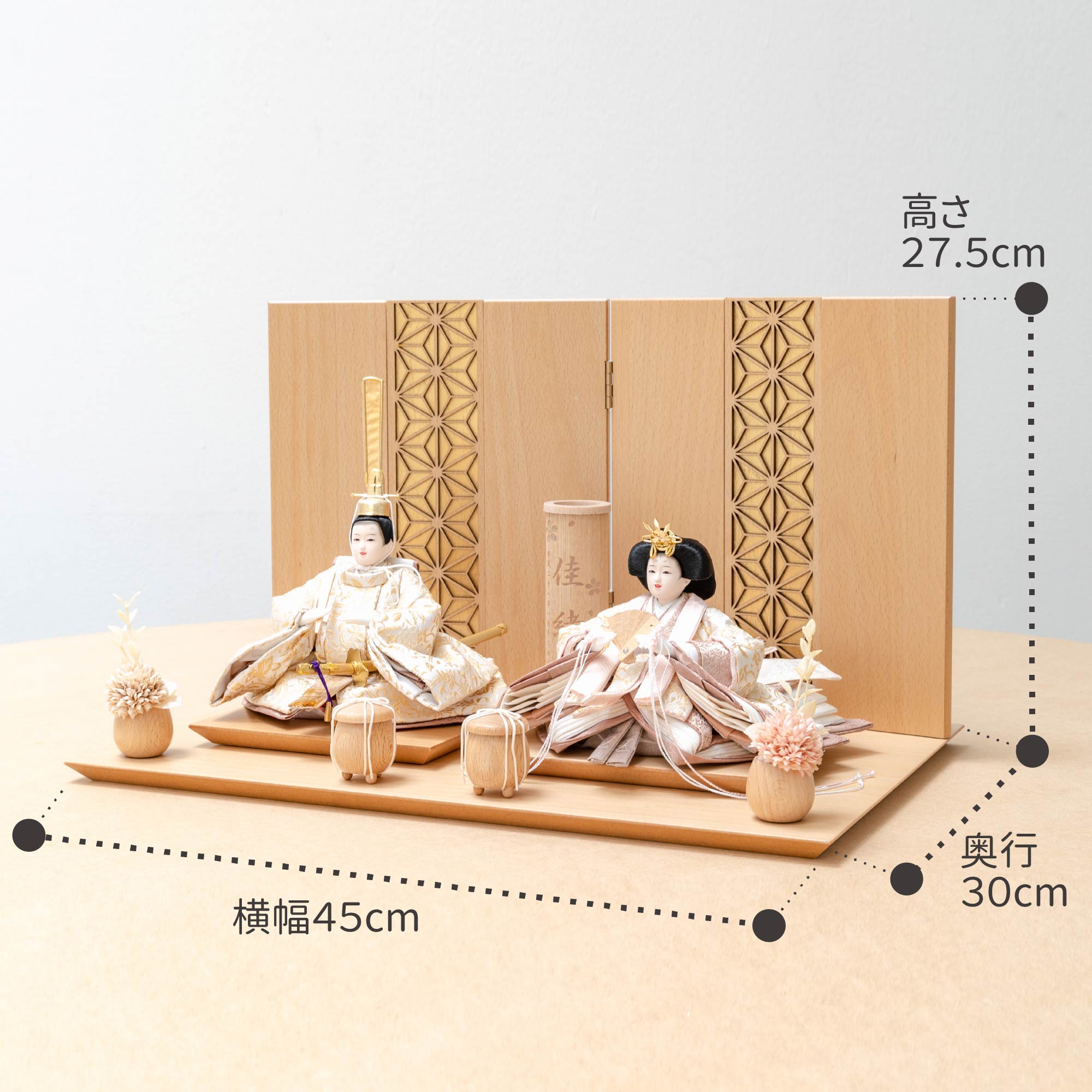 精巧な凛として美しい佇まいを天然木の優しいぬくもりが包み込む・・・まるで女の子の成長を温かく見守る家族の様に・・・そんなコンセプトから生まれた、親しみやすく、お子様と一緒に飾れる「ことの雛人形」です。コンパクトでちょうどいいサイズコンパクトでちょうどいいサイズ今どきのおうちに合わせたコンパクトなサイズに仕上げました。飾るスペースが狭くなりがちなマンションや子ども部屋にもぴったり。お部屋のイメージに調和するデザインお部屋のイメージに調和するデザイン天然木の素材を活かしたシンプルなデザインだから、お部屋の雰囲気にもピッタリ。お衣装へのこだわり 〜正絹 二重蔓牡丹文〜お衣装へのこだわり 〜正絹 二重蔓牡丹文〜日本の伝統的な文様の一つである、牡丹の花と唐草模様が組み合わさった「牡丹唐草」。牡丹には「不老不死」と「不老長寿」という意味が込められており、また、華やかで美しい牡丹の花は美と富の象徴とされています。そんな牡丹唐草の柄と小さいながらも光沢のある生地を合わせ、可愛らしさと高級感のある雛人形に仕上げました。手作りへのこだわり〜裂地(きれじ)の裁断手作りへのこだわり〜裂地(きれじ)の裁断和紙で衣裳の各種型紙を作り、へり部分にのみ糊をつけ、裂地裏面に貼り付けます。型紙に沿って裁断して衣裳部品を作っていきます。手作りへのこだわり〜縫製手作りへのこだわり〜縫製姫の十二単の唐衣(からぎぬ)・五衣(いつつぎぬ)・単衣(ひとえ)・裾、殿の着物・裾・中袖等、数多くの衣裳部品をミシン、または手縫いで細やかな部分まで縫い合わせ、折り込み仕上げていきます。手作りへのこだわり〜着付け・振付け手作りへのこだわり〜着付け・振付け仕上がった衣裳は両腕を後方に曲げて羽織らせるようにして着付けます。次にそれぞれの人形の形に振付けます。腕を曲げる角度や手の位置などで全体のバランスを取ります。手作りへのこだわり〜頭差し手作りへのこだわり〜頭差し頭さしは最終の人形検品を兼ねて行われます。包まれた顔紙を外し、汚れ等無いことを確認します。頭と衣紋の中心線が一直線になるように差し込みます。ことのお雛様ことのお雛様お雛様の顔は時代とともに人気のお顔があります。ことのお雛様のお顔は時代に左右されない普遍的なシンプルで可愛らしいお顔となっています。健やかな成長への願いを込めた 麻の葉文様健やかな成長への願いを込めた 麻の葉文様古来からの日本伝統の吉祥文様である麻の葉文様。麻の丈夫さ・成長の早さにあやかり、お子さまの健やかな成長への願いが込められています。お子さまの感性を育む天然木へのこだわりお子さまの感性を育む天然木へのこだわり素材には、タモ、ブナといった天然木を使用。お子さまへの一生に一度の贈り物だから、木都は自然素材の天然木にこだわり続けています。※ 生産時期により使用する素材が一部変更になる場合がございます。熟練の職人による確かな手仕事熟練の職人による確かな手仕事伝統工芸の技術を受け継ぐ日本国内の熟練の職人が、一つひとつ丁寧に手づくりしています。おしゃれなギフト包装でお届けしますおしゃれなギフト包装でお届けします和の雰囲気を感じさせる越前和紙のギフト用ラッピングでお届け。料金がわかるものもお入れしていないので、そのまま贈り物として利用できます。商品レビュー記入でもれなくもらえる天然木のミニ名前札プレゼント商品レビュー記入でもれなくもらえる天然木のミニ名前札プレゼントミニサイズのお名前札 (通常販売価格1,980円) をプレゼント♪商品到着後、商品レビューをご記入の上、商品と同梱のチラシ記載のQRコードから応募フォームへ必要事項をご入力ください。店舗よりレビュー特典を発送いたします。※ お名前札の生年月日の表記は和暦となります。(例:令和七年)商品のご注文へ収納方法とセット内容お内裏様・お雛様・屏風・平台・親王台・人形小道具・貝桶×2・花飾り×2屏風は平台と同様に個別でダンボール箱におしまい下さい。親王台は屏風のダンボールに入れます。素材:ブナ重量:2,900g サイズ:W450mm × D300mm × H275mm梱包時:W465mm × D315mm × H205mm殿:約 W185mm × D165mm × H215mm姫:約 W220mm × D190mm × H125mm注意事項色合いなど実際のものと写真とでは多少の誤差が生じる場合がございます。また、手作りであり天然木を使用している為、多少の仕様の変化や風合いがひとつひとつ異なります。あらかじめご了承ください。部品には小さなものがございます。お子様がお口に入れないようにご注意ください。材質により木の刻印の濃淡に差が生じますが不良品ではございません。木製品である限り自然なこととご承知下さいませ。保管場所は変色やカビ、サビの原因になりますので湿気の少ない場所・直射日光の当たらない場所に保管してください。雄雛の正面にあります飾り帯のビニールは外さないでください。本商品に行燈は付属しておりません。別途お買い求