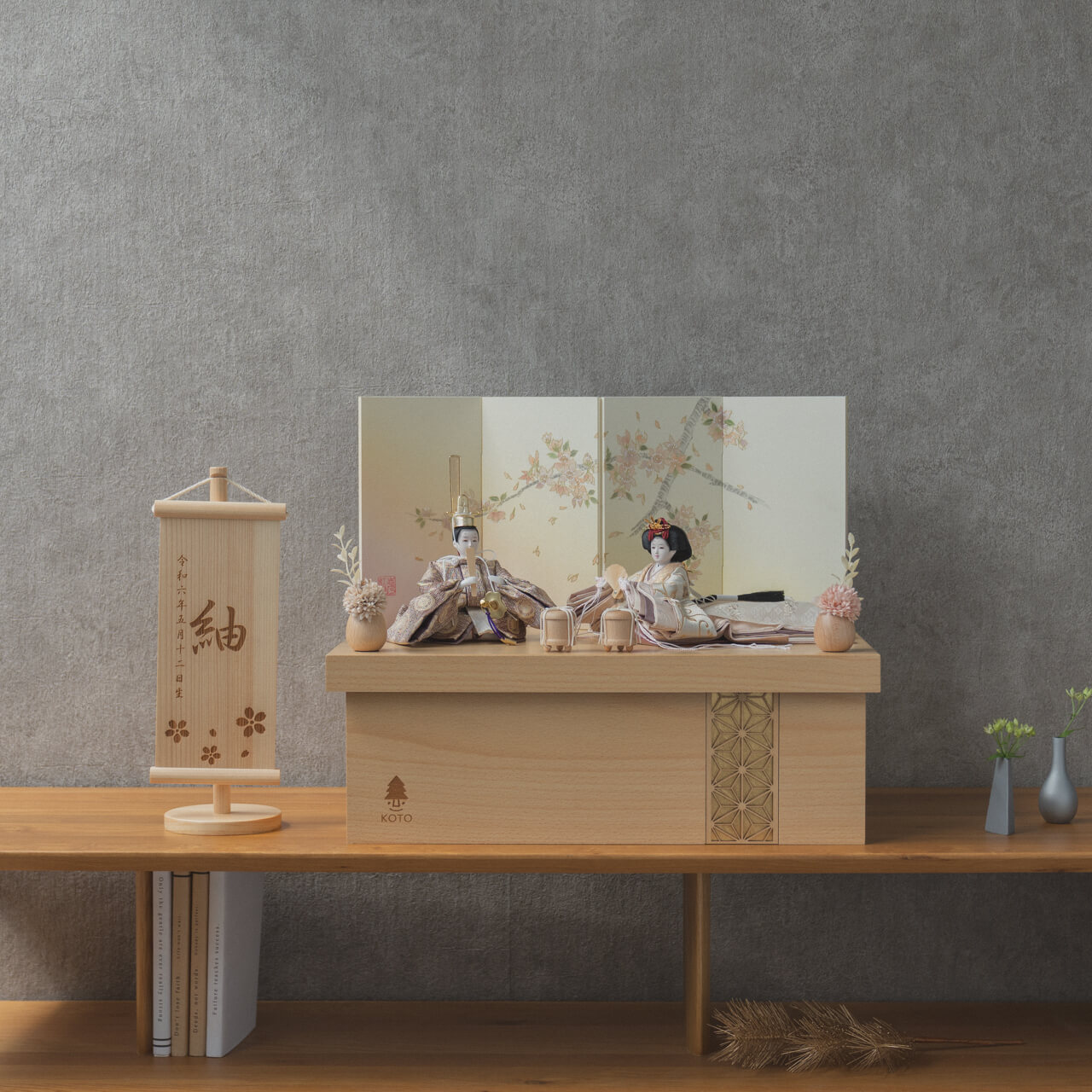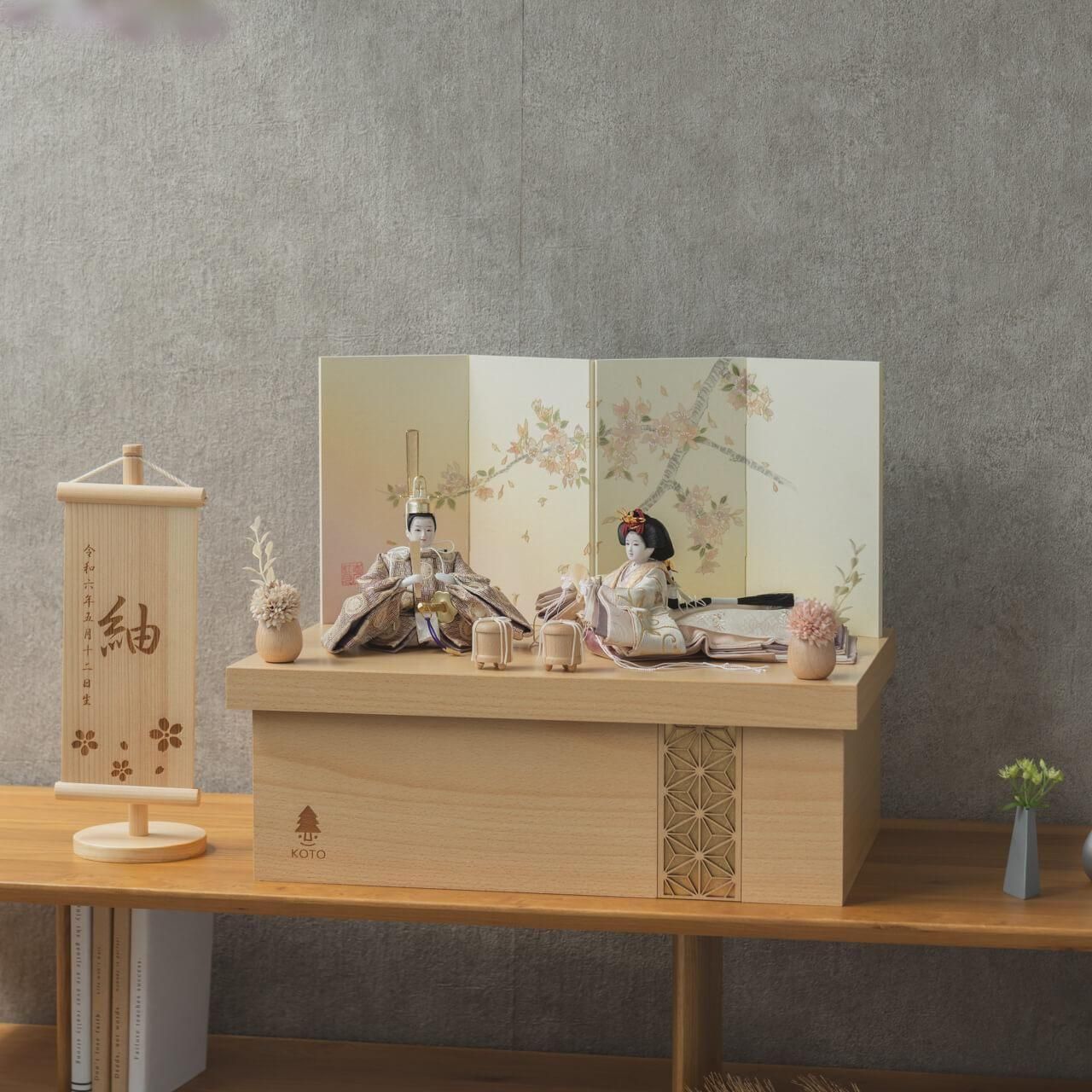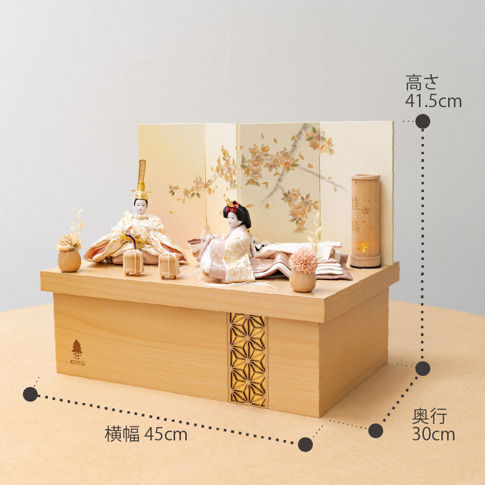 平安という言葉は平安京に由来しており、「穏やか」「安泰」といった願いが込められております。ことの平安ひなとは、お子様の成長や未来が穏やかで無事であるよう祈りを込めたお雛様です。そんな雛人形をてづくり工房「木都」の職人が、伝統工芸の技術と天然木の素材を活かし、真心込めて1つ1つ丁寧につくりました。コンパクトでちょうどいいサイズコンパクトでちょうどいいサイズ今どきのおうちに合わせたコンパクトなサイズに仕上げました。飾るスペースが狭くなりがちなマンションや子ども部屋にもぴったり。お部屋のイメージに調和するデザインお部屋のイメージに調和するデザイン天然木の素材を活かしたシンプルなデザインだから、お部屋の雰囲気にもピッタリ。お衣装へのこだわり 〜正絹 二重蔓牡丹文〜お衣装へのこだわり 〜正絹 二重蔓牡丹文〜日本の伝統的な文様の一つである、牡丹の花と唐草模様が組み合わさった「牡丹唐草」。牡丹には「不老不死」と「不老長寿」という意味が込められており、また、華やかで美しい牡丹の花は美と富の象徴とされています。そんな牡丹唐草の柄と小さいながらも光沢のある生地を合わせ、可愛らしさと高級感のある雛人形に仕上げました。手作りへのこだわり 〜裂地(きれじ)の裁断手作りへのこだわり 〜裂地(きれじ)の裁断和紙で衣裳の各種型紙を作り、へり部分にのみ糊をつけ、裂地裏面に貼り付けます。型紙に沿って裁断して衣裳部品を作っていきます。手作りへのこだわり 〜縫製手作りへのこだわり 〜縫製姫の十二単の唐衣(からぎぬ)・五衣(いつつぎぬ)・単衣(ひとえ)・裾、殿の着物・裾・中袖等、数多くの衣裳部品をミシン、または手縫いで細やかな部分まで縫い合わせ、折り込み仕上げていきます。手作りへのこだわり 〜着付け・振付け手作りへのこだわり 〜着付け・振付け仕上がった衣裳は両腕を後方に曲げて羽織らせるようにして着付けます。次にそれぞれの人形の形に振付けます。腕を曲げる角度や手の位置などで全体のバランスを取ります。手作りへのこだわり 〜頭差し手作りへのこだわり 〜頭差し頭さしは最終の人形検品を兼ねて行われます。包まれた顔紙を外し、汚れ等無いことを確認します。頭と衣紋の中心線が一直線になるように差し込みます。ことのお雛様ことのお雛様お雛様の顔は時代とともに人気のお顔があります。ことのお雛様のお顔は時代に左右されない普遍的なシンプルで可愛らしいお顔となっています。お子さまの感性を育む天然木へのこだわりお子さまの感性を育む天然木へのこだわり素材には、タモ、ブナといった天然木を使用。お子さまへの一生に一度の贈り物だから、木都は自然素材の天然木にこだわり続けています。※ 生産時期により使用する素材が一部変更になる場合がございます。熟練の職人による確かな手仕事熟練の職人による確かな手仕事伝統工芸の技術を受け継ぐ日本国内の熟練の職人が、一つひとつ丁寧に手づくりしています。おしゃれなギフト包装でお届けしますおしゃれなギフト包装でお届けします和の雰囲気を感じさせる越前和紙のギフト用ラッピングでお届け。料金がわかるものもお入れしていないので、そのまま贈り物として利用できます。商品レビュー記入でもれなくもらえる天然木のミニ名前札プレゼント商品レビュー記入でもれなくもらえる天然木のミニ名前札プレゼントミニサイズのお名前札 (通常販売価格1,980円) をプレゼント♪商品到着後、商品レビューをご記入の上、商品と同梱のチラシ記載のQRコードから応募フォームへ必要事項をご入力ください。店舗よりレビュー特典を発送いたします。※ お名前札の生年月日の表記は和暦となります。(例:令和七年)商品のご注文へ収納方法とセット内容お内裏様・お雛様・屏風・収納箱・人形小道具・貝桶×2・花飾り×2素材:ブナ重量:3,350g サイズ:W450mm × D300mm × H415mm梱包時:W490mm × D315mm × H215mm殿:約 W155mm × D100mm × H165mm姫:約 W140mm × D440mm × H110mm注意事項色合いなど実際のものと写真とでは多少の誤差が生じる場合がございます。また、手作りであり天然木を使用している為、多少の仕様の変化や風合いがひとつひとつ異なります。あらかじめご了承ください。部品には小さなものがございます。お子様がお口に入れないようにご注意ください。材質により木の刻印の濃淡に差が生じますが不良品ではございません。木製品である限り自然なこととご承知下さいませ。保管場所は変色やカビ、サビの原因になりますので湿気の少ない場所・直射日光の当たらない場所に保管してください。雄雛の正面にあります飾り帯のビニールは外さないでください。本商品に行燈は付属しておりません。別途お買い求めください。ご不明点がございましたら > お問い合わせページ からご相談ください。
