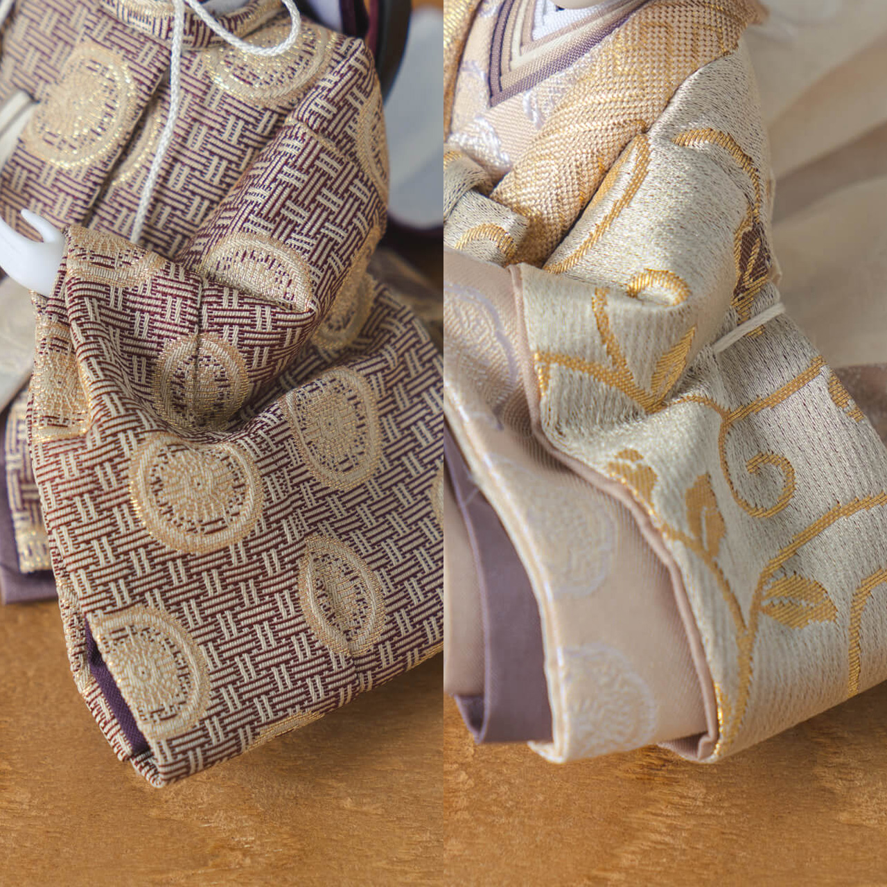 お衣装へのこだわり 〜正絹 二重蔓牡丹文〜日本の伝統的な文様の一つである、牡丹の花と唐草模様が組み合わさった「牡丹唐草」。牡丹には「不老不死」と「不老長寿」という意味が込められており、また、華やかで美しい牡丹の花は美と富の象徴とされています。そんな牡丹唐草の柄と小さいながらも光沢のある生地を合わせ、可愛らしさと高級感のある雛人形に仕上げました。