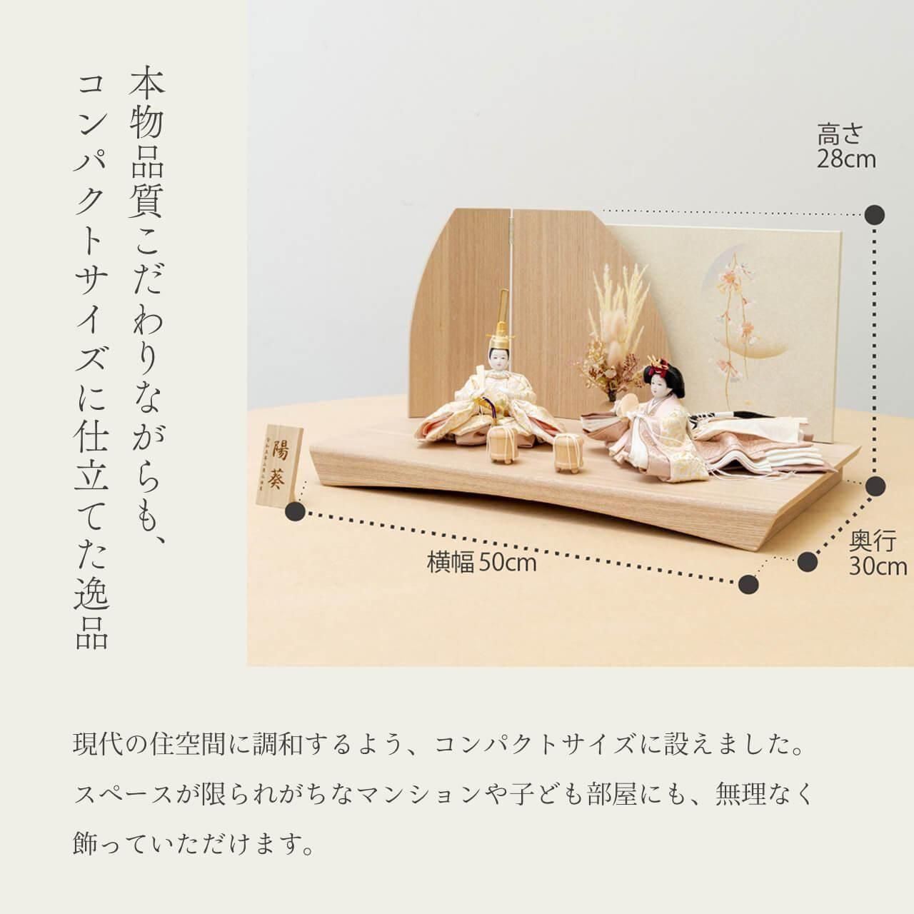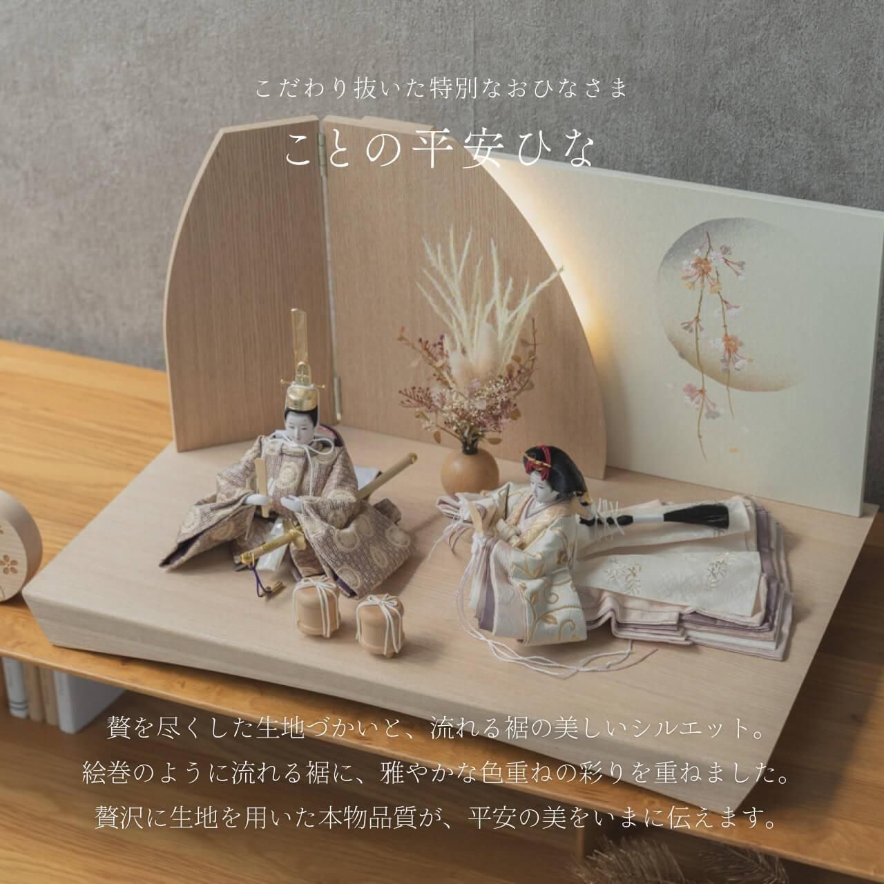 平安という言葉は平安京に由来しており、「穏やか」「安泰」といった願いが込められております。ことの平安ひなとは、お子様の成長や未来が穏やかで無事であるよう祈りを込めたお雛様です。そんな雛人形をてづくり工房「木都」の職人が、伝統工芸の技術と天然木の素材を活かし、真心込めて1つ1つ丁寧につくりました。コンパクトでちょうどいいサイズコンパクトでちょうどいいサイズ今どきのおうちに合わせたコンパクトなサイズに仕上げました。飾るスペースが狭くなりがちなマンションや子ども部屋にもぴったり。お部屋のイメージに調和するデザインお部屋のイメージに調和するデザイン天然木の素材を活かしたシンプルなデザインだから、お部屋の雰囲気にもピッタリ。お衣装へのこだわり 〜正絹 二重蔓牡丹文〜お衣装へのこだわり 〜正絹 二重蔓牡丹文〜日本の伝統的な文様の一つである、牡丹の花と唐草模様が組み合わさった「牡丹唐草」。牡丹には「不老不死」と「不老長寿」という意味が込められており、また、華やかで美しい牡丹の花は美と富の象徴とされています。そんな牡丹唐草の柄と小さいながらも光沢のある生地を合わせ、可愛らしさと高級感のある雛人形に仕上げました。手作りへのこだわり 〜裂地(きれじ)の裁断手作りへのこだわり 〜裂地(きれじ)の裁断和紙で衣裳の各種型紙を作り、へり部分にのみ糊をつけ、裂地裏面に貼り付けます。型紙に沿って裁断して衣裳部品を作っていきます。手作りへのこだわり 〜縫製手作りへのこだわり 〜縫製姫の十二単の唐衣(からぎぬ)・五衣(いつつぎぬ)・単衣(ひとえ)・裾、殿の着物・裾・中袖等、数多くの衣裳部品をミシン、または手縫いで細やかな部分まで縫い合わせ、折り込み仕上げていきます。手作りへのこだわり 〜着付け・振付け手作りへのこだわり 〜着付け・振付け仕上がった衣裳は両腕を後方に曲げて羽織らせるようにして着付けます。次にそれぞれの人形の形に振付けます。腕を曲げる角度や手の位置などで全体のバランスを取ります。手作りへのこだわり 〜頭差し手作りへのこだわり 〜頭差し頭さしは最終の人形検品を兼ねて行われます。包まれた顔紙を外し、汚れ等無いことを確認します。頭と衣紋の中心線が一直線になるように差し込みます。ことのお雛様ことのお雛様お雛様の顔は時代とともに人気のお顔があります。ことのお雛様のお顔は時代に左右されない普遍的なシンプルで可愛らしいお顔となっています。ライト付き屏風ライト付き屏風優しいあかりが灯る屏風には、美しい桜の花が描かれており、お部屋のインテリアに彩りを与えてくれます。お部屋に広がる優しいあかりがお雛様を照らし、暖かな雰囲気を演出してくれます。電源コード式で電池切れの心配もありません。お子さまの感性を育む天然木へのこだわりお子さまの感性を育む天然木へのこだわり素材には、タモ、ブナといった天然木を使用。お子さまへの一生に一度の贈り物だから、木都は自然素材の天然木にこだわり続けています。※ 生産時期により使用する素材が一部変更になる場合がございます。熟練の職人による確かな手仕事熟練の職人による確かな手仕事伝統工芸の技術を受け継ぐ日本国内の熟練の職人が、一つひとつ丁寧に手づくりしています。おしゃれなギフト包装でお届けしますおしゃれなギフト包装でお届けします和の雰囲気を感じさせる越前和紙のギフト用ラッピングでお届け。料金がわかるものもお入れしていないので、そのまま贈り物として利用できます。商品レビュー記入でもれなくもらえる天然木のミニ名前札プレゼント商品レビュー記入でもれなくもらえる天然木のミニ名前札プレゼントミニサイズのお名前札 (通常販売価格1,980円) をプレゼント♪商品到着後、商品レビューをご記入の上、商品と同梱のチラシ記載のQRコードから応募フォームへ必要事項をご入力ください。店舗よりレビュー特典を発送いたします。※ お名前札の生年月日の表記は和暦となります。(例:令和七年)商品のご注文へ収納方法とセット内容お内裏様・お雛様・屏風・平台・人形小道具・貝桶×2・立花・電源ケーブル素材:タモ重量:3,100g サイズ:W500mm × D300mm × H280mm梱包時:W520mm × D320mm × H230mm殿:約 W155mm × D100mm × H165mm姫:約 W140mm × D440mm × H110mm注意事項色合いなど実際のものと写真とでは多少の誤差が生じる場合がございます。また、手作りであり天然木を使用している為、多少の仕様の変化や風合いがひとつひとつ異なります。あらかじめご了承ください。部品には小さなものがございます。お子様がお口に入れないようにご注意ください。材質により木の刻印の濃淡に差が生じますが不良品ではございません。木製品である限り自然なこととご承知下さいませ。保管場所は変色やカビ、サビの原因になりますので湿気の少ない場所・直射日光の当たらない場所に保管してください。雄雛の正面にあります飾り帯のビニールは外さないでください。