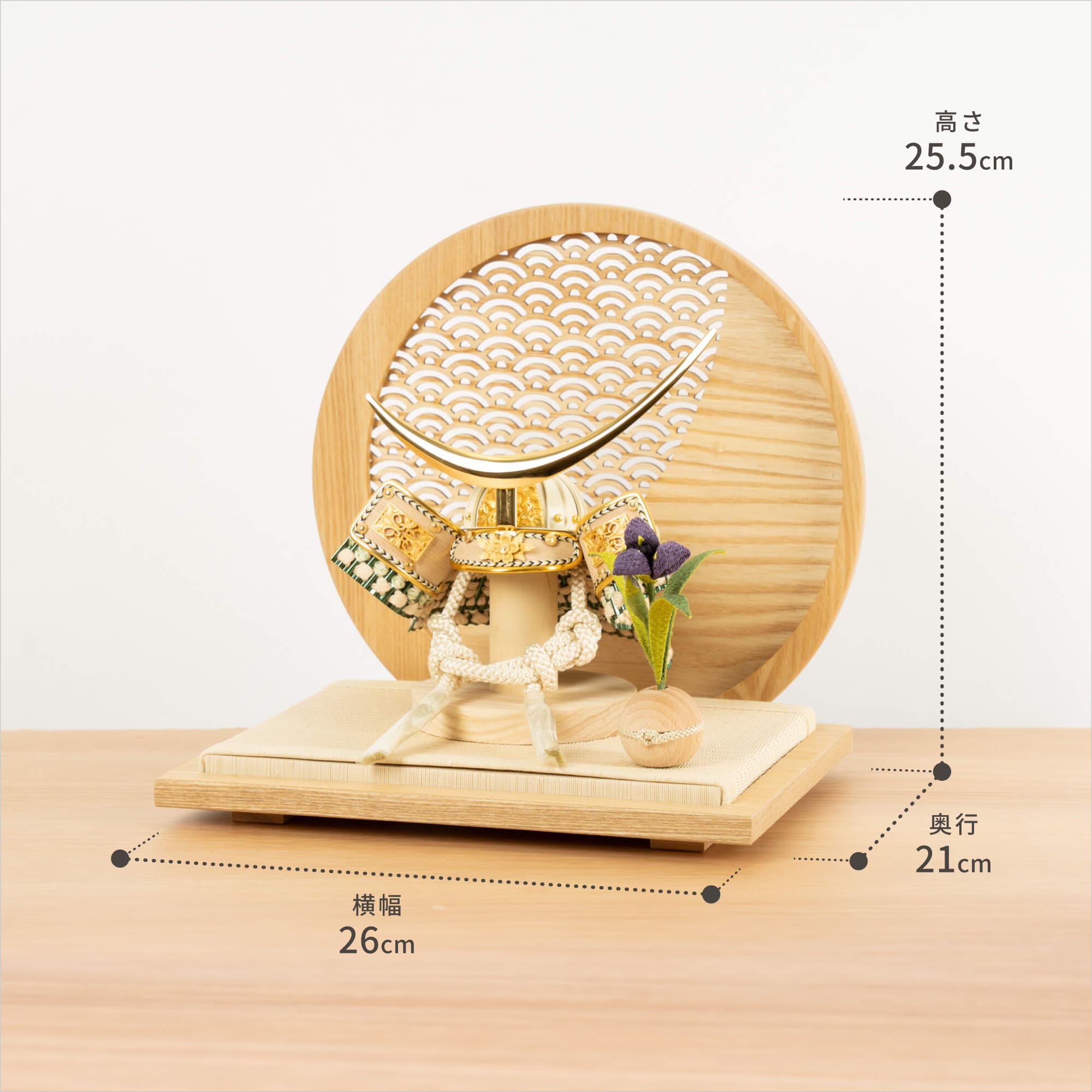 実際に手に取ると天然木の素材ならではの優しいぬくもりが伝わります。てづくり工房「木都」の職人が、伝統工芸の技術と天然木の素材を活かし、真心込めて1つ1つ丁寧につくりました。親しみやすく、お子様と一緒に飾れることのオリジナル兜です。※ 細かい部品が含まれています。3歳未満のお子様は、保護者の方と一緒にお遊びください。コンパクトでちょうどいいサイズコンパクトでちょうどいいサイズ今どきのおうちに合わせたコンパクトなサイズに仕上げました。飾るスペースが狭くなりがちなマンションや子ども部屋にもぴったり。伝統的な兜をモダンに仕上げたシンプルなデザイン伝統的な兜をモダンに仕上げたシンプルなデザイン伝統的な製法で作られた兜に天然木の素材を活かしたシンプルなデザインの兜です。モダンでシンプルなデザインは、どんなお部屋の雰囲気にもピッタリ。選び抜いた素材と手間をかけた技法でつくる兜鉢選び抜いた素材と手間をかけた技法でつくる兜鉢ことのオリジナル兜の兜鉢は、伝統的な本式の合せ鉢という技法でつくられています。本式の合せ鉢とは、戦国時代に頭部を守るために考案され、三角状の鉢部品を重ね合わせ、多数の星鋲をカシメる事で強度を高める技法です。日本の伝統模様 青海波日本の伝統模様 青海波屏風の模様は青海波(せいかいは)と呼ばれています。穏やかな波がどこまでも続いている様子の模様。「未来永劫平穏に」という意味が込められた吉祥柄。穏やかな日々が続いていくよう願いが込められています。一本一本織機で織る日本古来の伝統製法と加工一本一本織機で織る日本古来の伝統製法と加工日本独自の伝統文化である「畳」一本一本織機で織る「伝統的な製法」と「引目」「目積」などの「伝統的な織柄」に徹底した日本古来の伝統製法で加工されています。天然イ草の風合いを活かしながら、高い耐久性や安全性のある「美草」を使用しています。お子さまの感性を育む天然木へのこだわりお子さまの感性を育む天然木へのこだわり素材には、タモ、ブナといった天然木を使用。お子さまへの一生に一度の贈り物だから、木都は自然素材の天然木にこだわり続けています。※ 生産時期により使用する素材が一部変更になる場合がございます。熟練の職人による確かな手仕事熟練の職人による確かな手仕事伝統工芸の技術を受け継ぐ日本国内の熟練の職人が、一つひとつ丁寧に手づくりしています。おしゃれなギフト包装でお届けしますおしゃれなギフト包装でお届けします和の雰囲気を感じさせる越前和紙のギフト用ラッピングでお届け。料金がわかるものもお入れしていないので、そのまま贈り物として利用できます。商品レビュー記入でもれなくもらえる天然木のミニ名前札プレゼント商品レビュー記入でもれなくもらえる天然木のミニ名前札プレゼントミニサイズのお名前札 (通常販売価格1,980円) をプレゼント♪商品到着後、商品レビューをご記入の上、商品と同梱のチラシ記載のQRコードから応募フォームへ必要事項をご入力ください。店舗よりレビュー特典を発送いたします。※ お名前札の生年月日の表記は和暦となります。(例:令和七年)商品のご注文へ収納方法とセット内容兜・鍬形・芯木・菖蒲・衝立・平台素材:タモ重量:1,170g (兜のみ 150g)サイズ:W260mm × D210mm × H255mm梱包時:W300mm × D300mm × H170mm兜のみ:約 W150mm × D110mm × H150mm注意事項本品は、金属をふんだんに使用しております。取り扱われる方の人体にすり傷、切り傷、刺傷を及ぼす場合がございますので、左記注意事項をよく読んでお取り扱い下さい。甲冑について飾り付ける際に必ず手袋をご使用ください。錆や変色などの予防にもなります。本品の上には絶対に乗らないでください。本品または本品の部品は装飾品です。他の目的に使用しないで下さい。部品には小さなものがございます。お子様がお口に入れないようにご注意いください。木製品について色合いなど実際のものと写真とでは多少の誤差が生じる場合がございます。また、手作りであり天然木を使用している為、多少の仕様の変化や風合いがひとつひとつ異なります。あらかじめご了承ください。部品には小さなものがございます。お子様がお口に入れないようにご注意いください。菖蒲には針金が入っております。お好みで角度を調整して下さい。材質により刻印の濃淡に差が生じますが不良品ではございません。木製品である限り自然なこととご承知下さいませ。保管場所は変色やカビ、サビの原因になりますので湿気の少ない場所・直射日光の当たらない場所に保管してください。ご不明点がございましたら > お問い合わせページ からご相談ください。