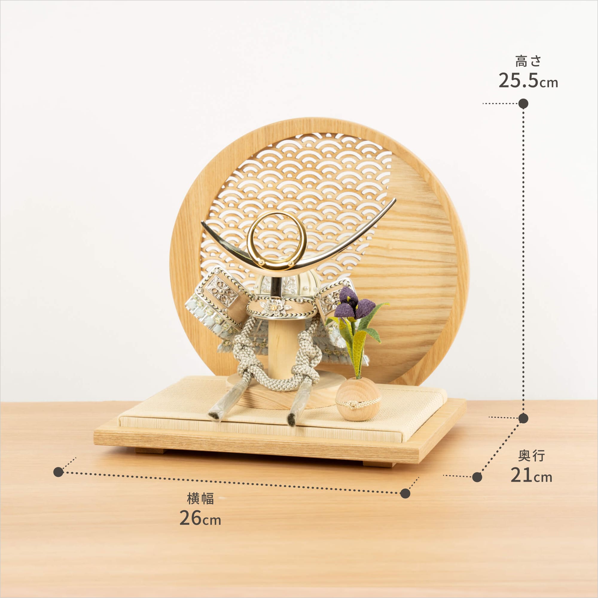 実際に手に取ると天然木の素材ならではの優しいぬくもりが伝わります。てづくり工房「木都」の職人が、伝統工芸の技術と天然木の素材を活かし、真心込めて1つ1つ丁寧につくりました。親しみやすく、お子様と一緒に飾れることのオリジナル兜です。※ 細かい部品が含まれています。3歳未満のお子様は、保護者の方と一緒にお遊びください。コンパクトでちょうどいいサイズコンパクトでちょうどいいサイズ今どきのおうちに合わせたコンパクトなサイズに仕上げました。飾るスペースが狭くなりがちなマンションや子ども部屋にもぴったり。伝統的な兜をモダンに仕上げたシンプルなデザイン伝統的な兜をモダンに仕上げたシンプルなデザイン伝統的な製法で作られた兜に天然木の素材を活かしたシンプルなデザインの兜です。モダンでシンプルなデザインは、どんなお部屋の雰囲気にもピッタリ。選び抜いた素材と手間をかけた技法でつくる兜鉢選び抜いた素材と手間をかけた技法でつくる兜鉢ことのオリジナル兜の兜鉢は、伝統的な本式の合せ鉢という技法でつくられています。本式の合せ鉢とは、戦国時代に頭部を守るために考案され、三角状の鉢部品を重ね合わせ、多数の星鋲をカシメる事で強度を高める技法です。日本の伝統模様 青海波日本の伝統模様 青海波屏風の模様は青海波(せいかいは)と呼ばれています。穏やかな波がどこまでも続いている様子の模様。「未来永劫平穏に」という意味が込められた吉祥柄。穏やかな日々が続いていくよう願いが込められています。一本一本織機で織る日本古来の伝統製法と加工一本一本織機で織る日本古来の伝統製法と加工日本独自の伝統文化である「畳」一本一本織機で織る「伝統的な製法」と「引目」「目積」などの「伝統的な織柄」に徹底した日本古来の伝統製法で加工されています。天然イ草の風合いを活かしながら、高い耐久性や安全性のある「美草」を使用しています。お子さまの感性を育む天然木へのこだわりお子さまの感性を育む天然木へのこだわり素材には、タモ、ブナといった天然木を使用。お子さまへの一生に一度の贈り物だから、木都は自然素材の天然木にこだわり続けています。※ 生産時期により使用する素材が一部変更になる場合がございます。熟練の職人による確かな手仕事熟練の職人による確かな手仕事伝統工芸の技術を受け継ぐ日本国内の熟練の職人が、一つひとつ丁寧に手づくりしています。おしゃれなギフト包装でお届けしますおしゃれなギフト包装でお届けします和の雰囲気を感じさせる越前和紙のギフト用ラッピングでお届け。料金がわかるものもお入れしていないので、そのまま贈り物として利用できます。商品レビュー記入でもれなくもらえる天然木のミニ名前札プレゼント商品レビュー記入でもれなくもらえる天然木のミニ名前札プレゼントミニサイズのお名前札 (通常販売価格1,980円) をプレゼント♪商品到着後、商品レビューをご記入の上、商品と同梱のチラシ記載のQRコードから応募フォームへ必要事項をご入力ください。店舗よりレビュー特典を発送いたします。※ お名前札の生年月日の表記は和暦となります。(例:令和七年)商品のご注文へ収納方法とセット内容兜・鍬形・芯木・菖蒲・衝立・平台素材:タモ重量:1,170g (兜のみ 150g)サイズ:W260mm × D210mm × H255mm梱包時:W300mm × D300mm × H170mm兜のみ:約 W150mm × D110mm × H150mm注意事項本品は、金属をふんだんに使用しております。取り扱われる方の人体にすり傷、切り傷、刺傷を及ぼす場合がございますので、左記注意事項をよく読んでお取り扱い下さい。甲冑について飾り付ける際に必ず手袋をご使用ください。錆や変色などの予防にもなります。本品の上には絶対に乗らないでください。本品または本品の部品は装飾品です。他の目的に使用しないで下さい。部品には小さなものがございます。お子様がお口に入れないようにご注意いください。木製品について色合いなど実際のものと写真とでは多少の誤差が生じる場合がございます。また、手作りであり天然木を使用している為、多少の仕様の変化や風合いがひとつひとつ異なります。あらかじめご了承ください。部品には小さなものがございます。お子様がお口に入れないようにご注意いください。菖蒲には針金が入っております。お好みで角度を調整して下さい。材質により刻印の濃淡に差が生じますが不良品ではございません。木製品である限り自然なこととご承知下さいませ。保管場所は変色やカビ、サビの原因になりますので湿気の少ない場所・直射日光の当たらない場所に保管してください。ご不明点がございましたら > お問い合わせページ からご相談ください。