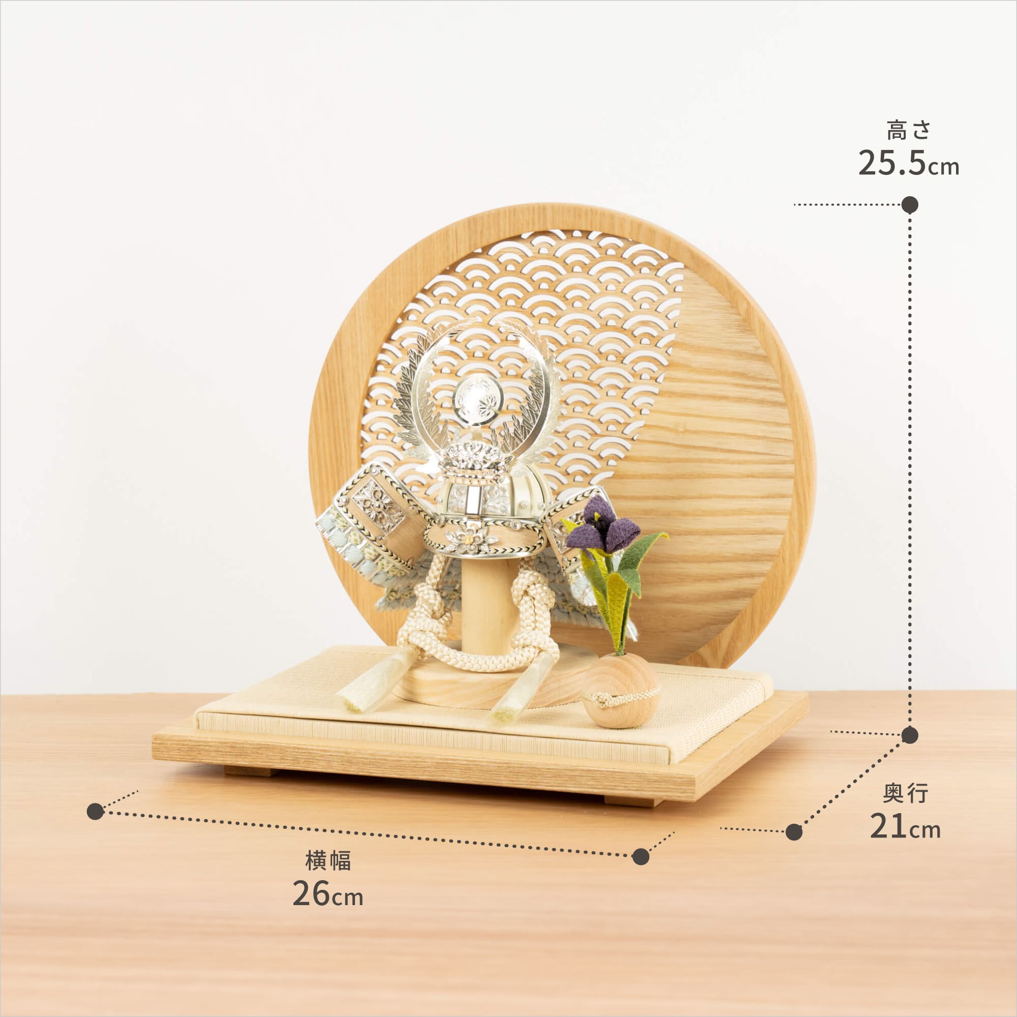 実際に手に取ると天然木の素材ならではの優しいぬくもりが伝わります。てづくり工房「木都」の職人が、伝統工芸の技術と天然木の素材を活かし、真心込めて1つ1つ丁寧につくりました。親しみやすく、お子様と一緒に飾れることのオリジナル兜です。※ 細かい部品が含まれています。3歳未満のお子様は、保護者の方と一緒にお遊びください。コンパクトでちょうどいいサイズコンパクトでちょうどいいサイズ今どきのおうちに合わせたコンパクトなサイズに仕上げました。飾るスペースが狭くなりがちなマンションや子ども部屋にもぴったり。伝統的な兜をモダンに仕上げたシンプルなデザイン伝統的な兜をモダンに仕上げたシンプルなデザイン伝統的な製法で作られた兜に天然木の素材を活かしたシンプルなデザインの兜です。モダンでシンプルなデザインは、どんなお部屋の雰囲気にもピッタリ。選び抜いた素材と手間をかけた技法でつくる兜鉢選び抜いた素材と手間をかけた技法でつくる兜鉢ことのオリジナル兜の兜鉢は、伝統的な本式の合せ鉢という技法でつくられています。本式の合せ鉢とは、戦国時代に頭部を守るために考案され、三角状の鉢部品を重ね合わせ、多数の星鋲をカシメる事で強度を高める技法です。日本の伝統模様 青海波日本の伝統模様 青海波屏風の模様は青海波(せいかいは)と呼ばれています。穏やかな波がどこまでも続いている様子の模様。「未来永劫平穏に」という意味が込められた吉祥柄。穏やかな日々が続いていくよう願いが込められています。一本一本織機で織る日本古来の伝統製法と加工一本一本織機で織る日本古来の伝統製法と加工日本独自の伝統文化である「畳」一本一本織機で織る「伝統的な製法」と「引目」「目積」などの「伝統的な織柄」に徹底した日本古来の伝統製法で加工されています。天然イ草の風合いを活かしながら、高い耐久性や安全性のある「美草」を使用しています。お子さまの感性を育む天然木へのこだわりお子さまの感性を育む天然木へのこだわり素材には、タモ、ブナといった天然木を使用。お子さまへの一生に一度の贈り物だから、木都は自然素材の天然木にこだわり続けています。※ 生産時期により使用する素材が一部変更になる場合がございます。熟練の職人による確かな手仕事熟練の職人による確かな手仕事伝統工芸の技術を受け継ぐ日本国内の熟練の職人が、一つひとつ丁寧に手づくりしています。おしゃれなギフト包装でお届けしますおしゃれなギフト包装でお届けします和の雰囲気を感じさせる越前和紙のギフト用ラッピングでお届け。料金がわかるものもお入れしていないので、そのまま贈り物として利用できます。商品レビュー記入でもれなくもらえる天然木のミニ名前札プレゼント商品レビュー記入でもれなくもらえる天然木のミニ名前札プレゼントミニサイズのお名前札 (通常販売価格1,980円) をプレゼント♪商品到着後、商品レビューをご記入の上、商品と同梱のチラシ記載のQRコードから応募フォームへ必要事項をご入力ください。店舗よりレビュー特典を発送いたします。※ お名前札の生年月日の表記は和暦となります。(例:令和七年)商品のご注文へ収納方法とセット内容兜・鍬形・芯木・菖蒲・衝立・平台素材:タモ重量:1,170g (兜のみ 150g)サイズ:W260mm × D210mm × H255mm梱包時:W300mm × D300mm × H170mm兜のみ:約 W150mm × D110mm × H150mm注意事項本品は、金属をふんだんに使用しております。取り扱われる方の人体にすり傷、切り傷、刺傷を及ぼす場合がございますので、左記注意事項をよく読んでお取り扱い下さい。甲冑について飾り付ける際に必ず手袋をご使用ください。錆や変色などの予防にもなります。本品の上には絶対に乗らないでください。本品または本品の部品は装飾品です。他の目的に使用しないで下さい。部品には小さなものがございます。お子様がお口に入れないようにご注意いください。木製品について色合いなど実際のものと写真とでは多少の誤差が生じる場合がございます。また、手作りであり天然木を使用している為、多少の仕様の変化や風合いがひとつひとつ異なります。あらかじめご了承ください。部品には小さなものがございます。お子様がお口に入れないようにご注意いください。菖蒲には針金が入っております。お好みで角度を調整して下さい。材質により刻印の濃淡に差が生じますが不良品ではございません。木製品である限り自然なこととご承知下さいませ。保管場所は変色やカビ、サビの原因になりますので湿気の少ない場所・直射日光の当たらない場所に保管してください。ご不明点がございましたら > お問い合わせページ からご相談ください。