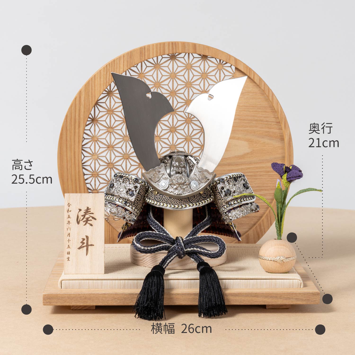 精巧な戦国兜の凛として強く美しい佇まいを天然木の優しいぬくもりが包み込む・・・まるで男の子の成長を温かく見守る家族の様に・・・そんなコンセプトから生まれた兜は、てづくり工房「木都」と甲冑工房「悠雅」のコラボレーションから生まれました。親しみやすく、お子様と一緒に飾れるKOTO×悠雅コラボ兜です。※ 細かい部品が含まれています。3歳未満のお子様は、保護者の方と一緒にお遊びください。選び抜いた素材と手間をかけた技法でつくる兜鉢選び抜いた素材と手間をかけた技法でつくる兜鉢KOTO×悠雅コラボ兜の兜鉢は、伝統的な本式の合せ鉢という技法でつくられています。本式の合せ鉢とは、戦国時代に頭部を守るために考案され、三角状の鉢部品を重ね合わせ、多数の星鋲をカシメる事で強度を高める技法です。選び抜いた素材と手間をかけた技法でつくる「庇」選び抜いた素材と手間をかけた技法でつくる「庇」兜の裏側にあたる庇は、甲州印伝革を使用し伝統的な技術で1つ1つ手作りで丁寧に作られています。選び抜いた素材と手間をかけた技法でつくる「小札」選び抜いた素材と手間をかけた技法でつくる「小札」小札は、細かい天然繊維である本物の絹糸を使用した正絹で結び合わせ繋げております。伝統的な兜をモダンに仕上げたシンプルなデザイン伝統的な兜をモダンに仕上げたシンプルなデザイン伝統的な製法で作られた兜に天然木の素材を活かしたシンプルなデザインの兜です。モダンでシンプルなデザインは、どんなお部屋の雰囲気にもピッタリ。コンパクトでちょうどいいサイズコンパクトでちょうどいいサイズ今どきのおうちに合わせたコンパクトなサイズに仕上げました。飾るスペースが狭くなりがちなマンションや子ども部屋にもぴったり。健やかな成長への願いを込めた麻の葉文様健やかな成長への願いを込めた麻の葉文様古来からの日本伝統の吉祥文様である麻の葉文様。麻の丈夫さ・成長の早さにあやかり、お子さまの健やかな成長への願いが込められています。一本一本織機で織る日本古来の伝統製法と加工一本一本織機で織る日本古来の伝統製法と加工日本独自の伝統文化である「畳」一本一本織機で織る「伝統的な製法」と「引目」「目積」などの「伝統的な織柄」に徹底した日本古来の伝統製法で加工されています。天然イ草の風合いを活かしながら、高い耐久性や安全性のある「美草」を使用しています。お子さまの感性を育む天然木へのこだわりお子さまの感性を育む天然木へのこだわり素材には、タモ、ブナといった天然木を使用。お子さまへの一生に一度の贈り物だから、木都は自然素材の天然木にこだわり続けています。※ 生産時期により使用する素材が一部変更になる場合がございます。熟練の職人による確かな手仕事熟練の職人による確かな手仕事伝統工芸の技術を受け継ぐ日本国内の熟練の職人が、一つひとつ丁寧に手づくりしています。おしゃれなギフト包装でお届けしますおしゃれなギフト包装でお届けします和の雰囲気を感じさせる越前和紙のギフト用ラッピングでお届け。料金がわかるものもお入れしていないので、そのまま贈り物として利用できます。商品レビュー記入でもれなくもらえる天然木のミニ名前札プレゼント商品レビュー記入でもれなくもらえる天然木のミニ名前札プレゼントミニサイズのお名前札 (通常販売価格1,980円) をプレゼント♪商品到着後、商品レビューをご記入の上、商品と同梱のチラシ記載のQRコードから応募フォームへ必要事項をご入力ください。店舗よりレビュー特典を発送いたします。※ お名前札の生年月日の表記は和暦となります。(例:令和七年)商品のご注文へ収納方法とセット内容兜・鍬形・芯木・菖蒲・衝立・平台素材:タモ重量:1,290g (兜のみ 270g)サイズ:W260mm × D210mm × H255mm梱包時:W300mm × D300mm × H170mm兜のみ:約 W150mm × D110mm × H150mm収納方法鍬形は専用袋に入れ、兜は風呂敷に包みます。その他の部品は不織布に入れ収納してください。兜置きの下台とポールは組み立ててご利用ください。注意事項甲冑について飾り付ける際に必ず手袋をご使用ください。錆や変色などの予防にもなります。本品の上には絶対に乗らないでください。本品または本品の部品は装飾品です。他の目的に使用しないで下さい。部品には小さなものがございます。お子様がお口に入れないようにご注意いください。木製品について色合いなど実際のものと写真とでは多少の誤差が生じる場合がございます。また、手作りであり天然木を使用している為、多少の仕様の変化や風合いがひとつひとつ異なります。あらかじめご了承ください。部品には小さなものがございます。お子様がお口に入れないようにご注意いください。菖蒲には針金が入っております。お好みで角度を調整して下さい。材質により刻印の濃淡に差が生じますが不良品ではございません。木製品である限り自然なこととご承知下さいませ。保管場所は変色やカ