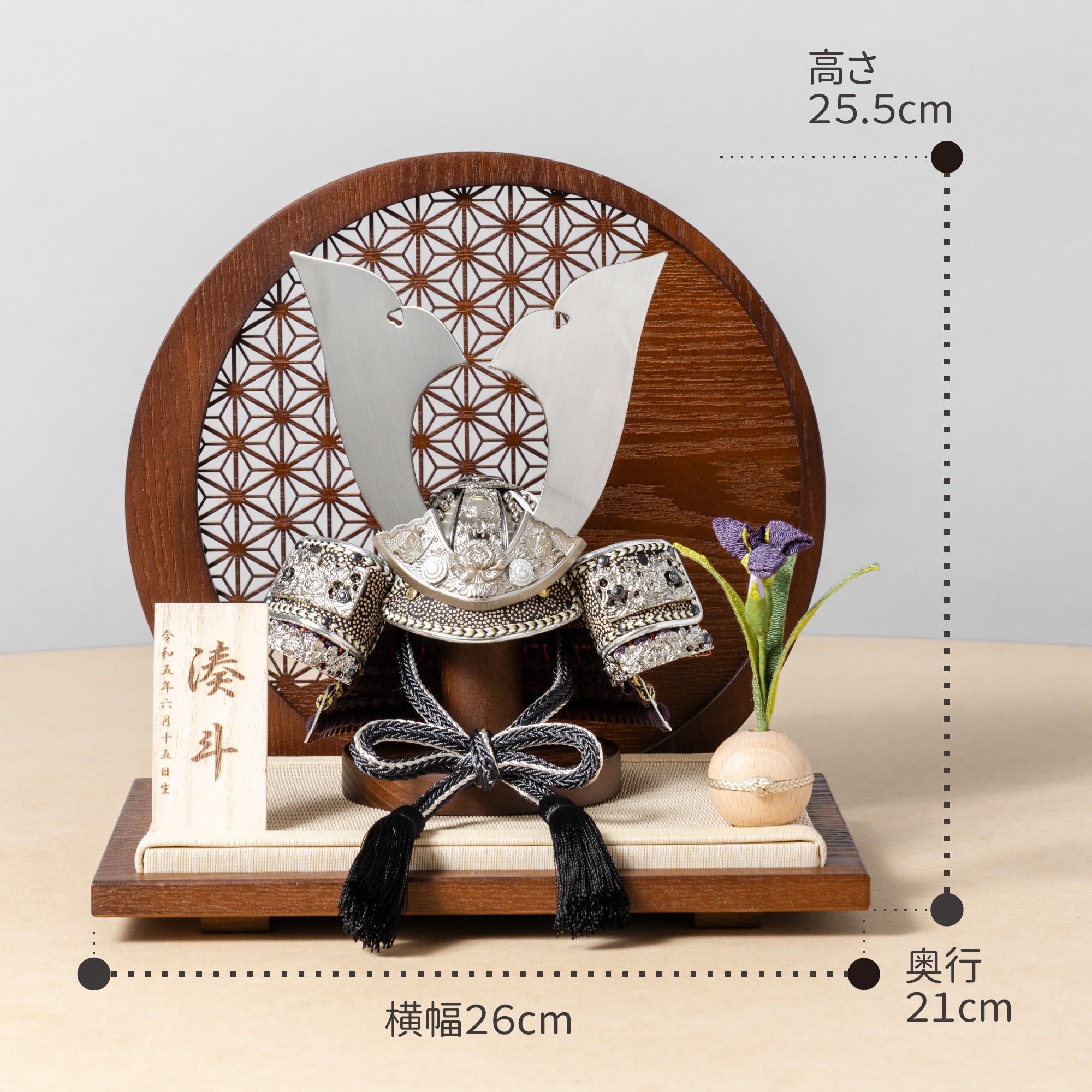 精巧な戦国兜の凛として強く美しい佇まいを天然木の優しいぬくもりが包み込む・・・まるで男の子の成長を温かく見守る家族の様に・・・そんなコンセプトから生まれた兜は、てづくり工房「木都」と甲冑工房「悠雅」のコラボレーションから生まれました。親しみやすく、お子様と一緒に飾れるKOTO×悠雅コラボ兜です。※ 細かい部品が含まれています。3歳未満のお子様は、保護者の方と一緒にお遊びください。選び抜いた素材と手間をかけた技法でつくる兜鉢選び抜いた素材と手間をかけた技法でつくる兜鉢KOTO×悠雅コラボ兜の兜鉢は、伝統的な本式の合せ鉢という技法でつくられています。本式の合せ鉢とは、戦国時代に頭部を守るために考案され、三角状の鉢部品を重ね合わせ、多数の星鋲をカシメる事で強度を高める技法です。選び抜いた素材と手間をかけた技法でつくる「庇」選び抜いた素材と手間をかけた技法でつくる「庇」兜の裏側にあたる庇は、甲州印伝革を使用し伝統的な技術で1つ1つ手作りで丁寧に作られています。選び抜いた素材と手間をかけた技法でつくる「小札」選び抜いた素材と手間をかけた技法でつくる「小札」小札は、細かい天然繊維である本物の絹糸を使用した正絹で結び合わせ繋げております。伝統的な兜をモダンに仕上げたシンプルなデザイン伝統的な兜をモダンに仕上げたシンプルなデザイン伝統的な製法で作られた兜に天然木の素材を活かしたシンプルなデザインの兜です。モダンでシンプルなデザインは、どんなお部屋の雰囲気にもピッタリ。コンパクトでちょうどいいサイズコンパクトでちょうどいいサイズ今どきのおうちに合わせたコンパクトなサイズに仕上げました。飾るスペースが狭くなりがちなマンションや子ども部屋にもぴったり。健やかな成長への願いを込めた麻の葉文様健やかな成長への願いを込めた麻の葉文様古来からの日本伝統の吉祥文様である麻の葉文様。麻の丈夫さ・成長の早さにあやかり、お子さまの健やかな成長への願いが込められています。一本一本織機で織る日本古来の伝統製法と加工一本一本織機で織る日本古来の伝統製法と加工日本独自の伝統文化である「畳」一本一本織機で織る「伝統的な製法」と「引目」「目積」などの「伝統的な織柄」に徹底した日本古来の伝統製法で加工されています。天然イ草の風合いを活かしながら、高い耐久性や安全性のある「美草」を使用しています。お子さまの感性を育む天然木へのこだわりお子さまの感性を育む天然木へのこだわり素材には、タモ、ブナといった天然木を使用。お子さまへの一生に一度の贈り物だから、木都は自然素材の天然木にこだわり続けています。※ 生産時期により使用する素材が一部変更になる場合がございます。熟練の職人による確かな手仕事熟練の職人による確かな手仕事伝統工芸の技術を受け継ぐ日本国内の熟練の職人が、一つひとつ丁寧に手づくりしています。おしゃれなギフト包装でお届けしますおしゃれなギフト包装でお届けします和の雰囲気を感じさせる越前和紙のギフト用ラッピングでお届け。料金がわかるものもお入れしていないので、そのまま贈り物として利用できます。商品レビュー記入でもれなくもらえる天然木のミニ名前札プレゼント商品レビュー記入でもれなくもらえる天然木のミニ名前札プレゼントミニサイズのお名前札 (通常販売価格1,980円) をプレゼント♪商品到着後、商品レビューをご記入の上、商品と同梱のチラシ記載のQRコードから応募フォームへ必要事項をご入力ください。店舗よりレビュー特典を発送いたします。※ お名前札の生年月日の表記は和暦となります。(例:令和七年)商品のご注文へ収納方法とセット内容兜・鍬形・芯木・菖蒲・衝立・平台素材:タモ重量:1,290g (兜のみ 270g)サイズ:W260mm × D210mm × H255mm梱包時:W300mm × D300mm × H170mm兜のみ:約 W150mm × D110mm × H150mm収納方法鍬形は専用袋に入れ、兜は風呂敷に包みます。その他の部品は不織布に入れ収納してください。兜置きの下台とポールは組み立ててご利用ください。注意事項甲冑について飾り付ける際に必ず手袋をご使用ください。錆や変色などの予防にもなります。本品の上には絶対に乗らないでください。本品または本品の部品は装飾品です。他の目的に使用しないで下さい。部品には小さなものがございます。お子様がお口に入れないようにご注意いください。木製品について色合いなど実際のものと写真とでは多少の誤差が生じる場合がございます。また、手作りであり天然木を使用している為、多少の仕様の変化や風合いがひとつひとつ異なります。あらかじめご了承ください。部品には小さなものがございます。お子様がお口に入れないようにご注意いください。菖蒲には針金が入っております。お好みで角度を調整して下さい。材質により刻印の濃淡に差が生じますが不良品ではございません。木製品である限り自然なこととご承知下さいませ。保管場所は変色やカ