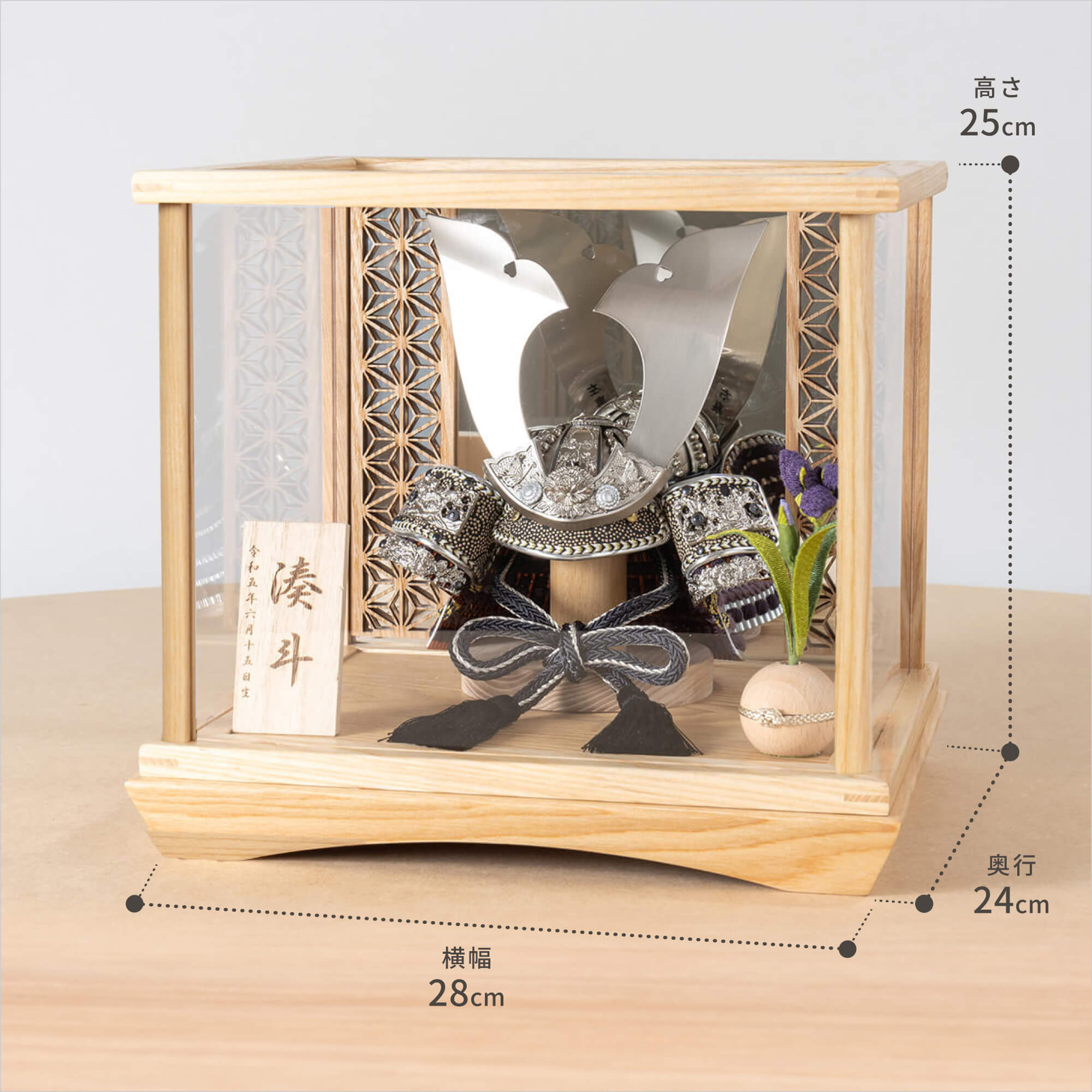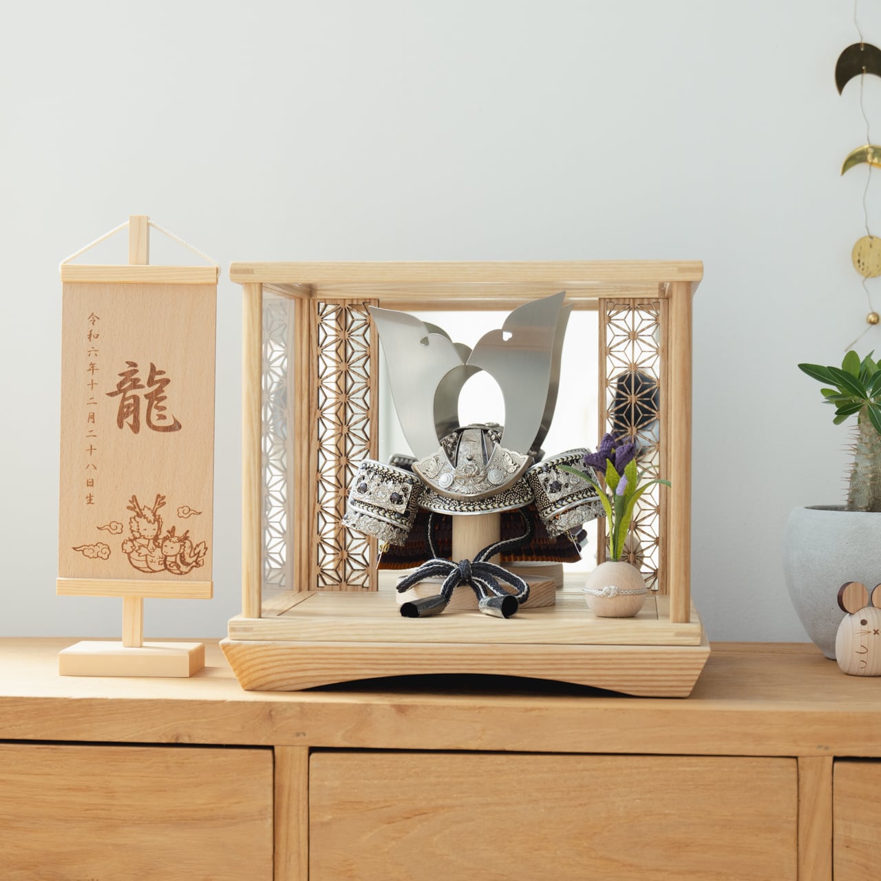 精巧な戦国兜の凛として強く美しい佇まいを天然木の優しいぬくもりが包み込む・・・まるで男の子の成長を温かく見守る家族の様に・・・そんなコンセプトから生まれた兜は、てづくり工房「木都」と甲冑工房「悠雅」のコラボレーションから生まれました。親しみやすく、お子様と一緒に飾れるKOTO×悠雅コラボ兜です。※ 細かい部品が含まれています。3歳未満のお子様は、保護者の方と一緒にお遊びください。選び抜いた素材と手間をかけた技法でつくる兜鉢選び抜いた素材と手間をかけた技法でつくる兜鉢KOTO×悠雅コラボ兜の兜鉢は、伝統的な本式の合せ鉢という技法でつくられています。本式の合せ鉢とは、戦国時代に頭部を守るために考案され、三角状の鉢部品を重ね合わせ、多数の星鋲をカシメる事で強度を高める技法です。選び抜いた素材と手間をかけた技法でつくる「庇」選び抜いた素材と手間をかけた技法でつくる「庇」兜の裏側にあたる庇は、甲州印伝革を使用し伝統的な技術で1つ1つ手作りで丁寧に作られています。選び抜いた素材と手間をかけた技法でつくる「小札」選び抜いた素材と手間をかけた技法でつくる「小札」小札は、細かい天然繊維である本物の絹糸を使用した正絹で結び合わせ繋げております。伝統的な兜をモダンに仕上げたシンプルなデザイン伝統的な兜をモダンに仕上げたシンプルなデザイン伝統的な製法で作られた兜に天然木の素材を活かしたシンプルなデザインの兜です。モダンでシンプルなデザインは、どんなお部屋の雰囲気にもピッタリ。コンパクトでちょうどいいサイズコンパクトでちょうどいいサイズ今どきのおうちに合わせたコンパクトなサイズに仕上げました。飾るスペースが狭くなりがちなマンションや子ども部屋にもぴったり。健やかな成長への願いを込めた麻の葉文様健やかな成長への願いを込めた麻の葉文様古来からの日本伝統の吉祥文様である麻の葉文様。麻の丈夫さ・成長の早さにあやかり、お子さまの健やかな成長への願いが込められています。ケースでも手にとって欲しいこだわりの兜ケースでも手にとって欲しいこだわりの兜木都のケース飾りは、本物の素材や質感を感じながら親子で一緒に手に取って飾る体験をしてほしいから、あえて飾る手間を残しています。手間はかかりますが、伝統的な技法で一つひとつ手づくりしています。お子さまの感性を育む天然木へのこだわりお子さまの感性を育む天然木へのこだわり素材には、タモ、ブナといった天然木を使用。お子さまへの一生に一度の贈り物だから、木都は自然素材の天然木にこだわり続けています。※ 生産時期により使用する素材が一部変更になる場合がございます。熟練の職人による確かな手仕事熟練の職人による確かな手仕事伝統工芸の技術を受け継ぐ日本国内の熟練の職人が、一つひとつ丁寧に手づくりしています。おしゃれなギフト包装でお届けしますおしゃれなギフト包装でお届けします和の雰囲気を感じさせる越前和紙のギフト用ラッピングでお届け。料金がわかるものもお入れしていないので、そのまま贈り物として利用できます。商品レビュー記入でもれなくもらえる天然木のミニ名前札プレゼント商品レビュー記入でもれなくもらえる天然木のミニ名前札プレゼントミニサイズのお名前札 (通常販売価格1,980円) をプレゼント♪商品到着後、商品レビューをご記入の上、商品と同梱のチラシ記載のQRコードから応募フォームへ必要事項をご入力ください。店舗よりレビュー特典を発送いたします。※ お名前札の生年月日の表記は和暦となります。(例:令和七年)商品のご注文へ収納方法とセット内容兜・鍬形・芯木・菖蒲・ケース素材:タモ重量:2,190g (兜のみ 270g)サイズ:W280mm × D240mm × H250mm梱包時:W340mm × D280mm × H275mm兜のみ:約 W150mm × D110mm × H150mm収納方法鍬形は専用袋に入れ、兜は風呂敷に包みます。その他の部品は不織布に入れ収納してください。兜置きの下台とポールは組み立ててご利用ください。兜などを保管する箱は木のケースに入れて収納することが出来ます。注意事項甲冑について飾り付ける際に必ず手袋をご使用ください。錆や変色などの予防にもなります。本品の上には絶対に乗らないでください。本品または本品の部品は装飾品です。他の目的に使用しないで下さい。部品には小さなものがございます。お子様がお口に入れないようにご注意いください。木製品について色合いなど実際のものと写真とでは多少の誤差が生じる場合がございます。また、手作りであり天然木を使用している為、多少の仕様の変化や風合いがひとつひとつ異なります。あらかじめご了承ください。部品には小さなものがございます。お子様がお口に入れないようにご注意いください。菖蒲には針金が入っております。お好みで角度を調整して下さい。材質により刻印の濃淡に差が生じますが不良品ではございません。木製品である限り自然なこととご承知下さいませ。保管場所は変
