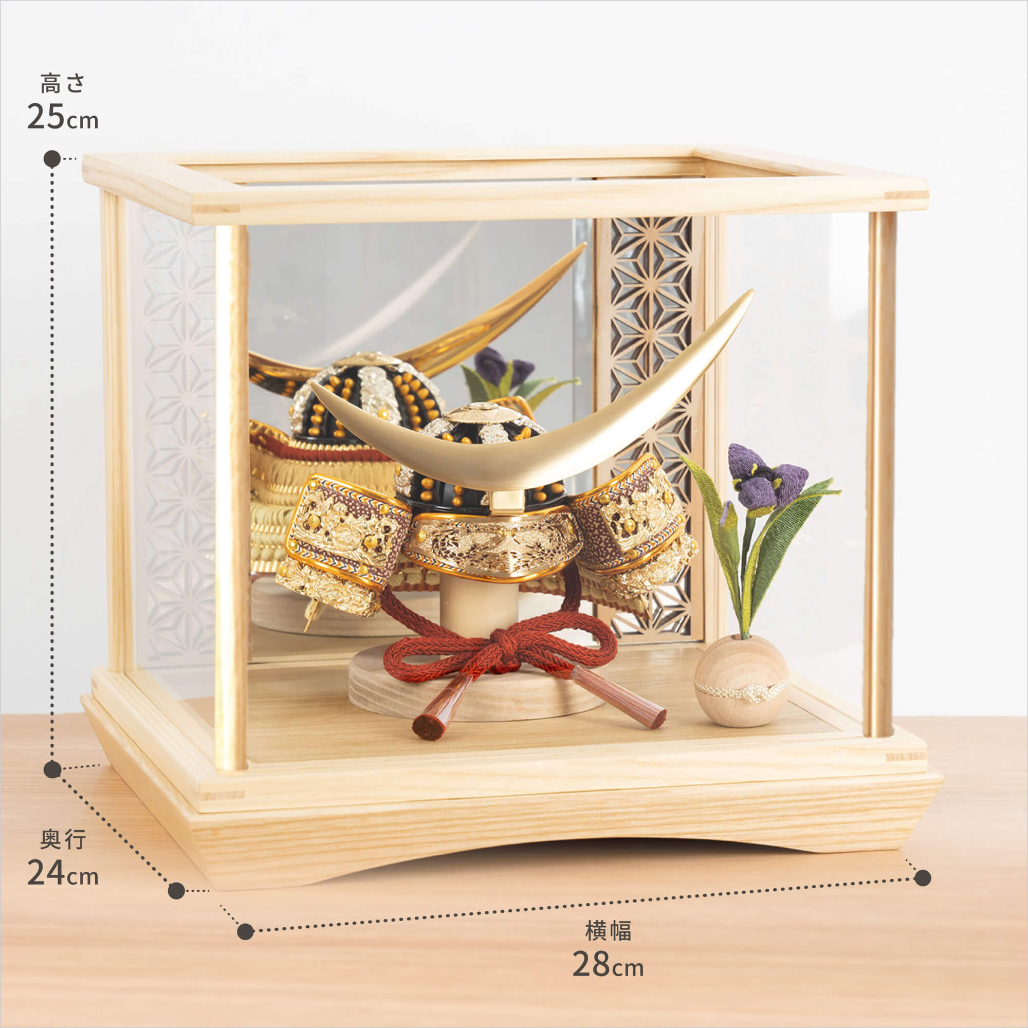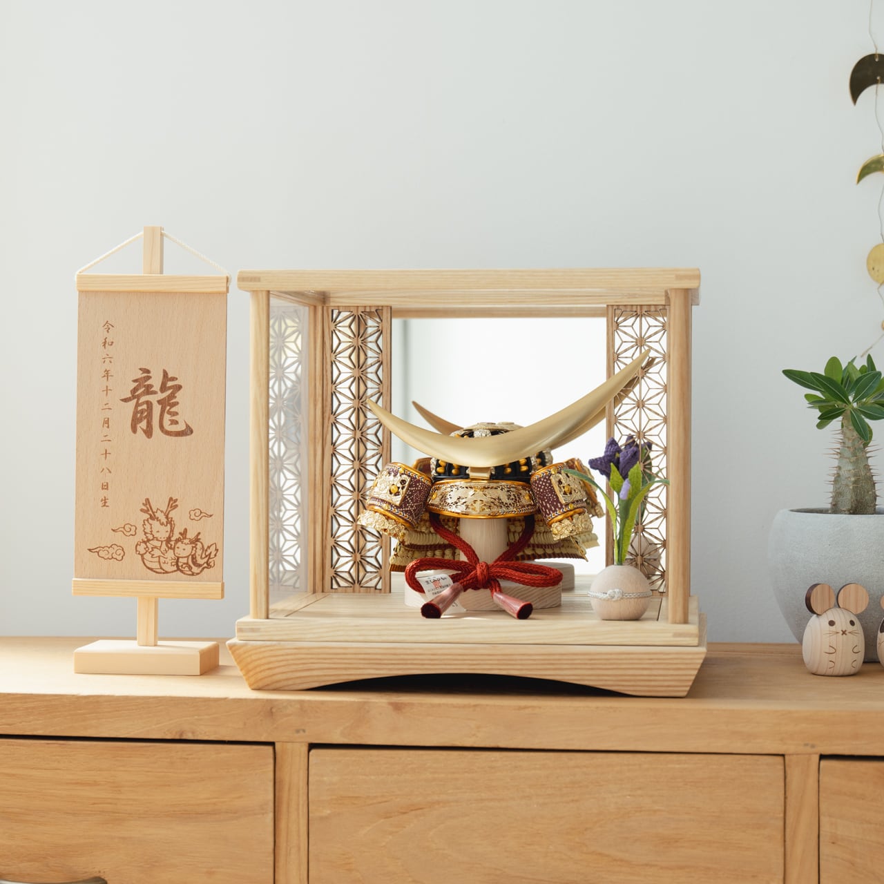 精巧な戦国兜の凛として強く美しい佇まいを天然木の優しいぬくもりが包み込む・・・まるで男の子の成長を温かく見守る家族の様に・・・そんなコンセプトから生まれた兜は、てづくり工房「木都」と甲冑工房「悠雅」のコラボレーションから生まれました。親しみやすく、お子様と一緒に飾れるKOTO×悠雅コラボ兜です。※ 細かい部品が含まれています。3歳未満のお子様は、保護者の方と一緒にお遊びください。選び抜いた素材と手間をかけた技法でつくる兜鉢選び抜いた素材と手間をかけた技法でつくる兜鉢KOTO×悠雅コラボ兜の兜鉢は、伝統的な本式の合せ鉢という技法でつくられています。本式の合せ鉢とは、戦国時代に頭部を守るために考案され、三角状の鉢部品を重ね合わせ、多数の星鋲をカシメる事で強度を高める技法です。選び抜いた素材と手間をかけた技法でつくる「庇」選び抜いた素材と手間をかけた技法でつくる「庇」兜の裏側にあたる庇は、甲州印伝革を使用し伝統的な技術で1つ1つ手作りで丁寧に作られています。選び抜いた素材と手間をかけた技法でつくる「小札」選び抜いた素材と手間をかけた技法でつくる「小札」小札は、細かい天然繊維である本物の絹糸を使用した正絹で結び合わせ繋げております。伝統的な兜をモダンに仕上げたシンプルなデザイン伝統的な兜をモダンに仕上げたシンプルなデザイン伝統的な製法で作られた兜に天然木の素材を活かしたシンプルなデザインの兜です。モダンでシンプルなデザインは、どんなお部屋の雰囲気にもピッタリ。コンパクトでちょうどいいサイズコンパクトでちょうどいいサイズ今どきのおうちに合わせたコンパクトなサイズに仕上げました。飾るスペースが狭くなりがちなマンションや子ども部屋にもぴったり。健やかな成長への願いを込めた麻の葉文様健やかな成長への願いを込めた麻の葉文様古来からの日本伝統の吉祥文様である麻の葉文様。麻の丈夫さ・成長の早さにあやかり、お子さまの健やかな成長への願いが込められています。兜の由来〜伊達正宗兜の由来〜伊達正宗妙見信仰という宗教は星や月、太陽などを神とあがめていました。伊達はその中でも月派で三日月にした理由は戦の邪魔にならないようにといわれています。ケースでも手にとって欲しいこだわりの兜ケースでも手にとって欲しいこだわりの兜木都のケース飾りは、本物の素材や質感を感じながら親子で一緒に手に取って飾る体験をしてほしいから、あえて飾る手間を残しています。手間はかかりますが、伝統的な技法で一つひとつ手づくりしています。お子さまの感性を育む天然木へのこだわりお子さまの感性を育む天然木へのこだわり素材には、タモ、ブナといった天然木を使用。お子さまへの一生に一度の贈り物だから、木都は自然素材の天然木にこだわり続けています。※ 生産時期により使用する素材が一部変更になる場合がございます。熟練の職人による確かな手仕事熟練の職人による確かな手仕事伝統工芸の技術を受け継ぐ日本国内の熟練の職人が、一つひとつ丁寧に手づくりしています。おしゃれなギフト包装でお届けしますおしゃれなギフト包装でお届けします和の雰囲気を感じさせる越前和紙のギフト用ラッピングでお届け。料金がわかるものもお入れしていないので、そのまま贈り物として利用できます。商品レビュー記入でもれなくもらえる天然木のミニ名前札プレゼント商品レビュー記入でもれなくもらえる天然木のミニ名前札プレゼントミニサイズのお名前札 (通常販売価格1,980円) をプレゼント♪商品到着後、商品レビューをご記入の上、商品と同梱のチラシ記載のQRコードから応募フォームへ必要事項をご入力ください。店舗よりレビュー特典を発送いたします。※ お名前札の生年月日の表記は和暦となります。(例:令和七年)商品のご注文へ収納方法とセット内容兜・鍬形・芯木・菖蒲・ケース素材:タモ重量:2,120g (兜のみ 200g)サイズ:W280mm × D240mm × H250mm梱包時:W340mm × D280mm × H275mm兜のみ:約 W150mm × D110mm × H150mm収納方法鍬形は専用袋に入れ、兜は風呂敷に包みます。その他の部品は不織布に入れ収納してください。兜置きの下台とポールは組み立ててご利用ください。兜などを保管する箱は木のケースに入れて収納することが出来ます。注意事項甲冑について飾り付ける際に必ず手袋をご使用ください。錆や変色などの予防にもなります。本品の上には絶対に乗らないでください。本品または本品の部品は装飾品です。他の目的に使用しないで下さい。部品には小さなものがございます。お子様がお口に入れないようにご注意いください。木製品について色合いなど実際のものと写真とでは多少の誤差が生じる場合がございます。また、手作りであり天然木を使用している為、多少の仕様の変化や風合いがひとつひとつ異なります。あらかじめご了承ください。部品には小さなものがございます。お子様がお口に入れないようにご注意いください。