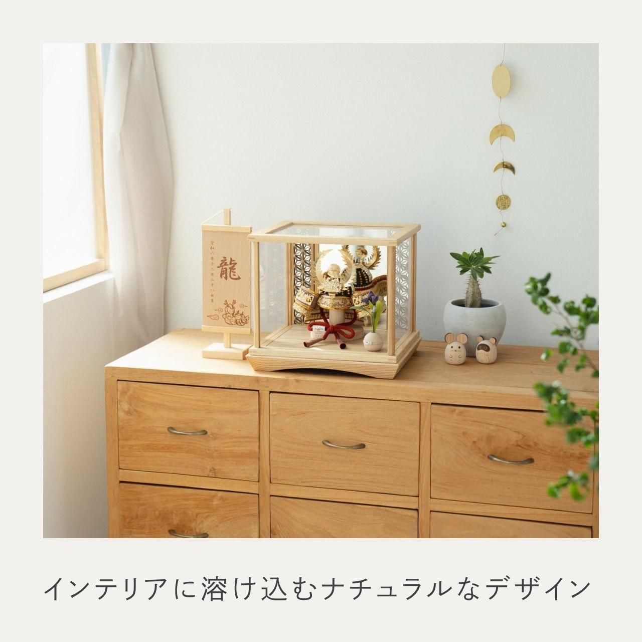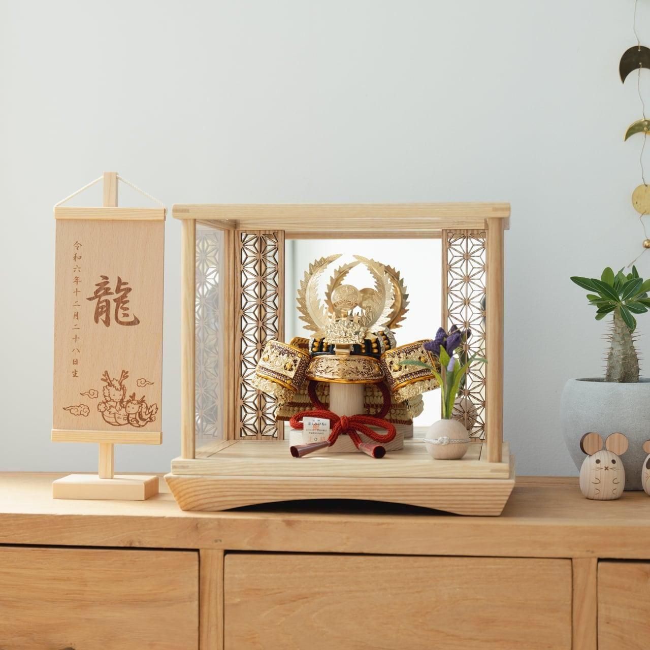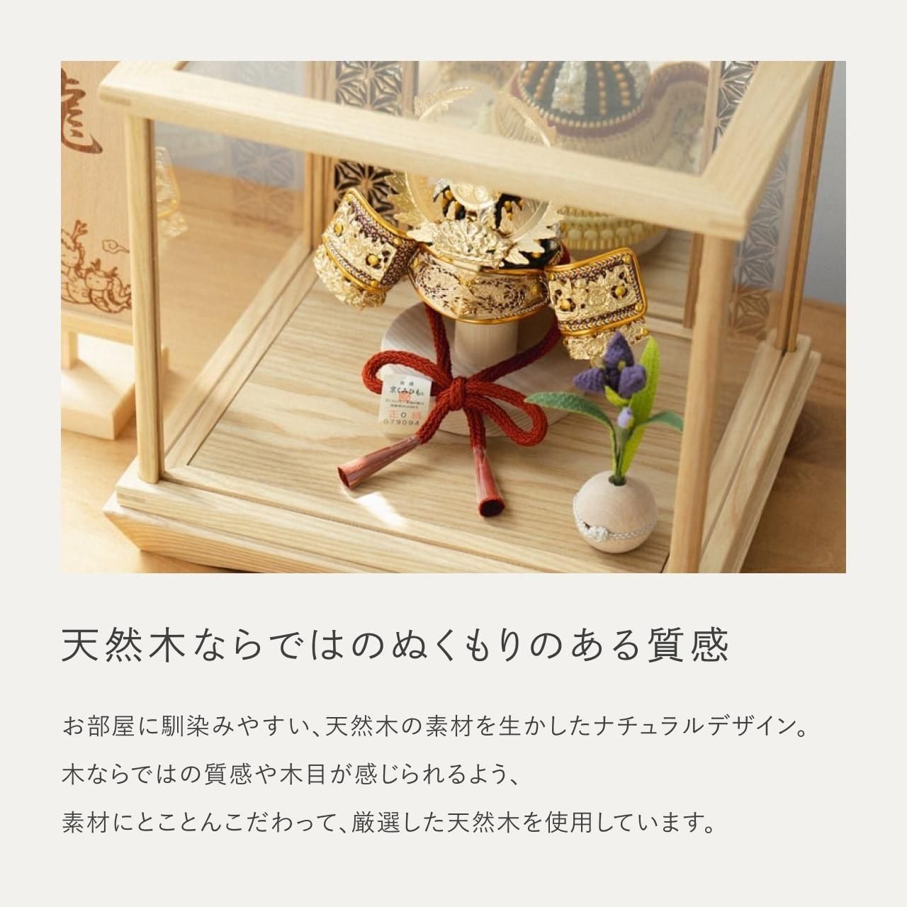 精巧な戦国兜の凛として強く美しい佇まいを天然木の優しいぬくもりが包み込むてづくり工房「木都」の兜ケース。伝統工芸の技術、裏側や後ろ側、内部の見えない箇所、素材にまでこだわり抜いた甲冑工房「悠雅」の兜飾り。ケースでも手にとって欲しい、お子様と一緒に飾れるKOTO×悠雅コラボ兜です。※ 細かい部品が含まれています。3歳未満のお子様は、保護者の方と一緒にお遊びください。選び抜いた素材と手間をかけた技法でつくる兜鉢選び抜いた素材と手間をかけた技法でつくる兜鉢KOTO×悠雅コラボ兜の兜鉢は、伝統的な本式の合せ鉢という技法でつくられています。本式の合せ鉢とは、戦国時代に頭部を守るために考案され、三角状の鉢部品を重ね合わせ、多数の星鋲をカシメる事で強度を高める技法です。選び抜いた素材と手間をかけた技法でつくる「庇」選び抜いた素材と手間をかけた技法でつくる「庇」兜の裏側にあたる庇は、甲州印伝革を使用し伝統的な技術で1つ1つ手作りで丁寧に作られています。選び抜いた素材と手間をかけた技法でつくる「小札」選び抜いた素材と手間をかけた技法でつくる「小札」小札は、細かい天然繊維である本物の絹糸を使用した正絹で結び合わせ繋げております。伝統的な兜をモダンに仕上げたシンプルなデザイン伝統的な兜をモダンに仕上げたシンプルなデザイン伝統的な製法で作られた兜に天然木の素材を活かしたシンプルなデザインの兜です。モダンでシンプルなデザインは、どんなお部屋の雰囲気にもピッタリ。コンパクトでちょうどいいサイズコンパクトでちょうどいいサイズ今どきのおうちに合わせたコンパクトなサイズに仕上げました。飾るスペースが狭くなりがちなマンションや子ども部屋にもぴったり。日本の伝統柄 麻の葉日本の伝統柄 麻の葉鏡には良い気を増幅させたり、悪い気を跳ね返したりする効果があると考えられています。また麻の葉飾りには、麻の丈夫さや成長の早さにあやかり、子供の健やかな成長の願いが込められています。兜の由来〜徳川家康兜の由来〜徳川家康家康の兜飾りはシダをあしらっています。シダは常緑樹で枯れないので繁栄と長寿の意味がこめられています。ケースでも手にとって欲しいこだわりの兜ケースでも手にとって欲しいこだわりの兜通常ケースタイプの商品は「取り付け型」と言われ飾る手間を省くために設置箇所が固定されています。本兜は、あえて飾る手間を残し本物の素材や質感をお子様とご一緒に手にとって飾る体験をしてもらいたい為、設置箇所は固定されておりません。また、上部、前、左右にはガラスではなくアクリル板が設置されていますので、万が一の際も安心です。お子さまの感性を育む天然木へのこだわりお子さまの感性を育む天然木へのこだわり素材には、タモ、ブナといった天然木を使用。お子さまへの一生に一度の贈り物だから、木都は自然素材の天然木にこだわり続けています。※ 生産時期により使用する素材が一部変更になる場合がございます。熟練の職人による確かな手仕事熟練の職人による確かな手仕事伝統工芸の技術を受け継ぐ日本国内の熟練の職人が、一つひとつ丁寧に手づくりしています。おしゃれなギフト包装でお届けしますおしゃれなギフト包装でお届けします和の雰囲気を感じさせる越前和紙のギフト用ラッピングでお届け。料金がわかるものもお入れしていないので、そのまま贈り物として利用できます。商品レビュー記入でもれなくもらえる天然木のミニ名前札プレゼント商品レビュー記入でもれなくもらえる天然木のミニ名前札プレゼントミニサイズのお名前札 (通常販売価格1,980円) をプレゼント♪商品到着後、商品レビューをご記入の上、商品と同梱のチラシ記載のQRコードから応募フォームへ必要事項をご入力ください。店舗よりレビュー特典を発送いたします。※ お名前札の生年月日の表記は和暦となります。(例:令和七年)商品のご注文へ収納方法とセット内容兜・鍬形・芯木・菖蒲・ケース素材:タモ重量:2,120g (兜のみ 200g)サイズ:W280mm × D240mm × H250mm梱包時:W340mm × D280mm × H275mm兜のみ:約 W150mm × D110mm × H150mm収納方法鍬形は専用袋に入れ、兜は風呂敷に包みます。その他の部品は不織布に入れ収納してください。兜置きの下台とポールは組み立ててご利用ください。兜などを保管する箱は木のケースに入れて収納することが出来ます。注意事項甲冑について飾り付ける際に必ず手袋をご使用ください。錆や変色などの予防にもなります。本品の上には絶対に乗らないでください。本品または本品の部品は装飾品です。他の目的に使用しないで下さい。部品には小さなものがございます。お子様がお口に入れないようにご注意いください。木製品について色合いなど実際のものと写真とでは多少の誤差が生じる場合がございます。また、手作りであり天然木を使用している為、多少の仕様の変化や風合いがひとつひとつ異なります。あらかじめご了承くださ