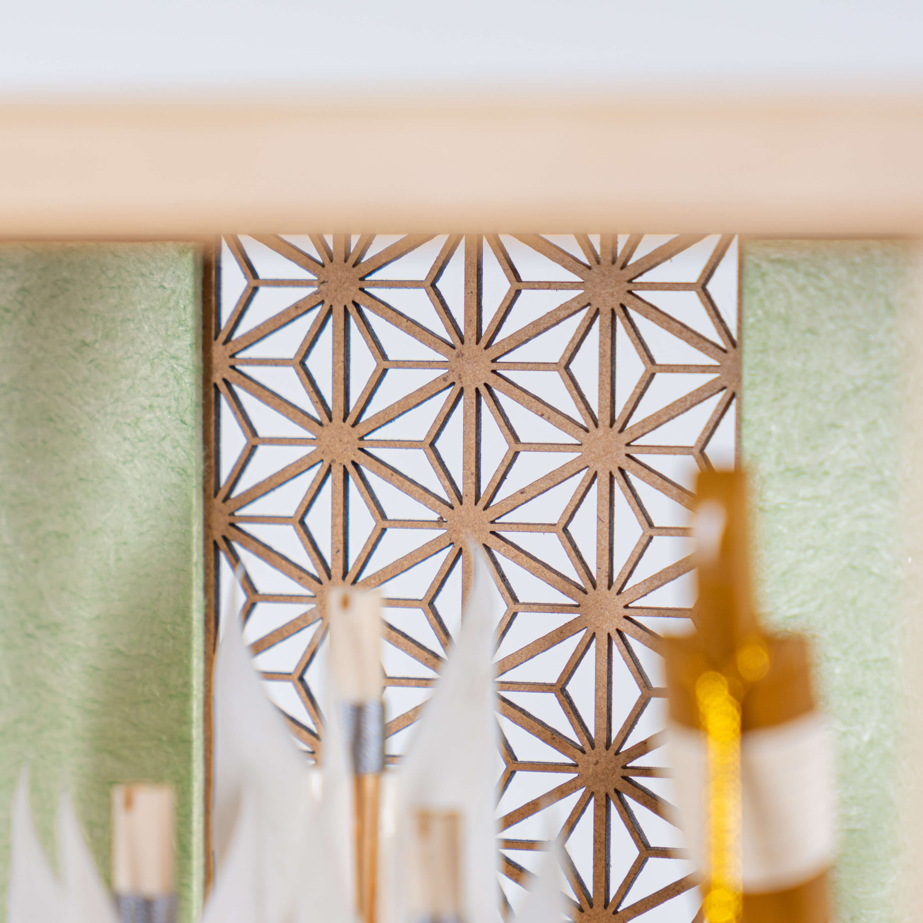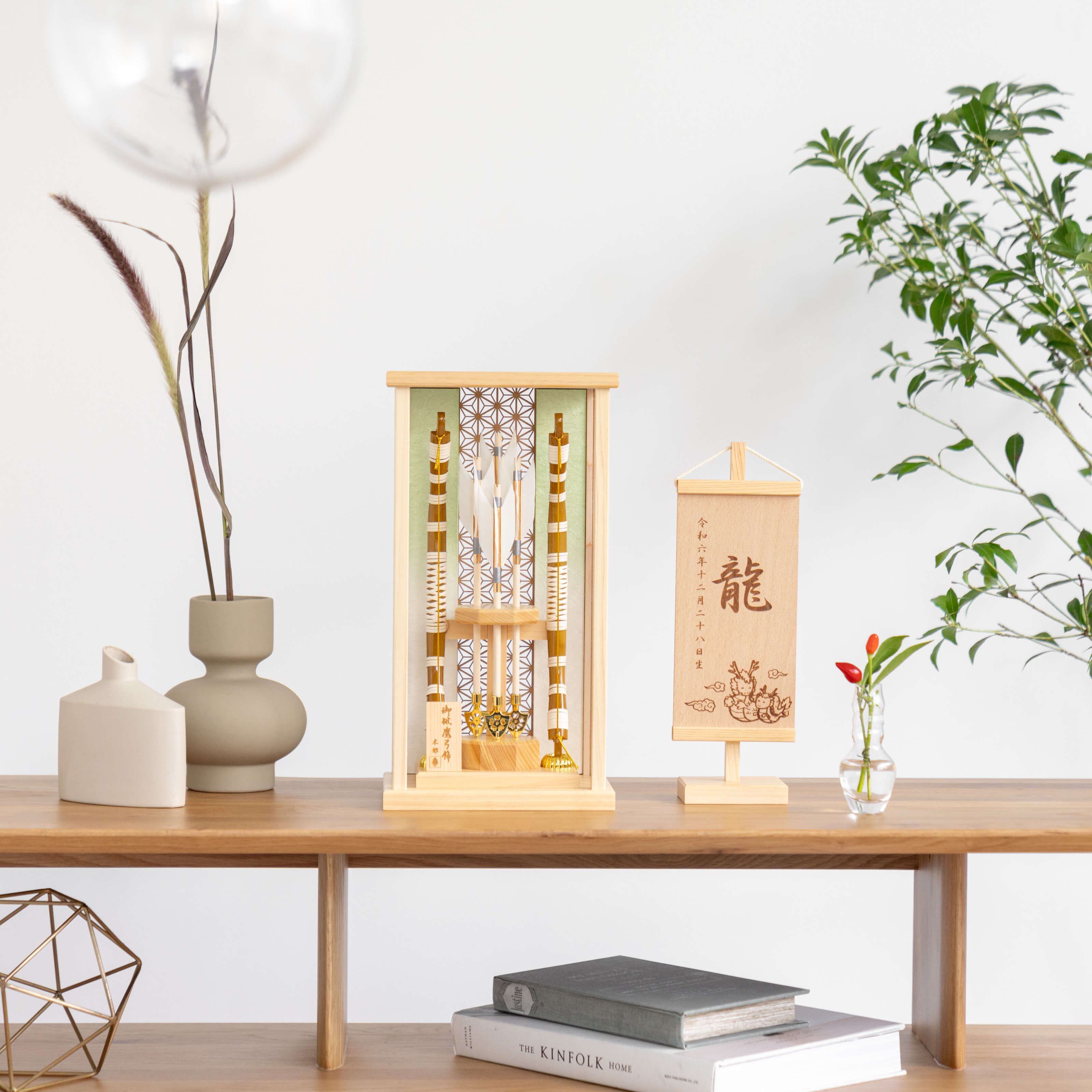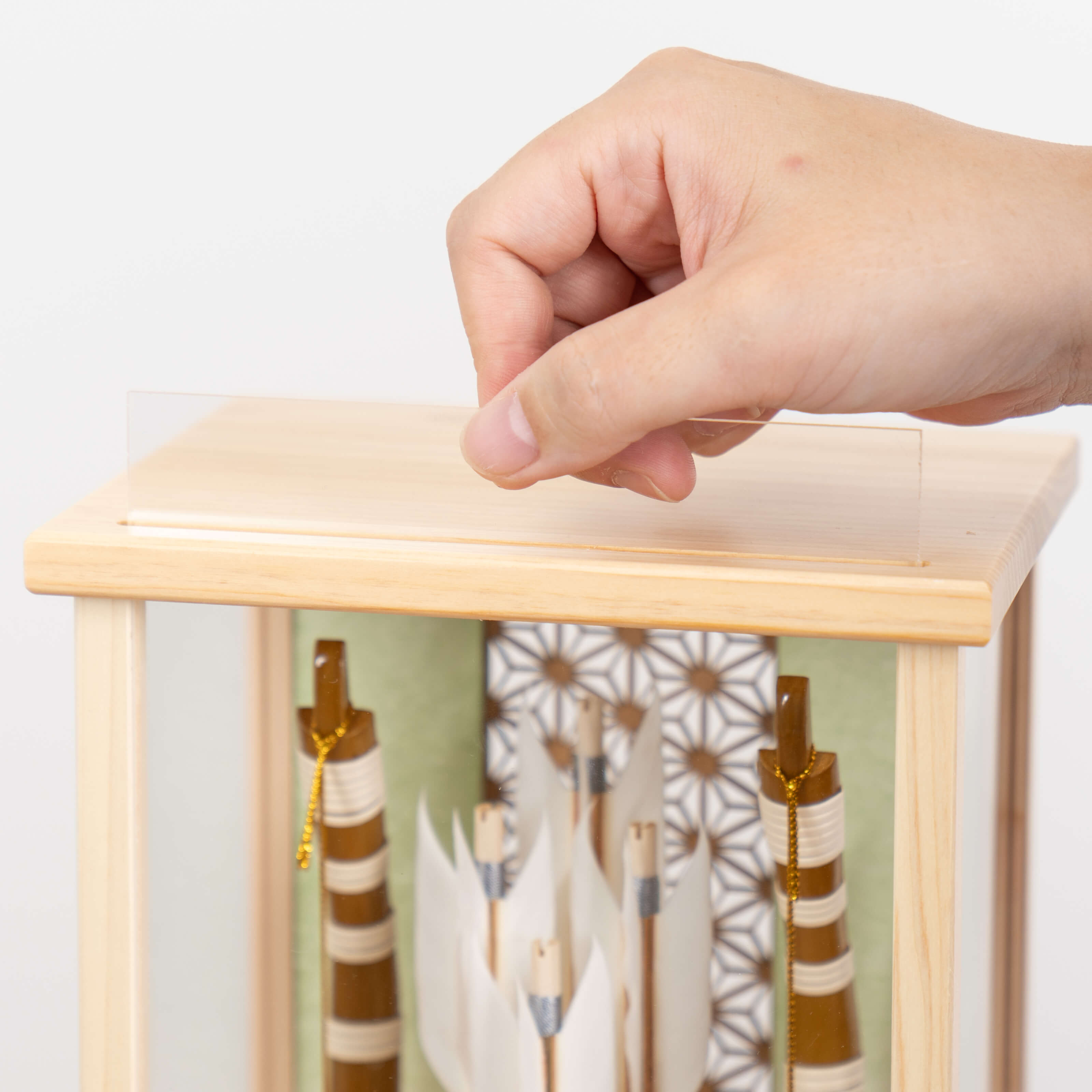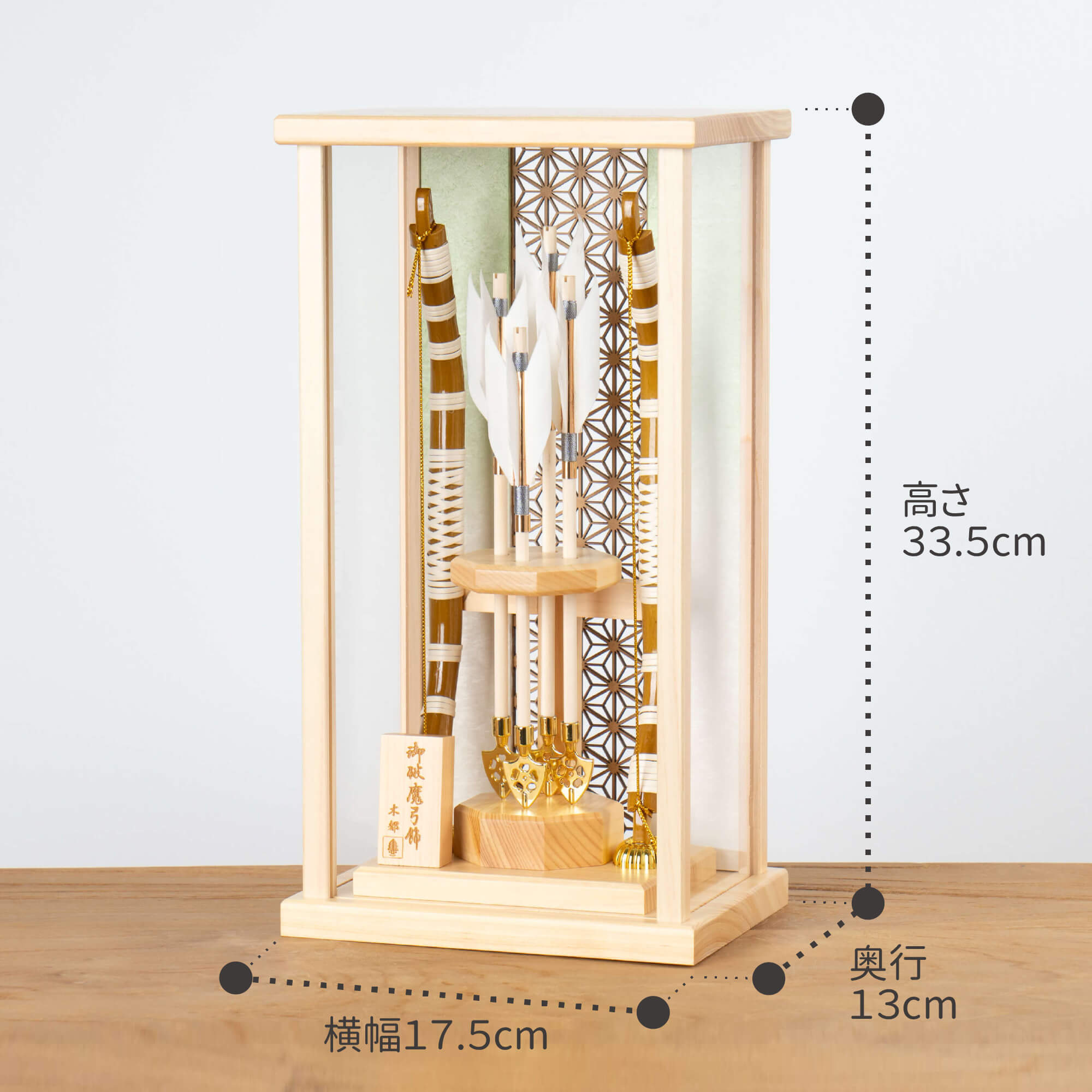 破魔弓は、魔よけ、厄払いのお守りです。男の子の元気な成長を願いお正月の縁起の祝い物となっています。古来からの行事であった新春の年占いや厄払いがその始まりです。男の子が弓矢で的を射て年占いをしたのがのちに破魔弓となりました。そんな破魔弓をてづくり工房「木都」の職人が、伝統工芸の技術と天然木の素材を活かし、真心込めて1つ1つ丁寧につくりました。コンパクトでちょうどいいサイズコンパクトでちょうどいいサイズ今どきのおうちに合わせたコンパクトなサイズに仕上げました。飾るスペースが狭くなりがちなマンションや子ども部屋にもぴったり。お部屋のイメージに調和するデザインお部屋のイメージに調和するデザイン天然木の素材を活かしたシンプルなデザインだから、お部屋の雰囲気にもピッタリ。新しくなったケース新しくなったケースお客様の声をもとにケース前面のアクリル板を取り外し可能なデザインにリニューアルしました。天然木の素材ならではの温もりをより深く感じることができます。男の子の成長を願って男の子の成長を願って破魔弓には、矢を弓で「射る」という特性から、チャンスを射止めることにご利益があると言われています。四本の矢は四神 (東の青龍・西の白虎・南の朱雀・北の玄武) を表しており、東西南北からの厄災に備えるという意味が込められています。日本の伝統工芸 天然羽根日本の伝統工芸 天然羽根ことの破魔弓には伝統的な天然羽根が使用されています。天然羽根は軽くて、しなやかな素材のため古くから高価な伝統工芸品の素材として重宝されています。日本の伝統工芸 越前和紙日本の伝統工芸 越前和紙ことの破魔弓には、美しさと丈夫さで、古くから最高品質の和紙として知られてきた福井県越前市の伝統的工芸品『越前和紙』が使用されています。日本の伝統柄 麻の葉日本の伝統柄 麻の葉模様は、麻の葉と呼ばれています。麻の丈夫さ・成長の早さにあやかり、子供の健やかな成長の願いが込められています。お子さまの感性を育む天然木へのこだわりお子さまの感性を育む天然木へのこだわり素材には、タモ、竹といった天然木を使用。お子さまへの一生に一度の贈り物だから、木都は自然素材の天然木にこだわり続けています。※ 生産時期により使用する素材が一部変更になる場合がございます。天然木が織りなす唯一無二の風合い天然木が織りなす唯一無二の風合い様々な種類の木材を組み合わせることで、それぞれの良さを活かした破魔弓に仕上げました。タモ均一で美しい木目が特徴。弾力性と強度を持ち合わせており、耐久性があります。桧日本の伝統的な最高級木材として知られる桧。特有の香りにはリラックス効果や抗菌、防虫作用があります。 湿気にも強く、耐久性に優れています。竹軽量でありながら非常に高い強度を持っています。表面は滑らかで光沢があり、自然な美しさを放ちます。まゆみ硬さとしなやかさを持ち合わせ、弓の素材として使われます。均一で細かい木目の美しさが特徴です。熟練の職人による確かな手仕事熟練の職人による確かな手仕事伝統工芸の技術を受け継ぐ日本国内の熟練の職人が、一つひとつ丁寧に手づくりしています。おしゃれなギフト包装でお届けしますおしゃれなギフト包装でお届けします和の雰囲気を感じさせる越前和紙のギフト用ラッピングでお届け。料金がわかるものもお入れしていないので、そのまま贈り物として利用できます。収納方法とセット内容破魔弓素材:タモ・竹・ひのき重量:880g サイズ:W175mm × D130mm × H335mm梱包時:W220mm × D140mm × H360mm※ 本商品に名前旗は付属しておりません。別途お買い求めください。注意事項色合いなど実際のものと写真とでは多少の誤差が生じる場合がございます。また、手作りであり天然木を使用している為、多少の仕様の変化や風合いがひとつひとつ異なります。あらかじめご了承ください。材質により木の刻印の濃淡に差が生じますが不良品ではございません。木製品である限り自然なこととご承知下さいませ。保管場所は変色やカビ、サビの原因になりますので湿気の少ない場所・直射日光の当たらない場所に保管してください。本商品に名前旗は付属しておりません。別途お買い求めください。ご不明点がございましたら > お問い合わせページ からご相談ください。 型番 0206 ことの破魔弓 ひのき麻の葉 だいち ¥31,000税込 送料無料(一部離島を除く) 行燈別売 ¥11,000 あわせて購入 名前旗 雛人形や五月人形とご一緒に コンパクトサイズの雛人形や五月人形と一緒に飾るのにぴったりな名前旗です。5つのカラーと3種類のデザインをお好みでお選びいただけます。 商品情報へ 行燈付き商品の場合は行燈に名入れいたします。ご注文の際は備考欄にお名前・フリガナ・生年月日をご記入ください。空欄の場合は柄のみでお作りさせて頂きます。 sold out 特定商取引法に基づく表記(返品等) レビューを見る 0 レビューを投稿 関連記事 あ