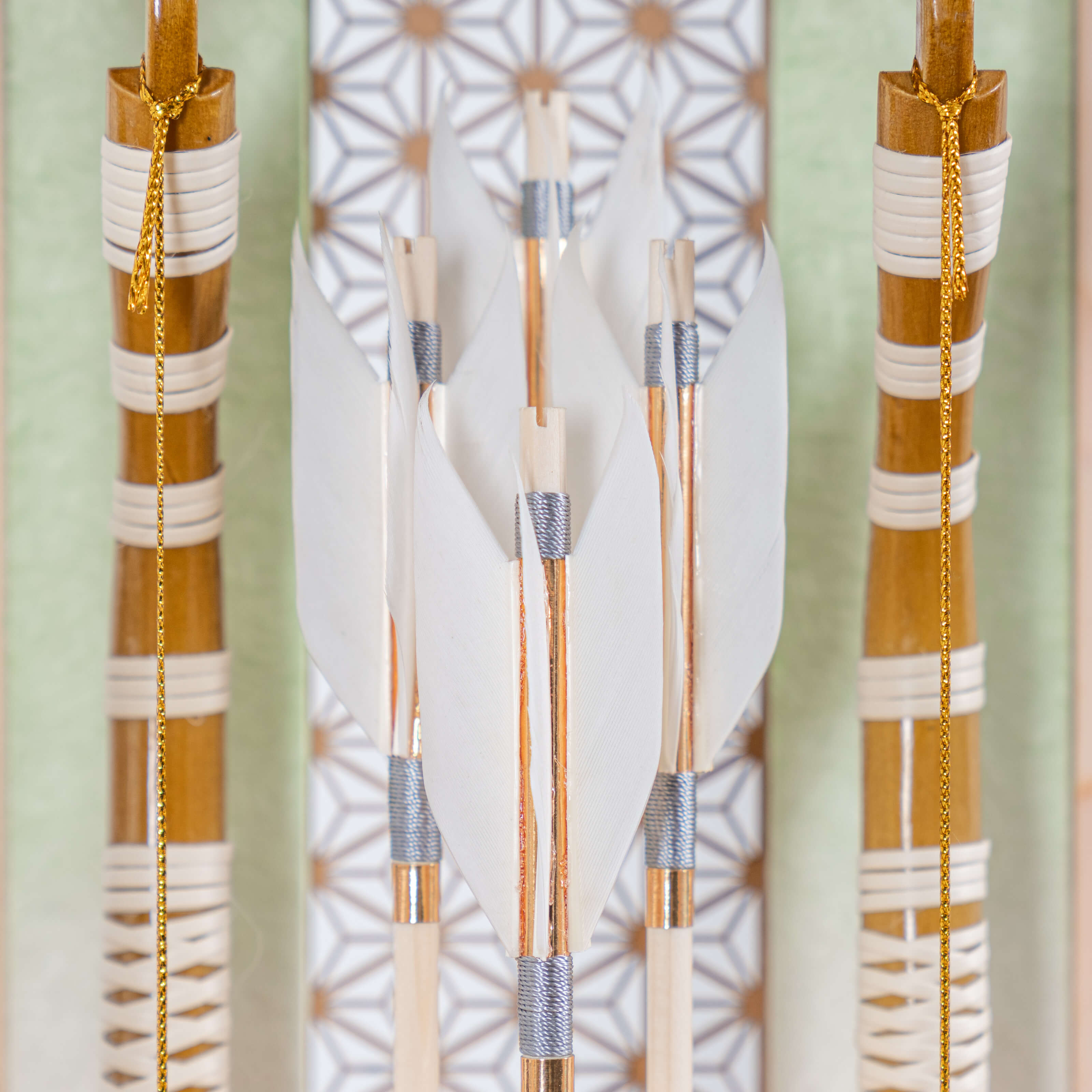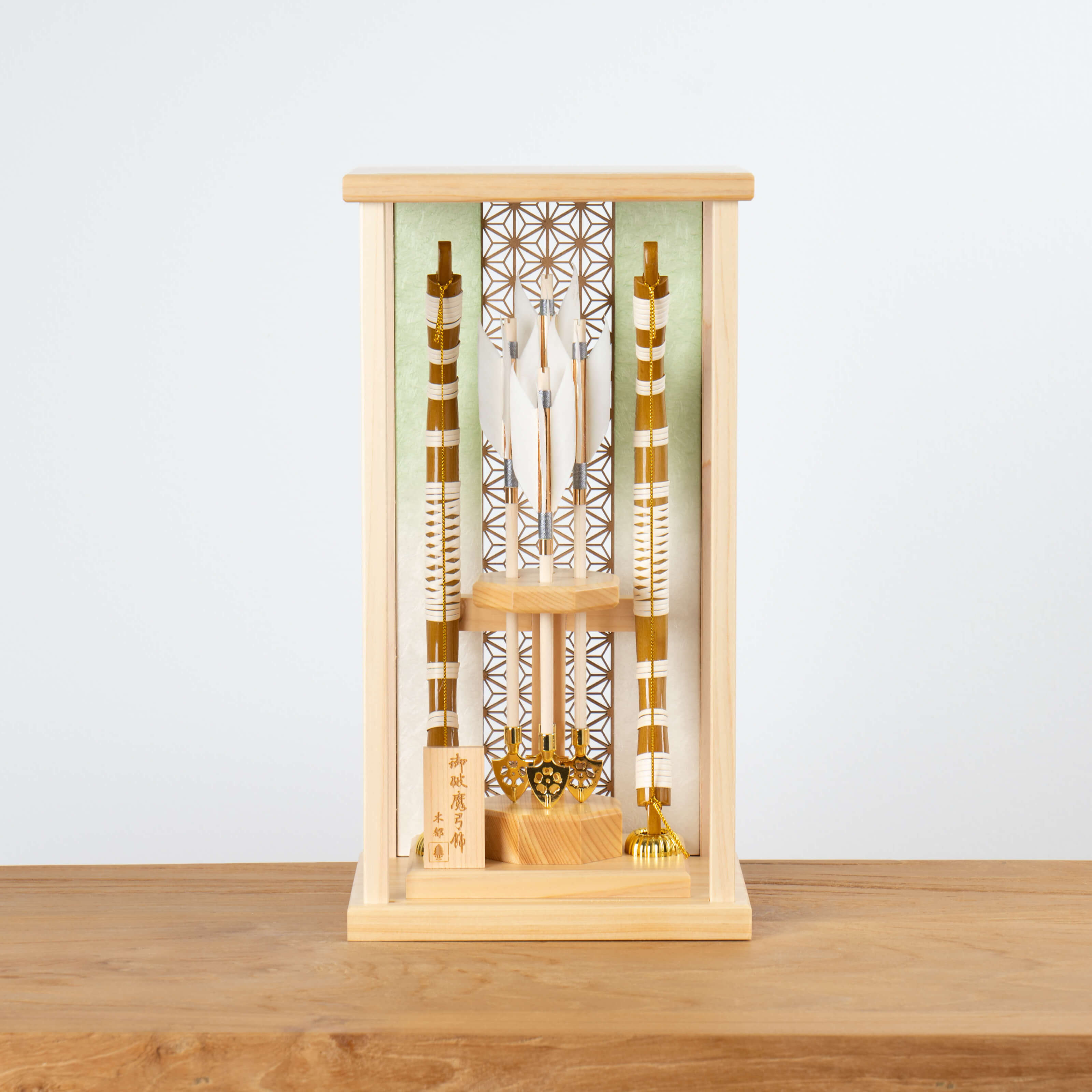 男の子の成長を願って破魔弓には、矢を弓で「射る」という特性から、チャンスを射止めることにご利益があると言われています。四本の矢は四神 (東の青龍・西の白虎・南の朱雀・北の玄武) を表しており、東西南北からの厄災に備えるという意味が込められています。