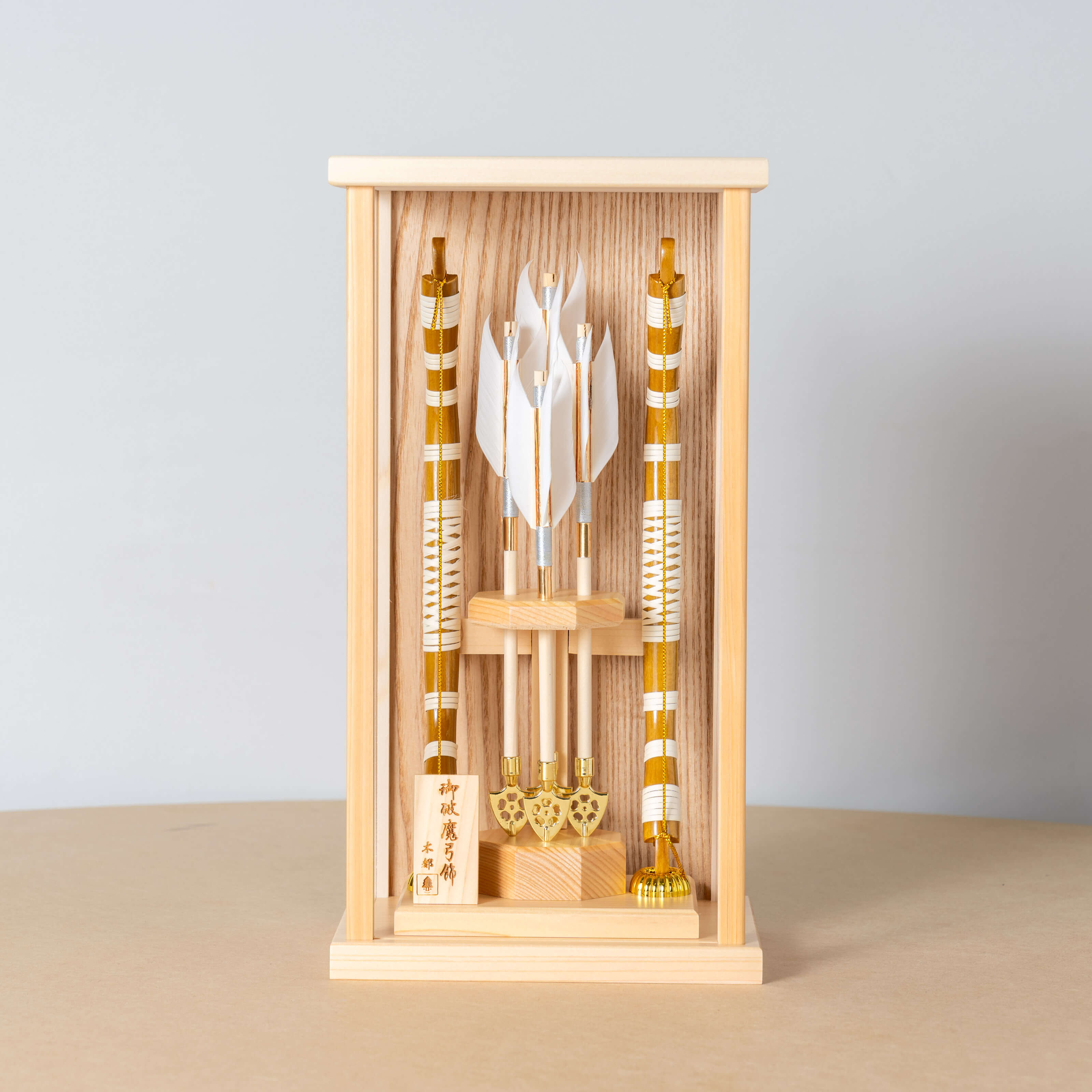 男の子の成長を願って破魔弓には、矢を弓で「射る」という特性から、チャンスを射止めることにご利益があると言われています。四本の矢は四神 (東の青龍・西の白虎・南の朱雀・北の玄武) を表しており、東西南北からの厄災に備えるという意味が込められています。