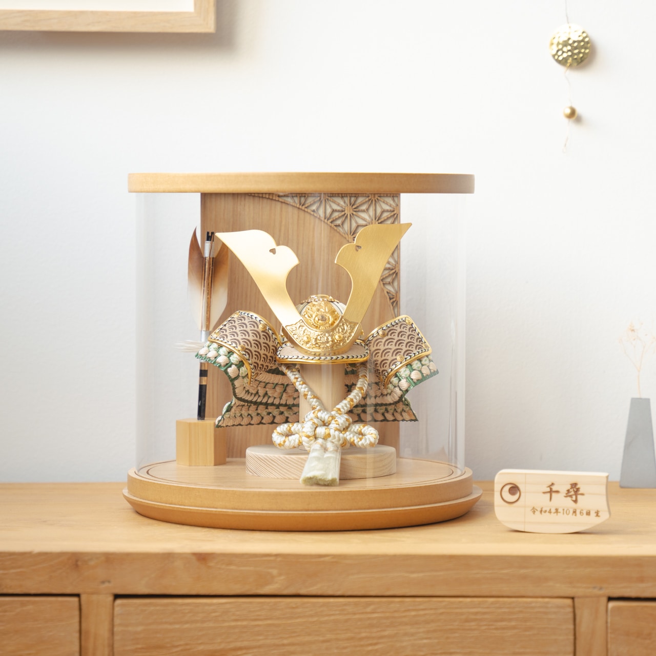 実際に手に取ると天然木の素材ならではの優しいぬくもりが伝わります。てづくり工房「木都」の職人が、伝統工芸の技術と天然木の素材を活かし、真心込めて1つ1つ丁寧につくりました。親しみやすく、お子様と一緒に飾れることのオリジナル兜です。※ 細かい部品が含まれています。3歳未満のお子様は、保護者の方と一緒にお遊びください。コンパクトでちょうどいいサイズコンパクトでちょうどいいサイズ今どきのおうちに合わせたコンパクトなサイズに仕上げました。飾るスペースが狭くなりがちなマンションや子ども部屋にもぴったり。伝統的な兜をモダンに仕上げたシンプルなデザイン伝統的な兜をモダンに仕上げたシンプルなデザイン伝統的な製法で作られた兜に天然木の素材を活かしたシンプルなデザインの兜です。モダンでシンプルなデザインは、どんなお部屋の雰囲気にもピッタリ。選び抜いた素材と手間をかけた技法でつくる兜鉢選び抜いた素材と手間をかけた技法でつくる兜鉢ことのオリジナル兜の兜鉢は、伝統的な本式の合せ鉢という技法でつくられています。本式の合せ鉢とは、戦国時代に頭部を守るために考案され、三角状の鉢部品を重ね合わせ、多数の星鋲をカシメる事で強度を高める技法です。こだわりの素材と手間をかけた技法でつくる「兜」こだわりの素材と手間をかけた技法でつくる「兜」従来の取り付け型のケース兜は、鉢の素材がプラスチックなど作りが安価な兜が多いのですが、当社の本兜は、デザイン性を有しながらも本来の伝統的な手間をかけた「兜」となっています。健やかな成長への願いを込めた麻の葉文様健やかな成長への願いを込めた麻の葉文様古来からの日本伝統の吉祥文様である麻の葉文様。麻の丈夫さ・成長の早さにあやかり、お子さまの健やかな成長への願いが込められています。こだわりの円柱形ケースこだわりの円柱形ケース角をなくし丸みをつけた円柱型のケースは従来のケースにある柱がない為、中に飾る兜がより見やすくなっております。お子さまの感性を育む天然木へのこだわりお子さまの感性を育む天然木へのこだわり素材には、タモ、ブナといった天然木を使用。お子さまへの一生に一度の贈り物だから、木都は自然素材の天然木にこだわり続けています。※ 生産時期により使用する素材が一部変更になる場合がございます。熟練の職人による確かな手仕事熟練の職人による確かな手仕事伝統工芸の技術を受け継ぐ日本国内の熟練の職人が、一つひとつ丁寧に手づくりしています。おしゃれなギフト包装でお届けしますおしゃれなギフト包装でお届けします和の雰囲気を感じさせる越前和紙のギフト用ラッピングでお届け。料金がわかるものもお入れしていないので、そのまま贈り物として利用できます。商品レビュー記入でもれなくもらえる天然木のミニ名前札プレゼント商品レビュー記入でもれなくもらえる天然木のミニ名前札プレゼントミニサイズのお名前札 (通常販売価格1,980円) をプレゼント♪商品到着後、商品レビューをご記入の上、商品と同梱のチラシ記載のQRコードから応募フォームへ必要事項をご入力ください。店舗よりレビュー特典を発送いたします。※ お名前札の生年月日の表記は和暦となります。(例:令和七年)商品のご注文へ収納方法とセット内容兜・鍬形・芯木・ケース素材:タモ重量:1,010g (兜のみ 150g)サイズ:W240mm × D210mm × H225mm梱包時:W245mm × D265mm × H360mm兜のみ:約 W150mm × D110mm × H150mm注意事項本品は、金属をふんだんに使用しております。取り扱われる方の人体にすり傷、切り傷、刺傷を及ぼす場合がございますので、左記注意事項をよく読んでお取り扱い下さい。甲冑について飾り付ける際に必ず手袋をご使用ください。錆や変色などの予防にもなります。本品の上には絶対に乗らないでください。本品または本品の部品は装飾品です。他の目的に使用しないで下さい。部品には小さなものがございます。お子様がお口に入れないようにご注意いください。木製品について色合いなど実際のものと写真とでは多少の誤差が生じる場合がございます。また、手作りであり天然木を使用している為、多少の仕様の変化や風合いがひとつひとつ異なります。あらかじめご了承ください。部品には小さなものがございます。お子様がお口に入れないようにご注意いください。菖蒲には針金が入っております。お好みで角度を調整して下さい。材質により刻印の濃淡に差が生じますが不良品ではございません。木製品である限り自然なこととご承知下さいませ。保管場所は変色やカビ、サビの原因になりますので湿気の少ない場所・直射日光の当たらない場所に保管してください。ご不明点がございましたら > お問い合わせページ からご相談ください。