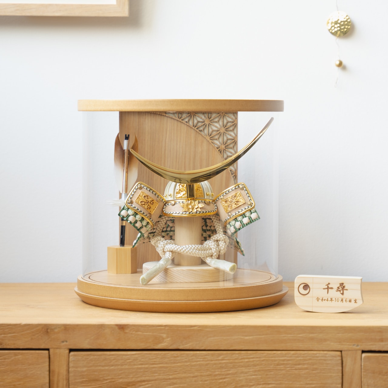実際に手に取ると天然木の素材ならではの優しいぬくもりが伝わります。てづくり工房「木都」の職人が、伝統工芸の技術と天然木の素材を活かし、真心込めて1つ1つ丁寧につくりました。親しみやすく、お子様と一緒に飾れることのオリジナル兜です。※ 細かい部品が含まれています。3歳未満のお子様は、保護者の方と一緒にお遊びください。コンパクトでちょうどいいサイズコンパクトでちょうどいいサイズ今どきのおうちに合わせたコンパクトなサイズに仕上げました。飾るスペースが狭くなりがちなマンションや子ども部屋にもぴったり。伝統的な兜をモダンに仕上げたシンプルなデザイン伝統的な兜をモダンに仕上げたシンプルなデザイン伝統的な製法で作られた兜に天然木の素材を活かしたシンプルなデザインの兜です。モダンでシンプルなデザインは、どんなお部屋の雰囲気にもピッタリ。選び抜いた素材と手間をかけた技法でつくる兜鉢選び抜いた素材と手間をかけた技法でつくる兜鉢ことのオリジナル兜の兜鉢は、伝統的な本式の合せ鉢という技法でつくられています。本式の合せ鉢とは、戦国時代に頭部を守るために考案され、三角状の鉢部品を重ね合わせ、多数の星鋲をカシメる事で強度を高める技法です。こだわりの素材と手間をかけた技法でつくる「兜」こだわりの素材と手間をかけた技法でつくる「兜」従来の取り付け型のケース兜は、鉢の素材がプラスチックなど作りが安価な兜が多いのですが、当社の本兜は、デザイン性を有しながらも本来の伝統的な手間をかけた「兜」となっています。健やかな成長への願いを込めた麻の葉文様健やかな成長への願いを込めた麻の葉文様古来からの日本伝統の吉祥文様である麻の葉文様。麻の丈夫さ・成長の早さにあやかり、お子さまの健やかな成長への願いが込められています。こだわりの円柱形ケースこだわりの円柱形ケース角をなくし丸みをつけた円柱型のケースは従来のケースにある柱がない為、中に飾る兜がより見やすくなっております。お子さまの感性を育む天然木へのこだわりお子さまの感性を育む天然木へのこだわり素材には、タモ、ブナといった天然木を使用。お子さまへの一生に一度の贈り物だから、木都は自然素材の天然木にこだわり続けています。※ 生産時期により使用する素材が一部変更になる場合がございます。熟練の職人による確かな手仕事熟練の職人による確かな手仕事伝統工芸の技術を受け継ぐ日本国内の熟練の職人が、一つひとつ丁寧に手づくりしています。おしゃれなギフト包装でお届けしますおしゃれなギフト包装でお届けします和の雰囲気を感じさせる越前和紙のギフト用ラッピングでお届け。料金がわかるものもお入れしていないので、そのまま贈り物として利用できます。商品レビュー記入でもれなくもらえる天然木のミニ名前札プレゼント商品レビュー記入でもれなくもらえる天然木のミニ名前札プレゼントミニサイズのお名前札 (通常販売価格1,980円) をプレゼント♪商品到着後、商品レビューをご記入の上、商品と同梱のチラシ記載のQRコードから応募フォームへ必要事項をご入力ください。店舗よりレビュー特典を発送いたします。※ お名前札の生年月日の表記は和暦となります。(例:令和七年)商品のご注文へ収納方法とセット内容兜・鍬形・芯木・ケース素材:タモ重量:1,010g (兜のみ 150g)サイズ:W240mm × D210mm × H225mm梱包時:W245mm × D265mm × H360mm兜のみ:約 W150mm × D110mm × H150mm注意事項本品は、金属をふんだんに使用しております。取り扱われる方の人体にすり傷、切り傷、刺傷を及ぼす場合がございますので、左記注意事項をよく読んでお取り扱い下さい。甲冑について飾り付ける際に必ず手袋をご使用ください。錆や変色などの予防にもなります。本品の上には絶対に乗らないでください。本品または本品の部品は装飾品です。他の目的に使用しないで下さい。部品には小さなものがございます。お子様がお口に入れないようにご注意いください。木製品について色合いなど実際のものと写真とでは多少の誤差が生じる場合がございます。また、手作りであり天然木を使用している為、多少の仕様の変化や風合いがひとつひとつ異なります。あらかじめご了承ください。部品には小さなものがございます。お子様がお口に入れないようにご注意いください。菖蒲には針金が入っております。お好みで角度を調整して下さい。材質により刻印の濃淡に差が生じますが不良品ではございません。木製品である限り自然なこととご承知下さいませ。保管場所は変色やカビ、サビの原因になりますので湿気の少ない場所・直射日光の当たらない場所に保管してください。ご不明点がございましたら > お問い合わせページ からご相談ください。