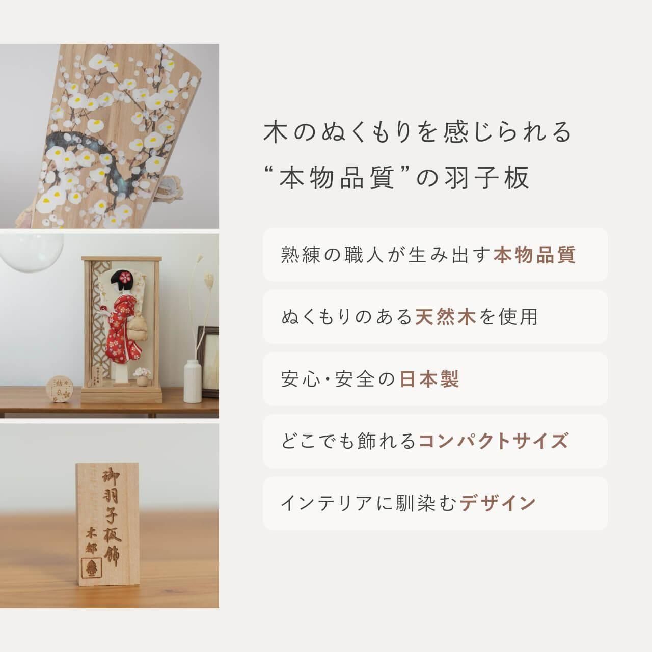 女の子の無病息災のお守りとして飾られる羽子板。熟練の職人が、伝統工芸の技術と天然木の素材を活かし、心を込めて一つひとつ丁寧につくりました。※生産時期や生地のカッティングにより、女の子の後ろのバック板の花柄は変更になる場合がございます。予めご了承ください。コンパクトでちょうどいいサイズコンパクトでちょうどいいサイズ今どきのおうちに合わせたコンパクトなサイズに仕上げました。飾るスペースが狭くなりがちなマンションや子ども部屋にもぴったり。インテリアに溶け込むナチュラルなデザインインテリアに溶け込むナチュラルなデザイン天然木の素材を活かしたシンプルなデザインだから、お部屋の雰囲気にもピッタリ。お衣装へのこだわりお衣装へのこだわりお着物には、桜や梅の柄をあしらっています。桜は豊かさや幸せを、梅は高潔や新しい門出を祝うという意味が込められています。日本の伝統工芸 つまみ細工日本の伝統工芸 つまみ細工江戸時代から伝わる日本の伝統工芸で、小さな布をつまんで様々なモチーフの形を作り、装飾品として仕上げる技法です。お子さまの感性を育む天然木へのこだわりお子さまの感性を育む天然木へのこだわり素材には、タモ、ブナといった天然木を使用。お子さまへの一生に一度の贈り物だから、木都は自然素材の天然木にこだわり続けています。※ 生産時期により使用する素材が一部変更になる場合がございます。天然木が織りなす唯一無二の風合い天然木が織りなす唯一無二の風合い様々な種類の木材を組み合わせることで、それぞれの良さを活かした羽子板に仕上げました。タモ均一で美しい木目が特徴。弾力性と強度を持ち合わせており、耐久性があります。ブナ耐久性が高く長寿のため、家具によく用いられます。明るい色調でインテリアによく馴染みます。桧ひのき特有の香りにはリラックス効果や抗菌、防虫作用があります。湿気にも強く、耐久性に優れています。桐優れた抗菌・防腐効果をもつ成分を含み、高級家具に多く用いられています。上品さのある柔らかな光沢が特徴。熟練の職人による確かな手仕事熟練の職人による確かな手仕事伝統工芸の技術を受け継ぐ日本国内の熟練の職人が、一つひとつ丁寧に手づくりしています。おしゃれなギフト包装でお届けしますおしゃれなギフト包装でお届けします和の雰囲気を感じさせる越前和紙のギフト用ラッピングでお届け。料金がわかるものもお入れしていないので、そのまま贈り物として利用できます。収納方法とセット内容羽子板素材:桐サイズ:W230mm × D185mm × H425mm梱包時:W270mm × D220mm × H470mm※ 本商品に名前旗は付属しておりません。別途お買い求めください。注意事項色合いなど実際のものと写真とでは多少の誤差が生じる場合がございます。また、手作りであり天然木を使用している為、多少の仕様の変化や風合いがひとつひとつ異なります。あらかじめご了承ください。材質により木の刻印の濃淡に差が生じますが不良品ではございません。木製品である限り自然なこととご承知下さいませ。保管場所は変色やカビ、サビの原因になりますので湿気の少ない場所・直射日光の当たらない場所に保管してください。本商品に名前旗は付属しておりません。別途お買い求めください。女の子の後ろのバック板の花柄は状況により変更になる場合がございます。ご了承ください。ご不明点がございましたら > お問い合わせページ からご相談ください。 型番 0182 ことのかほり羽子板 うめ Nケース ¥63,000税込 送料無料(一部離島を除く) 行燈別売 ¥11,000 あわせて購入 名前旗 雛人形や五月人形とご一緒に コンパクトサイズの雛人形や五月人形と一緒に飾るのにぴったりな名前旗です。5つのカラーと3種類のデザインをお好みでお選びいただけます。 商品情報へ 行燈付き商品の場合は行燈に名入れいたします。ご注文の際は備考欄にお名前・フリガナ・生年月日をご記入ください。空欄の場合は柄のみでお作りさせて頂きます。 個 カートに追加 特定商取引法に基づく表記(返品等) レビューを見る 0 レビューを投稿 関連記事 { "pid": "182214566" }
