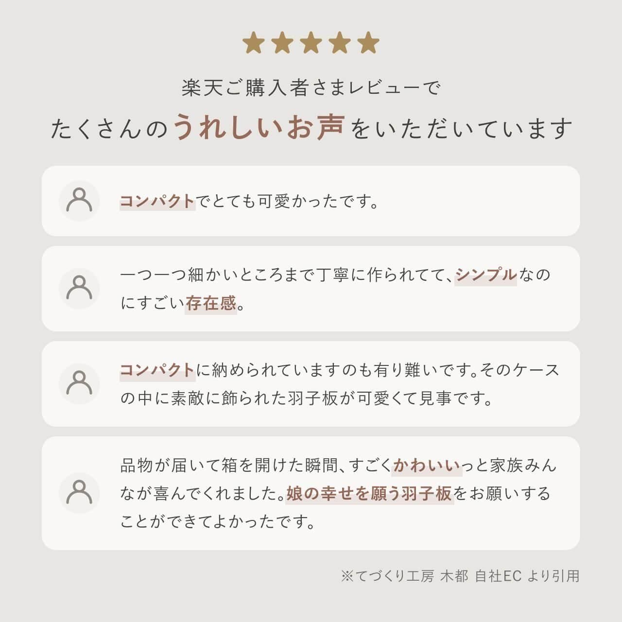 女の子の無病息災のお守りとして飾られる羽子板。熟練の職人が、伝統工芸の技術と天然木の素材を活かし、心を込めて一つひとつ丁寧につくりました。※生産時期や生地のカッティングにより、女の子の後ろのバック板の花柄は変更になる場合がございます。予めご了承ください。コンパクトでちょうどいいサイズコンパクトでちょうどいいサイズ今どきのおうちに合わせたコンパクトなサイズに仕上げました。飾るスペースが狭くなりがちなマンションや子ども部屋にもぴったり。インテリアに溶け込むナチュラルなデザインインテリアに溶け込むナチュラルなデザイン天然木の素材を活かしたシンプルなデザインだから、お部屋の雰囲気にもピッタリ。お衣装へのこだわりお衣装へのこだわりお着物には、桜や梅の柄をあしらっています。桜は豊かさや幸せを、梅は高潔や新しい門出を祝うという意味が込められています。日本の伝統工芸 つまみ細工日本の伝統工芸 つまみ細工江戸時代から伝わる日本の伝統工芸で、小さな布をつまんで様々なモチーフの形を作り、装飾品として仕上げる技法です。お子さまの感性を育む天然木へのこだわりお子さまの感性を育む天然木へのこだわり素材には、タモ、ブナといった天然木を使用。お子さまへの一生に一度の贈り物だから、木都は自然素材の天然木にこだわり続けています。※ 生産時期により使用する素材が一部変更になる場合がございます。天然木が織りなす唯一無二の風合い天然木が織りなす唯一無二の風合い様々な種類の木材を組み合わせることで、それぞれの良さを活かした羽子板に仕上げました。タモ均一で美しい木目が特徴。弾力性と強度を持ち合わせており、耐久性があります。ブナ耐久性が高く長寿のため、家具によく用いられます。明るい色調でインテリアによく馴染みます。桧ひのき特有の香りにはリラックス効果や抗菌、防虫作用があります。湿気にも強く、耐久性に優れています。桐優れた抗菌・防腐効果をもつ成分を含み、高級家具に多く用いられています。上品さのある柔らかな光沢が特徴。熟練の職人による確かな手仕事熟練の職人による確かな手仕事伝統工芸の技術を受け継ぐ日本国内の熟練の職人が、一つひとつ丁寧に手づくりしています。おしゃれなギフト包装でお届けしますおしゃれなギフト包装でお届けします和の雰囲気を感じさせる越前和紙のギフト用ラッピングでお届け。料金がわかるものもお入れしていないので、そのまま贈り物として利用できます。収納方法とセット内容羽子板素材:桐サイズ:W230mm × D185mm × H425mm梱包時:W270mm × D220mm × H470mm※ 本商品に名前旗は付属しておりません。別途お買い求めください。注意事項色合いなど実際のものと写真とでは多少の誤差が生じる場合がございます。また、手作りであり天然木を使用している為、多少の仕様の変化や風合いがひとつひとつ異なります。あらかじめご了承ください。材質により木の刻印の濃淡に差が生じますが不良品ではございません。木製品である限り自然なこととご承知下さいませ。保管場所は変色やカビ、サビの原因になりますので湿気の少ない場所・直射日光の当たらない場所に保管してください。本商品に名前旗は付属しておりません。別途お買い求めください。女の子の後ろのバック板の花柄は状況により変更になる場合がございます。ご了承ください。ご不明点がございましたら > お問い合わせページ からご相談ください。 型番 0183 ことのかほり羽子板 うめ Bケース ¥63,000税込 送料無料(一部離島を除く) 行燈別売 ¥11,000 あわせて購入 名前旗 雛人形や五月人形とご一緒に コンパクトサイズの雛人形や五月人形と一緒に飾るのにぴったりな名前旗です。5つのカラーと3種類のデザインをお好みでお選びいただけます。 商品情報へ 行燈付き商品の場合は行燈に名入れいたします。ご注文の際は備考欄にお名前・フリガナ・生年月日をご記入ください。空欄の場合は柄のみでお作りさせて頂きます。 個 カートに追加 特定商取引法に基づく表記(返品等) レビューを見る 0 レビューを投稿 関連記事 { "pid": "182214571" }