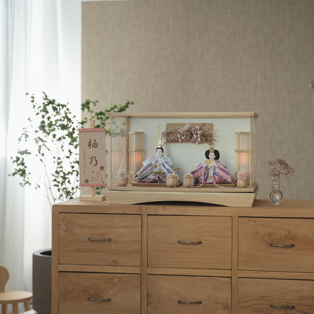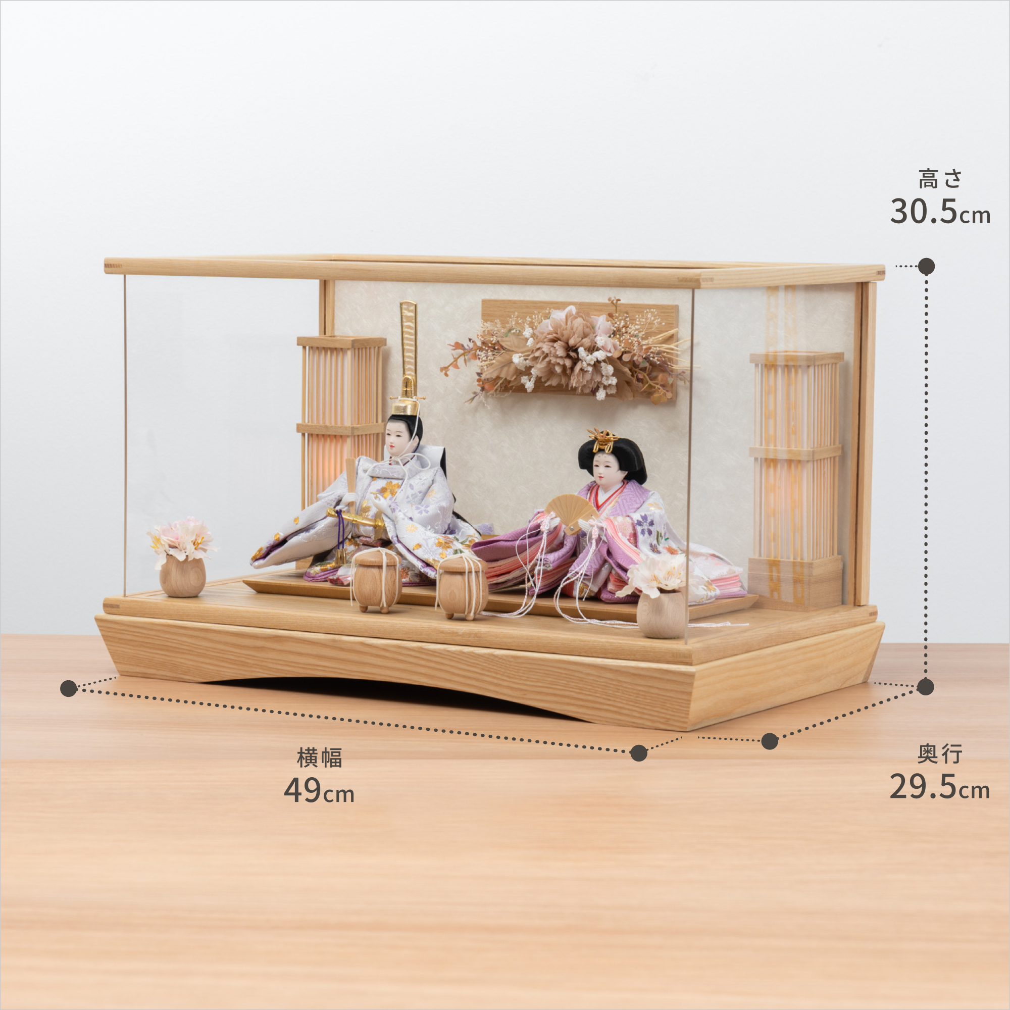 精巧な凛として美しい佇まいを天然木の優しいぬくもりが包み込む・・・まるで女の子の成長を温かく見守る家族の様に・・・そんなコンセプトから生まれた、親しみやすく、お子様と一緒に飾れる「ことの雛人形」です。コンパクトでちょうどいいサイズコンパクトでちょうどいいサイズ今どきのおうちに合わせたコンパクトなサイズに仕上げました。飾るスペースが狭くなりがちなマンションや子ども部屋にもぴったり。お部屋のイメージに調和するデザインお部屋のイメージに調和するデザイン天然木の素材を活かしたシンプルなデザインだから、お部屋の雰囲気にもピッタリ。お衣装へのこだわりお衣装へのこだわり京都西陣織金襴を使用しています。地模様には雪輪紋が入っており、桜の刺繍が施されております。その分、職人の工程も増え手間がかかっています。手作りへのこだわり〜裂地(きれじ)の裁断手作りへのこだわり〜裂地(きれじ)の裁断和紙で衣裳の各種型紙を作り、へり部分にのみ糊をつけ、裂地裏面に貼り付けます。型紙に沿って裁断して衣裳部品を作っていきます。手作りへのこだわり〜縫製手作りへのこだわり〜縫製姫の十二単の唐衣(からぎぬ)・五衣(いつつぎぬ)・単衣(ひとえ)・裾、殿の着物・裾・中袖等、数多くの衣裳部品をミシン、または手縫いで細やかな部分まで縫い合わせ、折り込み仕上げていきます。手作りへのこだわり〜着付け・振付け手作りへのこだわり〜着付け・振付け仕上がった衣裳は両腕を後方に曲げて羽織らせるようにして着付けます。次にそれぞれの人形の形に振付けます。腕を曲げる角度や手の位置などで全体のバランスを取ります。手作りへのこだわり〜頭差し手作りへのこだわり〜頭差し頭さしは最終の人形検品を兼ねて行われます。包まれた顔紙を外し、汚れ等無いことを確認します。頭と衣紋の中心線が一直線になるように差し込みます。ことのお雛様ことのお雛様お雛様の顔は時代とともに人気のお顔があります。ことのお雛様のお顔は時代に左右されない普遍的なシンプルで可愛らしいお顔となっています。ケース飾りでも手に取って本物の質感を感じてほしいケース飾りでも手に取って本物の質感を感じてほしい木都のケース飾りは、本物の素材や質感を感じながら親子で一緒に手に取って飾る体験をしてほしいから、あえて飾る手間を残しています。手間はかかりますが、伝統的な技法で一つひとつ手づくりしています。お子さまの感性を育む天然木へのこだわりお子さまの感性を育む天然木へのこだわり素材には、タモ、ブナといった天然木を使用。お子さまへの一生に一度の贈り物だから、木都は自然素材の天然木にこだわり続けています。※ 生産時期により使用する素材が一部変更になる場合がございます。熟練の職人による確かな手仕事熟練の職人による確かな手仕事伝統工芸の技術を受け継ぐ日本国内の熟練の職人が、一つひとつ丁寧に手づくりしています。おしゃれなギフト包装でお届けしますおしゃれなギフト包装でお届けします和の雰囲気を感じさせる越前和紙のギフト用ラッピングでお届け。料金がわかるものもお入れしていないので、そのまま贈り物として利用できます。商品レビュー記入でもれなくもらえる天然木のミニ名前札プレゼント商品レビュー記入でもれなくもらえる天然木のミニ名前札プレゼントミニサイズのお名前札 (通常販売価格1,980円) をプレゼント♪商品到着後、商品レビューをご記入の上、商品と同梱のチラシ記載のQRコードから応募フォームへ必要事項をご入力ください。店舗よりレビュー特典を発送いたします。※ お名前札の生年月日の表記は和暦となります。(例:令和七年)商品のご注文へ収納方法とセット内容お内裏様・お雛様・ケース・下台・人形小道具・貝桶×2・駿河行燈×2・花飾り×2素材:タモ重量:3,540g (ケースのみ 2,680g)サイズ:W490mm × D295mm × H305mm梱包時:W550mm × D355mm × H480mm殿:約 W150mm × D140mm × H195mm姫:約 W170mm × D160mm × H120mm注意事項色合いなど実際のものと写真とでは多少の誤差が生じる場合がございます。また、手作りであり天然木を使用している為、多少の仕様の変化や風合いがひとつひとつ異なります。あらかじめご了承ください。部品には小さなものがございます。お子様がお口に入れないようにご注意ください。材質により木の刻印の濃淡に差が生じますが不良品ではございません。木製品である限り自然なこととご承知下さいませ。保管場所は変色やカビ、サビの原因になりますので湿気の少ない場所・直射日光の当たらない場所に保管してください。雄雛の正面にあります飾り帯のビニールは外さないでください。本商品に行燈は付属しておりません。別途お買い求めください。ご不明点がございましたら > お問い合わせページ からご相談ください。