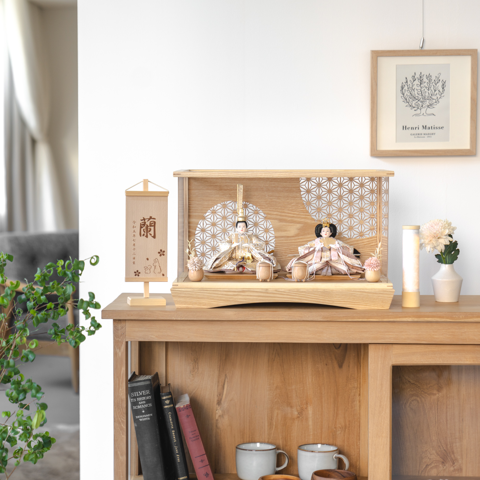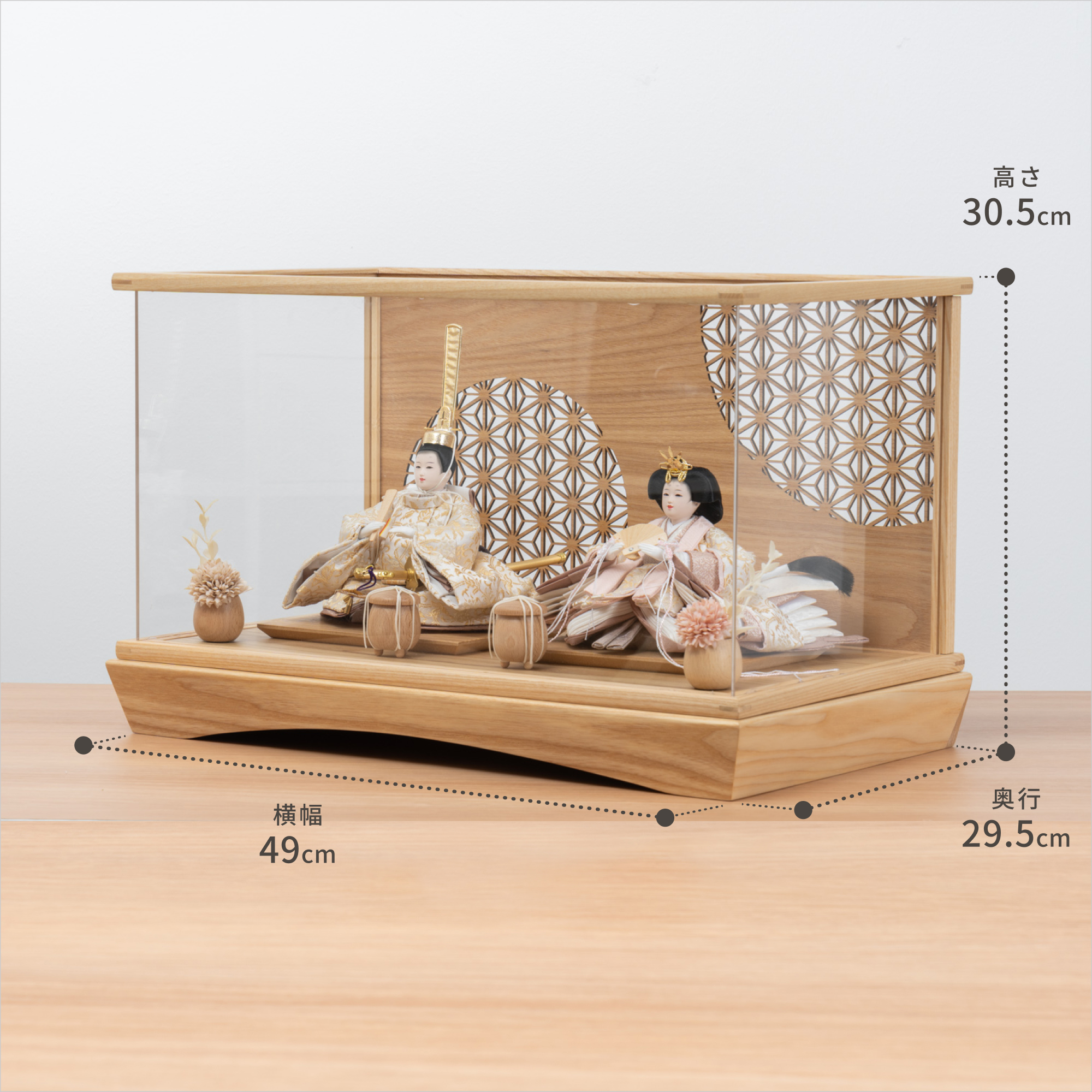 精巧な凛として美しい佇まいを天然木の優しいぬくもりが包み込む・・・まるで女の子の成長を温かく見守る家族の様に・・・そんなコンセプトから生まれた、親しみやすく、お子様と一緒に飾れる「ことの雛人形」です。コンパクトでちょうどいいサイズコンパクトでちょうどいいサイズ今どきのおうちに合わせたコンパクトなサイズに仕上げました。飾るスペースが狭くなりがちなマンションや子ども部屋にもぴったり。お部屋のイメージに調和するデザインお部屋のイメージに調和するデザイン天然木の素材を活かしたシンプルなデザインだから、お部屋の雰囲気にもピッタリ。お衣装へのこだわり 〜正絹 二重蔓牡丹文〜お衣装へのこだわり 〜正絹 二重蔓牡丹文〜日本の伝統的な文様の一つである、牡丹の花と唐草模様が組み合わさった「牡丹唐草」。牡丹には「不老不死」と「不老長寿」という意味が込められており、また、華やかで美しい牡丹の花は美と富の象徴とされています。そんな牡丹唐草の柄と小さいながらも光沢のある生地を合わせ、可愛らしさと高級感のある雛人形に仕上げました。手作りへのこだわり〜裂地(きれじ)の裁断手作りへのこだわり〜裂地(きれじ)の裁断和紙で衣裳の各種型紙を作り、へり部分にのみ糊をつけ、裂地裏面に貼り付けます。型紙に沿って裁断して衣裳部品を作っていきます。手作りへのこだわり〜縫製手作りへのこだわり〜縫製姫の十二単の唐衣(からぎぬ)・五衣(いつつぎぬ)・単衣(ひとえ)・裾、殿の着物・裾・中袖等、数多くの衣裳部品をミシン、または手縫いで細やかな部分まで縫い合わせ、折り込み仕上げていきます。手作りへのこだわり〜着付け・振付け手作りへのこだわり〜着付け・振付け仕上がった衣裳は両腕を後方に曲げて羽織らせるようにして着付けます。次にそれぞれの人形の形に振付けます。腕を曲げる角度や手の位置などで全体のバランスを取ります。手作りへのこだわり〜頭差し手作りへのこだわり〜頭差し頭さしは最終の人形検品を兼ねて行われます。包まれた顔紙を外し、汚れ等無いことを確認します。頭と衣紋の中心線が一直線になるように差し込みます。ことのお雛様ことのお雛様お雛様の顔は時代とともに人気のお顔があります。ことのお雛様のお顔は時代に左右されない普遍的なシンプルで可愛らしいお顔となっています。健やかな成長への願いを込めた 麻の葉文様健やかな成長への願いを込めた 麻の葉文様古来からの日本伝統の吉祥文様である麻の葉文様。麻の丈夫さ・成長の早さにあやかり、お子さまの健やかな成長への願いが込められています。ケース飾りでも手に取って本物の質感を感じてほしいケース飾りでも手に取って本物の質感を感じてほしい木都のケース飾りは、本物の素材や質感を感じながら親子で一緒に手に取って飾る体験をしてほしいから、あえて飾る手間を残しています。手間はかかりますが、伝統的な技法で一つひとつ手づくりしています。お子さまの感性を育む天然木へのこだわりお子さまの感性を育む天然木へのこだわり素材には、タモ、ブナといった天然木を使用。お子さまへの一生に一度の贈り物だから、木都は自然素材の天然木にこだわり続けています。※ 生産時期により使用する素材が一部変更になる場合がございます。熟練の職人による確かな手仕事熟練の職人による確かな手仕事伝統工芸の技術を受け継ぐ日本国内の熟練の職人が、一つひとつ丁寧に手づくりしています。おしゃれなギフト包装でお届けしますおしゃれなギフト包装でお届けします和の雰囲気を感じさせる越前和紙のギフト用ラッピングでお届け。料金がわかるものもお入れしていないので、そのまま贈り物として利用できます。商品レビュー記入でもれなくもらえる天然木のミニ名前札プレゼント商品レビュー記入でもれなくもらえる天然木のミニ名前札プレゼントミニサイズのお名前札 (通常販売価格1,980円) をプレゼント♪商品到着後、商品レビューをご記入の上、商品と同梱のチラシ記載のQRコードから応募フォームへ必要事項をご入力ください。店舗よりレビュー特典を発送いたします。※ お名前札の生年月日の表記は和暦となります。(例:令和七年)商品のご注文へ収納方法とセット内容お内裏様・お雛様・屏風・平台・人形小道具・貝桶×2・花飾り×2素材:タモ重量:3,260g (ケースのみ 2,530g)サイズ:W490mm × D295mm × H305mm梱包時:W550mm × D355mm × H480mm殿:約 W185mm × D165mm × H215mm姫:約 W220mm × D190mm × H125mm注意事項色合いなど実際のものと写真とでは多少の誤差が生じる場合がございます。また、手作りであり天然木を使用している為、多少の仕様の変化や風合いがひとつひとつ異なります。あらかじめご了承ください。部品には小さなものがございます。お子様がお口に入れないようにご注意ください。材質により木の刻印の濃淡に差が生じますが不良品ではございません。木製品である限り自然なこととご承知下さいませ。保管場所