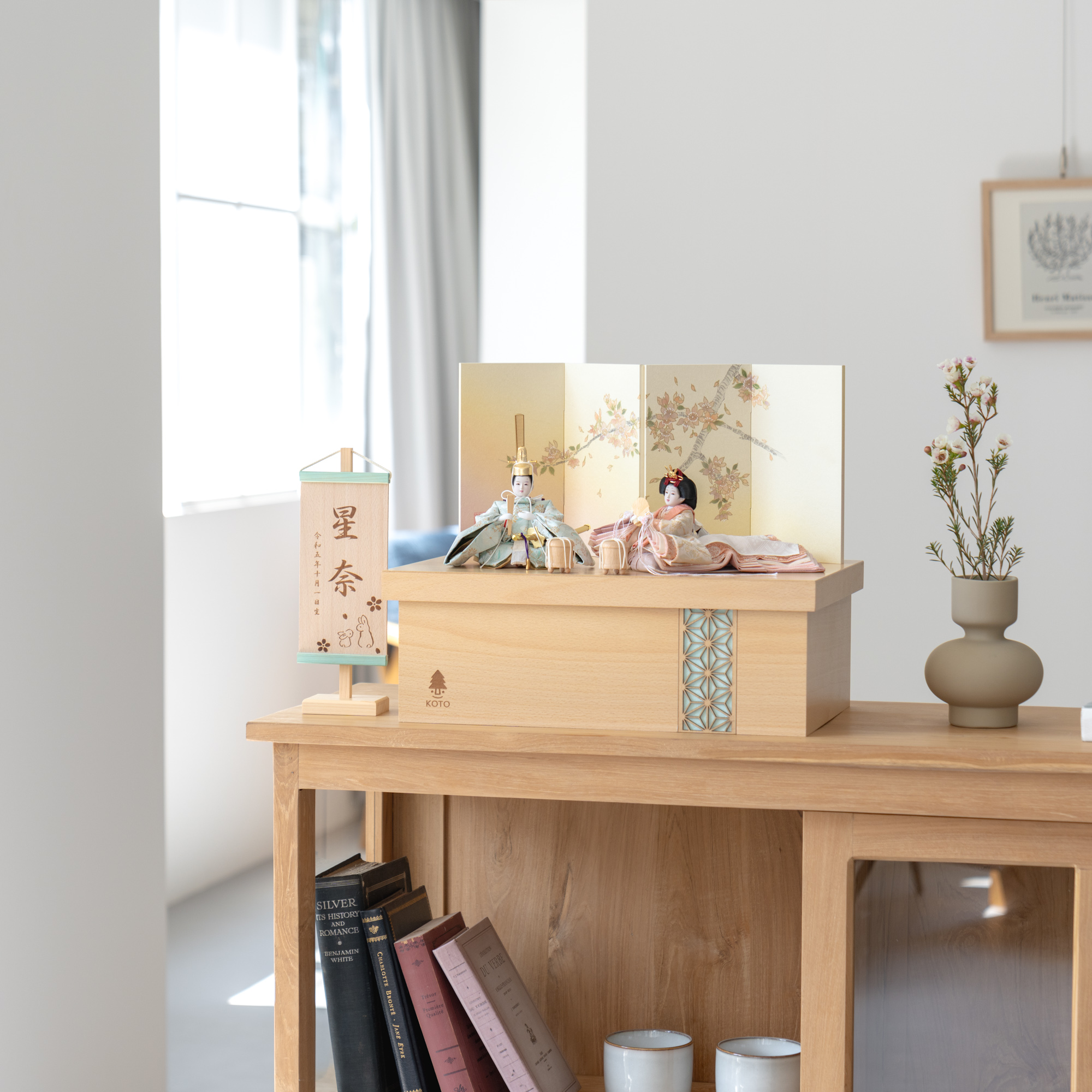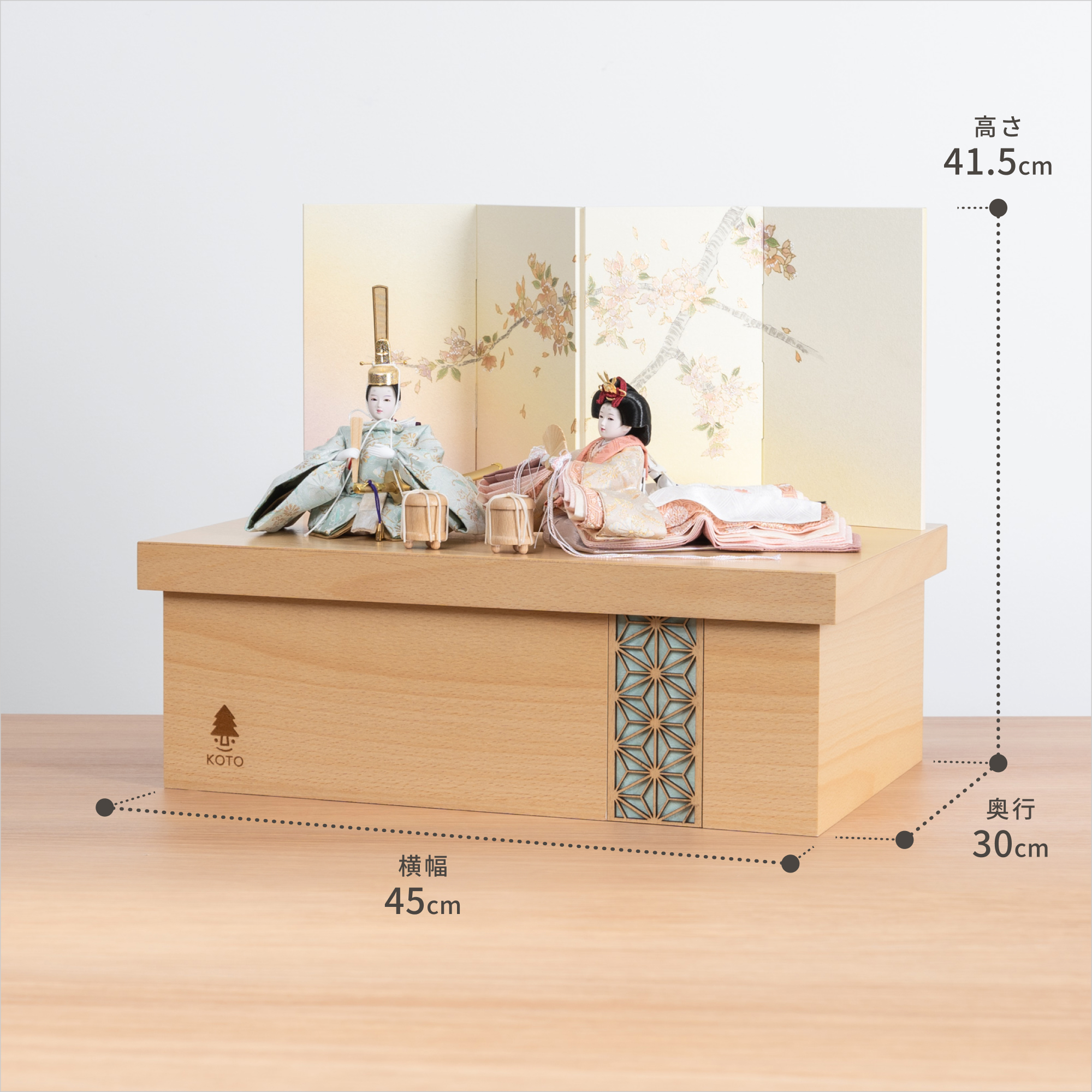 平安という言葉は平安京に由来しており、「穏やか」「安泰」といった願いが込められております。ことの平安ひなとは、お子様の成長や未来が穏やかで無事であるよう祈りを込めたお雛様です。そんな雛人形をてづくり工房「木都」の職人が、伝統工芸の技術と天然木の素材を活かし、真心込めて1つ1つ丁寧につくりました。コンパクトでちょうどいいサイズコンパクトでちょうどいいサイズ今どきのおうちに合わせたコンパクトなサイズに仕上げました。飾るスペースが狭くなりがちなマンションや子ども部屋にもぴったり。お部屋のイメージに調和するデザインお部屋のイメージに調和するデザイン天然木の素材を活かしたシンプルなデザインだから、お部屋の雰囲気にもピッタリ。お衣装へのこだわり 〜小菊唐草小葵文〜お衣装へのこだわり 〜小菊唐草小葵文〜衣装には、不老長寿を象徴する菊と、途切れることなく蔓を伸ばすことから子孫繁栄の意味をもつ唐草に、好機好転を表す「葵」の紋様を組み込んだ、縁起の良い小菊唐草小葵文が描かれています。一般的な親王の形とは違い、お姫様の着物の裾を長くし、平安絵巻のような流れる動きをつけました。横向きに飾ることで、衣装と裾重ねの色の美しさを同時に楽しんでいただけます。上質な糸から織られた正絹西陣織と和紙を使用し、しなやかさを保ちつつ着物の形が崩れないよう工夫しました。手作りへのこだわり 〜裂地(きれじ)の裁断手作りへのこだわり 〜裂地(きれじ)の裁断和紙で衣裳の各種型紙を作り、へり部分にのみ糊をつけ、裂地裏面に貼り付けます。型紙に沿って裁断して衣裳部品を作っていきます。手作りへのこだわり 〜縫製手作りへのこだわり 〜縫製姫の十二単の唐衣(からぎぬ)・五衣(いつつぎぬ)・単衣(ひとえ)・裾、殿の着物・裾・中袖等、数多くの衣裳部品をミシン、または手縫いで細やかな部分まで縫い合わせ、折り込み仕上げていきます。手作りへのこだわり 〜着付け・振付け手作りへのこだわり 〜着付け・振付け仕上がった衣裳は両腕を後方に曲げて羽織らせるようにして着付けます。次にそれぞれの人形の形に振付けます。腕を曲げる角度や手の位置などで全体のバランスを取ります。手作りへのこだわり 〜頭差し手作りへのこだわり 〜頭差し頭さしは最終の人形検品を兼ねて行われます。包まれた顔紙を外し、汚れ等無いことを確認します。頭と衣紋の中心線が一直線になるように差し込みます。ことのお雛様ことのお雛様お雛様の顔は時代とともに人気のお顔があります。ことのお雛様のお顔は時代に左右されない普遍的なシンプルで可愛らしいお顔となっています。ケース飾りでも手に取って本物の質感を感じてほしいケース飾りでも手に取って本物の質感を感じてほしい木都のケース飾りは、本物の素材や質感を感じながら親子で一緒に手に取って飾る体験をしてほしいから、あえて飾る手間を残しています。手間はかかりますが、伝統的な技法で一つひとつ手づくりしています。お子さまの感性を育む天然木へのこだわりお子さまの感性を育む天然木へのこだわり素材には、タモ、ブナといった天然木を使用。お子さまへの一生に一度の贈り物だから、木都は自然素材の天然木にこだわり続けています。※ 生産時期により使用する素材が一部変更になる場合がございます。熟練の職人による確かな手仕事熟練の職人による確かな手仕事伝統工芸の技術を受け継ぐ日本国内の熟練の職人が、一つひとつ丁寧に手づくりしています。おしゃれなギフト包装でお届けしますおしゃれなギフト包装でお届けします和の雰囲気を感じさせる越前和紙のギフト用ラッピングでお届け。料金がわかるものもお入れしていないので、そのまま贈り物として利用できます。商品レビュー記入でもれなくもらえる天然木のミニ名前札プレゼント商品レビュー記入でもれなくもらえる天然木のミニ名前札プレゼントミニサイズのお名前札 (通常販売価格1,980円) をプレゼント♪商品到着後、商品レビューをご記入の上、商品と同梱のチラシ記載のQRコードから応募フォームへ必要事項をご入力ください。店舗よりレビュー特典を発送いたします。※ お名前札の生年月日の表記は和暦となります。(例:令和七年)商品のご注文へ収納方法とセット内容お内裏様・お雛様・屏風・収納箱・人形小道具・貝桶×2素材:ブナ重量:3,480g サイズ:W450mm × D300mm × H415mm梱包時:W490mm × D315mm × H215mm殿:約 W155mm × D160mm × H165mm姫:約 W140mm × D440mm × H110mm注意事項色合いなど実際のものと写真とでは多少の誤差が生じる場合がございます。また、手作りであり天然木を使用している為、多少の仕様の変化や風合いがひとつひとつ異なります。あらかじめご了承ください。部品には小さなものがございます。お子様がお口に入れないようにご注意ください。材質により木の刻印の濃淡に差が生じますが不良品ではございません。木製品である限り自然なこととご承知下さいませ。保管