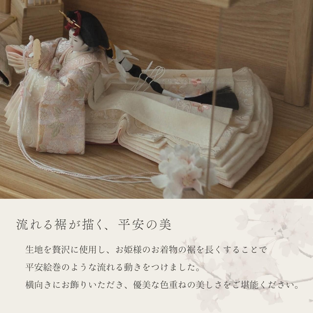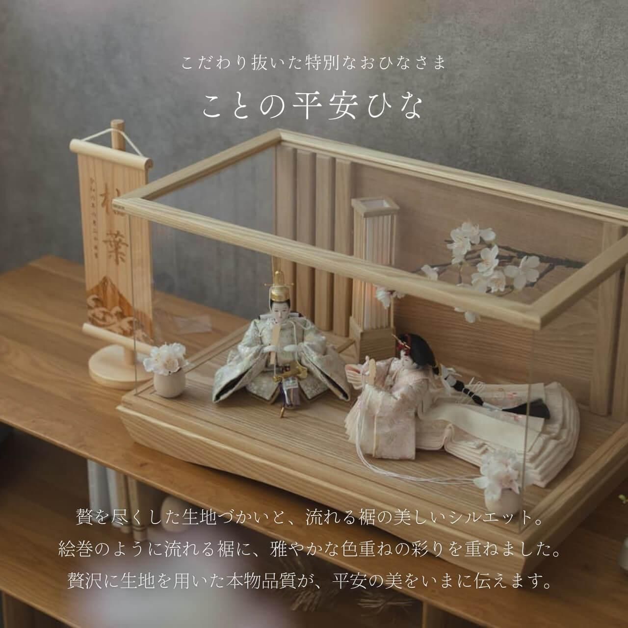 平安という言葉は平安京に由来しており、「穏やか」「安泰」といった願いが込められております。ことの平安ひなとは、お子様の成長や未来が穏やかで無事であるよう祈りを込めたお雛様です。そんな雛人形をてづくり工房「木都」の職人が、伝統工芸の技術と天然木の素材を活かし、真心込めて1つ1つ丁寧につくりました。コンパクトでちょうどいいサイズコンパクトでちょうどいいサイズ今どきのおうちに合わせたコンパクトなサイズに仕上げました。飾るスペースが狭くなりがちなマンションや子ども部屋にもぴったり。お部屋のイメージに調和するデザインお部屋のイメージに調和するデザイン天然木の素材を活かしたシンプルなデザインだから、お部屋の雰囲気にもピッタリ。お衣装へのこだわり 〜八重桜文〜お衣装へのこだわり 〜八重桜文〜衣装には、「しとやか」の意味をもつ八重桜が描かれています。また、幾重にも重なる花びらを積み重ねた知識に見立てて「理知に富んだ教育」などという意味があり、人の見た目の美しさだけでなく、内面の美しさを表しています。手作りへのこだわり 〜裂地(きれじ)の裁断手作りへのこだわり 〜裂地(きれじ)の裁断和紙で衣裳の各種型紙を作り、へり部分にのみ糊をつけ、裂地裏面に貼り付けます。型紙に沿って裁断して衣裳部品を作っていきます。手作りへのこだわり 〜縫製手作りへのこだわり 〜縫製姫の十二単の唐衣(からぎぬ)・五衣(いつつぎぬ)・単衣(ひとえ)・裾、殿の着物・裾・中袖等、数多くの衣裳部品をミシン、または手縫いで細やかな部分まで縫い合わせ、折り込み仕上げていきます。手作りへのこだわり 〜着付け・振付け手作りへのこだわり 〜着付け・振付け仕上がった衣裳は両腕を後方に曲げて羽織らせるようにして着付けます。次にそれぞれの人形の形に振付けます。腕を曲げる角度や手の位置などで全体のバランスを取ります。手作りへのこだわり 〜頭差し手作りへのこだわり 〜頭差し頭さしは最終の人形検品を兼ねて行われます。包まれた顔紙を外し、汚れ等無いことを確認します。頭と衣紋の中心線が一直線になるように差し込みます。ことのお雛様ことのお雛様お雛様の顔は時代とともに人気のお顔があります。ことのお雛様のお顔は時代に左右されない普遍的なシンプルで可愛らしいお顔となっています。満開の枝桜が彩るケース満開の枝桜が彩るケース桜には縁起の良いことのはじまりや豊かさという意味があります。「お殿様とお雛様が桜の下で未来を誓う」そんなイメージから出来上がりました。ケース飾りでも手に取って本物の質感を感じてほしいケース飾りでも手に取って本物の質感を感じてほしい木都のケース飾りは、本物の素材や質感を感じながら親子で一緒に手に取って飾る体験をしてほしいから、あえて飾る手間を残しています。手間はかかりますが、伝統的な技法で一つひとつ手づくりしています。お子さまの感性を育む天然木へのこだわりお子さまの感性を育む天然木へのこだわり素材には、タモ、ブナといった天然木を使用。お子さまへの一生に一度の贈り物だから、木都は自然素材の天然木にこだわり続けています。※ 生産時期により使用する素材が一部変更になる場合がございます。熟練の職人による確かな手仕事熟練の職人による確かな手仕事伝統工芸の技術を受け継ぐ日本国内の熟練の職人が、一つひとつ丁寧に手づくりしています。おしゃれなギフト包装でお届けしますおしゃれなギフト包装でお届けします和の雰囲気を感じさせる越前和紙のギフト用ラッピングでお届け。料金がわかるものもお入れしていないので、そのまま贈り物として利用できます。商品レビュー記入でもれなくもらえる天然木のミニ名前札プレゼント商品レビュー記入でもれなくもらえる天然木のミニ名前札プレゼントミニサイズのお名前札 (通常販売価格1,980円) をプレゼント♪商品到着後、商品レビューをご記入の上、商品と同梱のチラシ記載のQRコードから応募フォームへ必要事項をご入力ください。店舗よりレビュー特典を発送いたします。※ お名前札の生年月日の表記は和暦となります。(例:令和七年)商品のご注文へ収納方法とセット内容お内裏様・お雛様・ケース・下台・人形小道具・花飾り×2・行燈素材:タモ重量:3,160g (ケースのみ 2,780g)サイズ:W485mm × D290mm × H285mm梱包時:W550mm × D355mm × H480mm殿:約 W155mm × D160mm × H165mm姫:約 W140mm × D440mm × H110mm注意事項色合いなど実際のものと写真とでは多少の誤差が生じる場合がございます。また、手作りであり天然木を使用している為、多少の仕様の変化や風合いがひとつひとつ異なります。あらかじめご了承ください。部品には小さなものがございます。お子様がお口に入れないようにご注意ください。材質により木の刻印の濃淡に差が生じますが不良品ではございません。木製品である限り自然なこととご承知下さいませ。保管場所は変色やカビ、サビの原因になりますので湿気