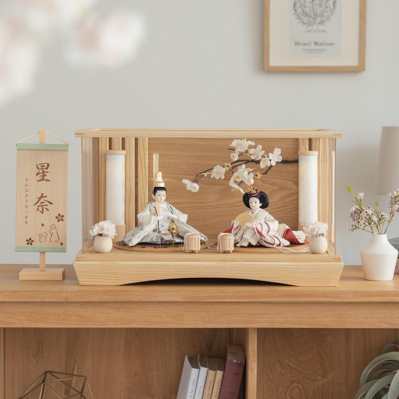 精巧な凛として美しい佇まいを天然木の優しいぬくもりが包み込む・・・まるで女の子の成長を温かく見守る家族の様に・・・そんなコンセプトから生まれた、親しみやすく、お子様と一緒に飾れる「ことの雛人形」です。コンパクトでちょうどいいサイズコンパクトでちょうどいいサイズ今どきのおうちに合わせたコンパクトなサイズに仕上げました。飾るスペースが狭くなりがちなマンションや子ども部屋にもぴったり。お部屋のイメージに調和するデザインお部屋のイメージに調和するデザイン天然木の素材を活かしたシンプルなデザインだから、お部屋の雰囲気にもピッタリ。雪輪流水紋様雪輪流水紋様白地の地紋には日本古来から愛され縁起の良い紋様して伝わる七宝紋様も施されております。流水柄は落ち着いた現代色で雛人形様に織り上げた別誂の西陣織となります。手作りへのこだわり〜裂地(きれじ)の裁断手作りへのこだわり〜裂地(きれじ)の裁断和紙で衣裳の各種型紙を作り、へり部分にのみ糊をつけ、裂地裏面に貼り付けます。型紙に沿って裁断して衣裳部品を作っていきます。手作りへのこだわり〜縫製手作りへのこだわり〜縫製姫の十二単の唐衣(からぎぬ)・五衣(いつつぎぬ)・単衣(ひとえ)・裾、殿の着物・裾・中袖等、数多くの衣裳部品をミシン、または手縫いで細やかな部分まで縫い合わせ、折り込み仕上げていきます。手作りへのこだわり〜着付け・振付け手作りへのこだわり〜着付け・振付け仕上がった衣裳は両腕を後方に曲げて羽織らせるようにして着付けます。次にそれぞれの人形の形に振付けます。腕を曲げる角度や手の位置などで全体のバランスを取ります。手作りへのこだわり〜頭差し手作りへのこだわり〜頭差し頭さしは最終の人形検品を兼ねて行われます。包まれた顔紙を外し、汚れ等無いことを確認します。頭と衣紋の中心線が一直線になるように差し込みます。ことのお雛様ことのお雛様お雛様の顔は時代とともに人気のお顔があります。ことのお雛様のお顔は時代に左右されない普遍的なシンプルで可愛らしいお顔となっています。満開の枝桜が彩るケース満開の枝桜が彩るケース桜には縁起の良いことのはじまりや豊かさという意味があります。「お殿様とお雛様が桜の下で未来を誓う」そんなイメージから出来上がりました。お子さまの感性を育む天然木へのこだわりお子さまの感性を育む天然木へのこだわり素材には、タモ、ブナといった天然木を使用。お子さまへの一生に一度の贈り物だから、木都は自然素材の天然木にこだわり続けています。※ 生産時期により使用する素材が一部変更になる場合がございます。熟練の職人による確かな手仕事熟練の職人による確かな手仕事伝統工芸の技術を受け継ぐ日本国内の熟練の職人が、一つひとつ丁寧に手づくりしています。おしゃれなギフト包装でお届けしますおしゃれなギフト包装でお届けします和の雰囲気を感じさせる越前和紙のギフト用ラッピングでお届け。料金がわかるものもお入れしていないので、そのまま贈り物として利用できます。商品レビュー記入でもれなくもらえる天然木のミニ名前札プレゼント商品レビュー記入でもれなくもらえる天然木のミニ名前札プレゼントミニサイズのお名前札 (通常販売価格1,980円) をプレゼント♪商品到着後、商品レビューをご記入の上、商品と同梱のチラシ記載のQRコードから応募フォームへ必要事項をご入力ください。店舗よりレビュー特典を発送いたします。※ お名前札の生年月日の表記は和暦となります。(例:令和七年)商品のご注文へ収納方法とセット内容お内裏様・お雛様・ケース・下台・親王台・人形小道具・貝桶×2・花飾り×2素材:タモ重量:3,230g (ケースのみ 2,780g)サイズ:W485mm × D290mm × H285mm梱包時:W550mm × D355mm × H480mm殿:約 W155mm × D120mm × H200mm姫:約 W155mm × D175mm × H120mm注意事項色合いなど実際のものと写真とでは多少の誤差が生じる場合がございます。また、手作りであり天然木を使用している為、多少の仕様の変化や風合いがひとつひとつ異なります。あらかじめご了承ください。部品には小さなものがございます。お子様がお口に入れないようにご注意ください。材質により木の刻印の濃淡に差が生じますが不良品ではございません。木製品である限り自然なこととご承知下さいませ。保管場所は変色やカビ、サビの原因になりますので湿気の少ない場所・直射日光の当たらない場所に保管してください。雄雛の正面にあります飾り帯のビニールは外さないでください。本商品に行燈は付属しておりません。別途お買い求めください。受注生産品のため、時期によりお届け時期が前後する場合がございます。ご不明点がございましたら > お問い合わせページ からご相談ください。