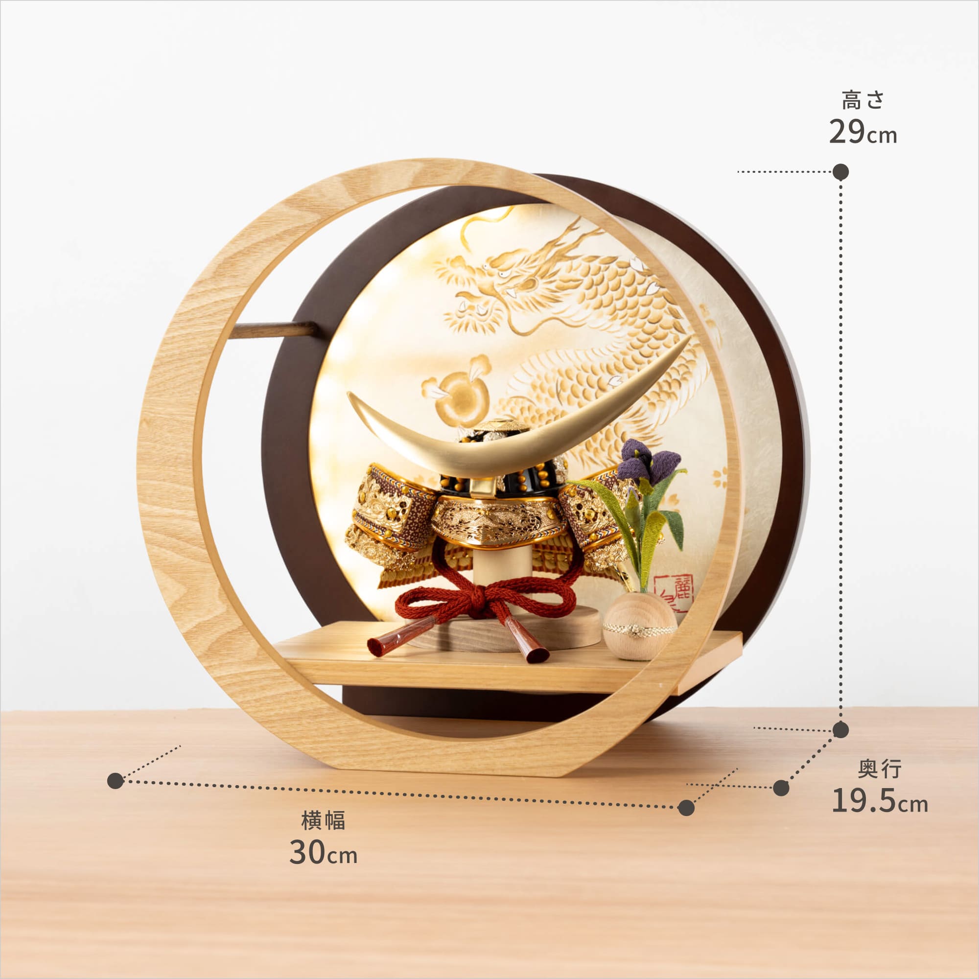 精巧な戦国兜の凛として強く美しい佇まいを天然木の優しいぬくもりが包み込む・・・まるで男の子の成長を温かく見守る家族の様に・・・そんなコンセプトから生まれた兜は、てづくり工房「木都」と甲冑工房「悠雅」のコラボレーションから生まれました。親しみやすく、お子様と一緒に飾れるKOTO×悠雅コラボ兜です。※ 細かい部品が含まれています。3歳未満のお子様は、保護者の方と一緒にお遊びください。選び抜いた素材と手間をかけた技法でつくる兜鉢選び抜いた素材と手間をかけた技法でつくる兜鉢KOTO×悠雅コラボ兜の兜鉢は、伝統的な本式の合せ鉢という技法でつくられています。本式の合せ鉢とは、戦国時代に頭部を守るために考案され、三角状の鉢部品を重ね合わせ、多数の星鋲をカシメる事で強度を高める技法です。選び抜いた素材と手間をかけた技法でつくる「庇」選び抜いた素材と手間をかけた技法でつくる「庇」兜の裏側にあたる庇は、甲州印伝革を使用し伝統的な技術で1つ1つ手作りで丁寧に作られています。選び抜いた素材と手間をかけた技法でつくる「小札」選び抜いた素材と手間をかけた技法でつくる「小札」小札は、細かい天然繊維である本物の絹糸を使用した正絹で結び合わせ繋げております。伝統的な兜をモダンに仕上げたシンプルなデザイン伝統的な兜をモダンに仕上げたシンプルなデザイン伝統的な製法で作られた兜に天然木の素材を活かしたシンプルなデザインの兜です。モダンでシンプルなデザインは、どんなお部屋の雰囲気にもピッタリ。コンパクトでちょうどいいサイズコンパクトでちょうどいいサイズ今どきのおうちに合わせたコンパクトなサイズに仕上げました。飾るスペースが狭くなりがちなマンションや子ども部屋にもぴったり。子供の健やかな成長を願う 龍子供の健やかな成長を願う 龍龍には悪いものを払いのけ幸運をもたらす力があるとされており、子供の健やかな成長への願いが込められています。また、出世や繁栄の象徴でもあり、子供の将来の成功を願う勇ましい装飾として親しまれています。兜の由来〜伊達正宗兜の由来〜伊達正宗妙見信仰という宗教は星や月、太陽などを神とあがめていました。伊達はその中でも月派で三日月にした理由は戦の邪魔にならないようにといわれています。お子さまの感性を育む天然木へのこだわりお子さまの感性を育む天然木へのこだわり素材には、タモ、ブナといった天然木を使用。お子さまへの一生に一度の贈り物だから、木都は自然素材の天然木にこだわり続けています。※ 生産時期により使用する素材が一部変更になる場合がございます。熟練の職人による確かな手仕事熟練の職人による確かな手仕事伝統工芸の技術を受け継ぐ日本国内の熟練の職人が、一つひとつ丁寧に手づくりしています。おしゃれなギフト包装でお届けしますおしゃれなギフト包装でお届けします和の雰囲気を感じさせる越前和紙のギフト用ラッピングでお届け。料金がわかるものもお入れしていないので、そのまま贈り物として利用できます。商品レビュー記入でもれなくもらえる天然木のミニ名前札プレゼント商品レビュー記入でもれなくもらえる天然木のミニ名前札プレゼントミニサイズのお名前札 (通常販売価格1,980円) をプレゼント♪商品到着後、商品レビューをご記入の上、商品と同梱のチラシ記載のQRコードから応募フォームへ必要事項をご入力ください。店舗よりレビュー特典を発送いたします。※ お名前札の生年月日の表記は和暦となります。(例:令和七年)商品のご注文へ収納方法とセット内容兜・鍬形・芯木・菖蒲・飾り台・電源ケーブル素材:タモ重量:1,300g サイズ:W300mm × D195mm × H290mm梱包時:W340mm × D240mm × H330mm兜のみ:約 W150mm × D110mm × H150mm収納方法鍬形は専用袋に入れ、兜は風呂敷に包みます。その他の部品は不織布に入れ収納してください。兜置きの下台とポールは組み立ててご利用ください。注意事項甲冑について飾り付ける際に必ず手袋をご使用ください。錆や変色などの予防にもなります。本品の上には絶対に乗らないでください。本品または本品の部品は装飾品です。他の目的に使用しないで下さい。部品には小さなものがございます。お子様がお口に入れないようにご注意いください。木製品について色合いなど実際のものと写真とでは多少の誤差が生じる場合がございます。また、手作りであり天然木を使用している為、多少の仕様の変化や風合いがひとつひとつ異なります。あらかじめご了承ください。部品には小さなものがございます。お子様がお口に入れないようにご注意いください。菖蒲には針金が入っております。お好みで角度を調整して下さい。材質により刻印の濃淡に差が生じますが不良品ではございません。木製品である限り自然なこととご承知下さいませ。保管場所は変色やカビ、サビの原因になりますので湿気の少ない場所・直射日光の当たらない場所に保管してください。ご不明点