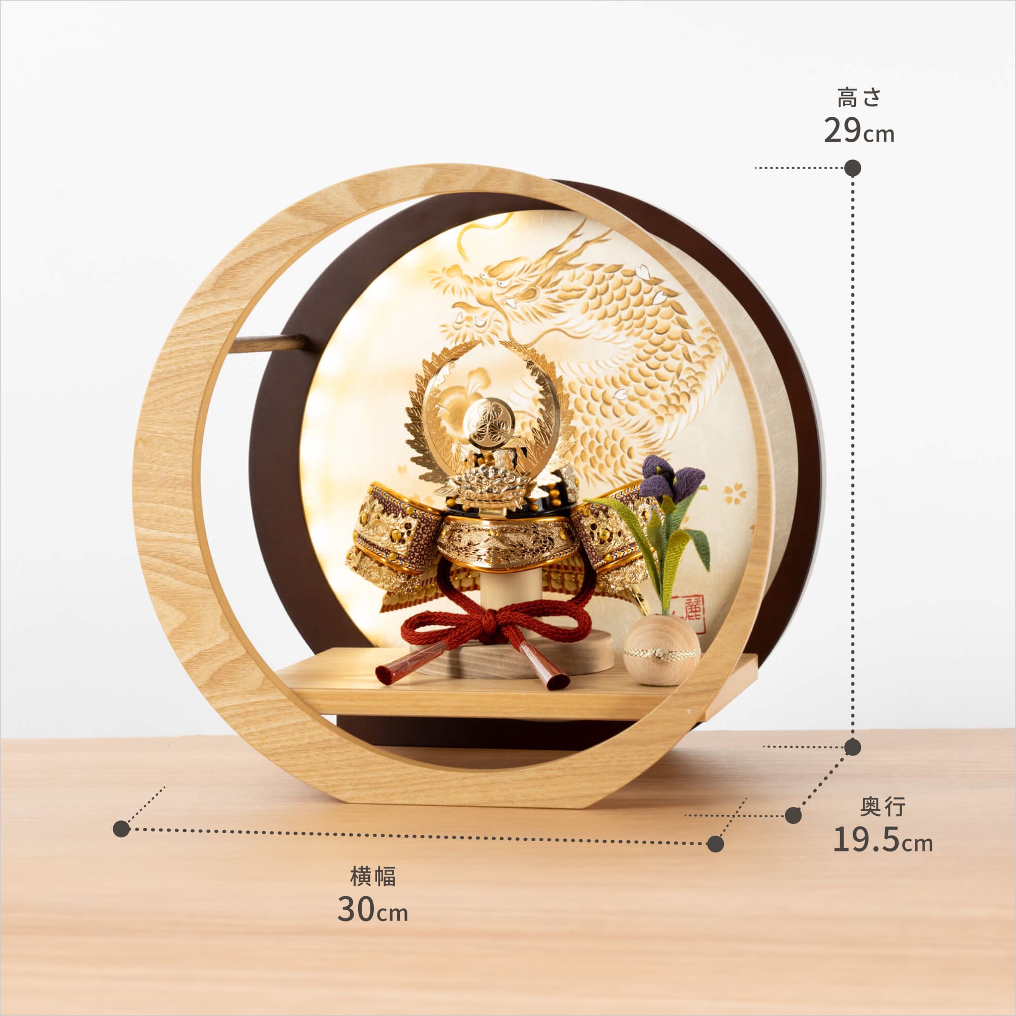 精巧な戦国兜の凛として強く美しい佇まいを天然木の優しいぬくもりが包み込む・・・まるで男の子の成長を温かく見守る家族の様に・・・そんなコンセプトから生まれた兜は、てづくり工房「木都」と甲冑工房「悠雅」のコラボレーションから生まれました。親しみやすく、お子様と一緒に飾れるKOTO×悠雅コラボ兜です。※ 細かい部品が含まれています。3歳未満のお子様は、保護者の方と一緒にお遊びください。選び抜いた素材と手間をかけた技法でつくる兜鉢選び抜いた素材と手間をかけた技法でつくる兜鉢KOTO×悠雅コラボ兜の兜鉢は、伝統的な本式の合せ鉢という技法でつくられています。本式の合せ鉢とは、戦国時代に頭部を守るために考案され、三角状の鉢部品を重ね合わせ、多数の星鋲をカシメる事で強度を高める技法です。選び抜いた素材と手間をかけた技法でつくる「庇」選び抜いた素材と手間をかけた技法でつくる「庇」兜の裏側にあたる庇は、甲州印伝革を使用し伝統的な技術で1つ1つ手作りで丁寧に作られています。選び抜いた素材と手間をかけた技法でつくる「小札」選び抜いた素材と手間をかけた技法でつくる「小札」小札は、細かい天然繊維である本物の絹糸を使用した正絹で結び合わせ繋げております。伝統的な兜をモダンに仕上げたシンプルなデザイン伝統的な兜をモダンに仕上げたシンプルなデザイン伝統的な製法で作られた兜に天然木の素材を活かしたシンプルなデザインの兜です。モダンでシンプルなデザインは、どんなお部屋の雰囲気にもピッタリ。コンパクトでちょうどいいサイズコンパクトでちょうどいいサイズ今どきのおうちに合わせたコンパクトなサイズに仕上げました。飾るスペースが狭くなりがちなマンションや子ども部屋にもぴったり。子供の健やかな成長を願う 龍子供の健やかな成長を願う 龍龍には悪いものを払いのけ幸運をもたらす力があるとされており、子供の健やかな成長への願いが込められています。また、出世や繁栄の象徴でもあり、子供の将来の成功を願う勇ましい装飾として親しまれています。兜の由来〜徳川家康兜の由来〜徳川家康家康の兜飾りはシダをあしらっています。シダは常緑樹で枯れないので繁栄と長寿の意味がこめられています。お子さまの感性を育む天然木へのこだわりお子さまの感性を育む天然木へのこだわり素材には、タモ、ブナといった天然木を使用。お子さまへの一生に一度の贈り物だから、木都は自然素材の天然木にこだわり続けています。※ 生産時期により使用する素材が一部変更になる場合がございます。熟練の職人による確かな手仕事熟練の職人による確かな手仕事伝統工芸の技術を受け継ぐ日本国内の熟練の職人が、一つひとつ丁寧に手づくりしています。おしゃれなギフト包装でお届けしますおしゃれなギフト包装でお届けします和の雰囲気を感じさせる越前和紙のギフト用ラッピングでお届け。料金がわかるものもお入れしていないので、そのまま贈り物として利用できます。商品レビュー記入でもれなくもらえる天然木のミニ名前札プレゼント商品レビュー記入でもれなくもらえる天然木のミニ名前札プレゼントミニサイズのお名前札 (通常販売価格1,980円) をプレゼント♪商品到着後、商品レビューをご記入の上、商品と同梱のチラシ記載のQRコードから応募フォームへ必要事項をご入力ください。店舗よりレビュー特典を発送いたします。※ お名前札の生年月日の表記は和暦となります。(例:令和七年)商品のご注文へ収納方法とセット内容兜・鍬形・芯木・菖蒲・飾り台・電源ケーブル素材:タモ重量:1,300g サイズ:W300mm × D195mm × H290mm梱包時:W340mm × D240mm × H330mm兜のみ:約 W150mm × D110mm × H150mm収納方法鍬形は専用袋に入れ、兜は風呂敷に包みます。その他の部品は不織布に入れ収納してください。兜置きの下台とポールは組み立ててご利用ください。注意事項甲冑について飾り付ける際に必ず手袋をご使用ください。錆や変色などの予防にもなります。本品の上には絶対に乗らないでください。本品または本品の部品は装飾品です。他の目的に使用しないで下さい。部品には小さなものがございます。お子様がお口に入れないようにご注意いください。木製品について色合いなど実際のものと写真とでは多少の誤差が生じる場合がございます。また、手作りであり天然木を使用している為、多少の仕様の変化や風合いがひとつひとつ異なります。あらかじめご了承ください。部品には小さなものがございます。お子様がお口に入れないようにご注意いください。菖蒲には針金が入っております。お好みで角度を調整して下さい。材質により刻印の濃淡に差が生じますが不良品ではございません。木製品である限り自然なこととご承知下さいませ。保管場所は変色やカビ、サビの原因になりますので湿気の少ない場所・直射日光の当たらない場所に保管してください。ご不明点がございましたら > お問い合わせページ からご