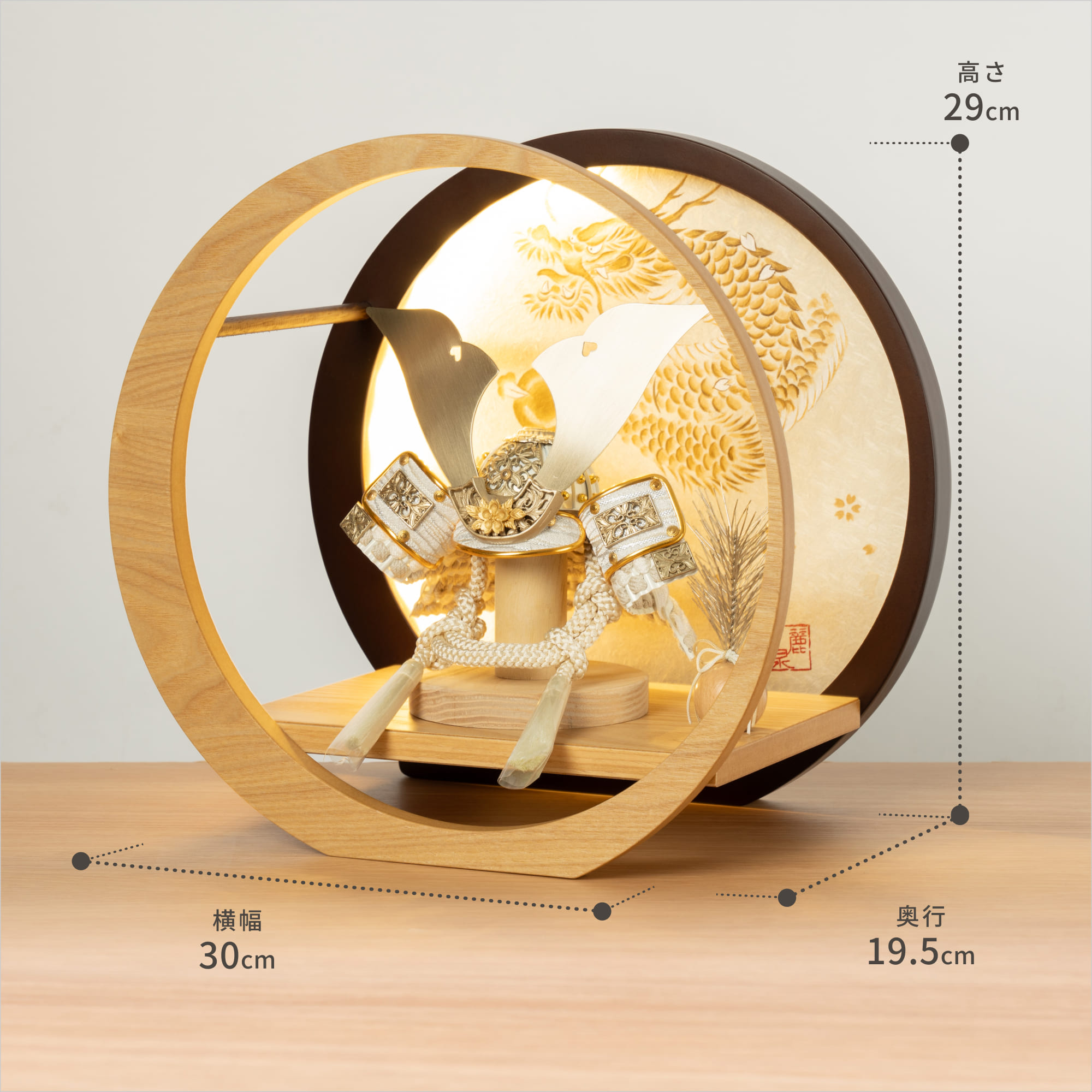 実際に手に取ると天然木の素材ならではの優しいぬくもりが伝わります。てづくり工房「木都」の職人が、伝統工芸の技術と天然木の素材を活かし、真心込めて1つ1つ丁寧につくりました。親しみやすく、お子様と一緒に飾れる「ことの兜」です。※ 細かい部品が含まれています。3歳未満のお子様は、保護者の方と一緒にお遊びください。コンパクトでちょうどいいサイズコンパクトでちょうどいいサイズ今どきのおうちに合わせたコンパクトなサイズに仕上げました。飾るスペースが狭くなりがちなマンションや子ども部屋にもぴったり。伝統的な兜をモダンに仕上げ白で統一されたシンプルなデザイン伝統的な兜をモダンに仕上げ白で統一されたシンプルなデザイン伝統的な製法で作られた兜に天然木の素材を活かしたシンプルなデザインの兜です。モダンで白に統一されたシンプルなデザインは、どんなお部屋の雰囲気にもピッタリ。選び抜いた素材と手間をかけた技法でつくる兜鉢選び抜いた素材と手間をかけた技法でつくる兜鉢ことの兜の兜鉢は、伝統的な本式の合せ鉢という技法でつくられています。本式の合せ鉢とは、戦国時代に頭部を守るために考案され、三角状の鉢部品を重ね合わせ、多数の星鋲をカシメる事で強度を高める技法です。子供の健やかな成長を願う 龍子供の健やかな成長を願う 龍龍には悪いものを払いのけ幸運をもたらす力があるとされており、子供の健やかな成長への願いが込められています。また、出世や繁栄の象徴でもあり、子供の将来の成功を願う勇ましい装飾として親しまれています。お子さまの感性を育む天然木へのこだわりお子さまの感性を育む天然木へのこだわり素材には、タモ、ブナといった天然木を使用。お子さまへの一生に一度の贈り物だから、木都は自然素材の天然木にこだわり続けています。※ 生産時期により使用する素材が一部変更になる場合がございます。熟練の職人による確かな手仕事熟練の職人による確かな手仕事伝統工芸の技術を受け継ぐ日本国内の熟練の職人が、一つひとつ丁寧に手づくりしています。おしゃれなギフト包装でお届けしますおしゃれなギフト包装でお届けします和の雰囲気を感じさせる越前和紙のギフト用ラッピングでお届け。料金がわかるものもお入れしていないので、そのまま贈り物として利用できます。商品レビュー記入でもれなくもらえる天然木のミニ名前札プレゼント商品レビュー記入でもれなくもらえる天然木のミニ名前札プレゼントミニサイズのお名前札 (通常販売価格1,980円) をプレゼント♪商品到着後、商品レビューをご記入の上、商品と同梱のチラシ記載のQRコードから応募フォームへ必要事項をご入力ください。店舗よりレビュー特典を発送いたします。※ お名前札の生年月日の表記は和暦となります。(例:令和八年)商品のご注文へ収納方法とセット内容兜・鍬形・芯木・松・飾り台・電源ケーブル素材:タモ重量:1,300g サイズ:W300mm × D195mm × H290mm梱包時:W340mm × D240mm × H330mm兜のみ:約 W150mm × D160mm × H150mm注意事項本品は、金属をふんだんに使用しております。取り扱われる方の人体にすり傷、切り傷、刺傷を及ぼす場合がございますので、左記注意事項をよく読んでお取り扱い下さい。甲冑について飾り付ける際に必ず手袋をご使用ください。錆や変色などの予防にもなります。本品の上には絶対に乗らないでください。本品または本品の部品は装飾品です。他の目的に使用しないで下さい。部品には小さなものがございます。お子様がお口に入れないようにご注意いください。木製品について色合いなど実際のものと写真とでは多少の誤差が生じる場合がございます。また、手作りであり天然木を使用している為、多少の仕様の変化や風合いがひとつひとつ異なります。あらかじめご了承ください。部品には小さなものがございます。お子様がお口に入れないようにご注意いください。菖蒲には針金が入っております。お好みで角度を調整して下さい。材質により刻印の濃淡に差が生じますが不良品ではございません。木製品である限り自然なこととご承知下さいませ。保管場所は変色やカビ、サビの原因になりますので湿気の少ない場所・直射日光の当たらない場所に保管してください。ご不明点がございましたら > お問い合わせページ からご相談ください。
