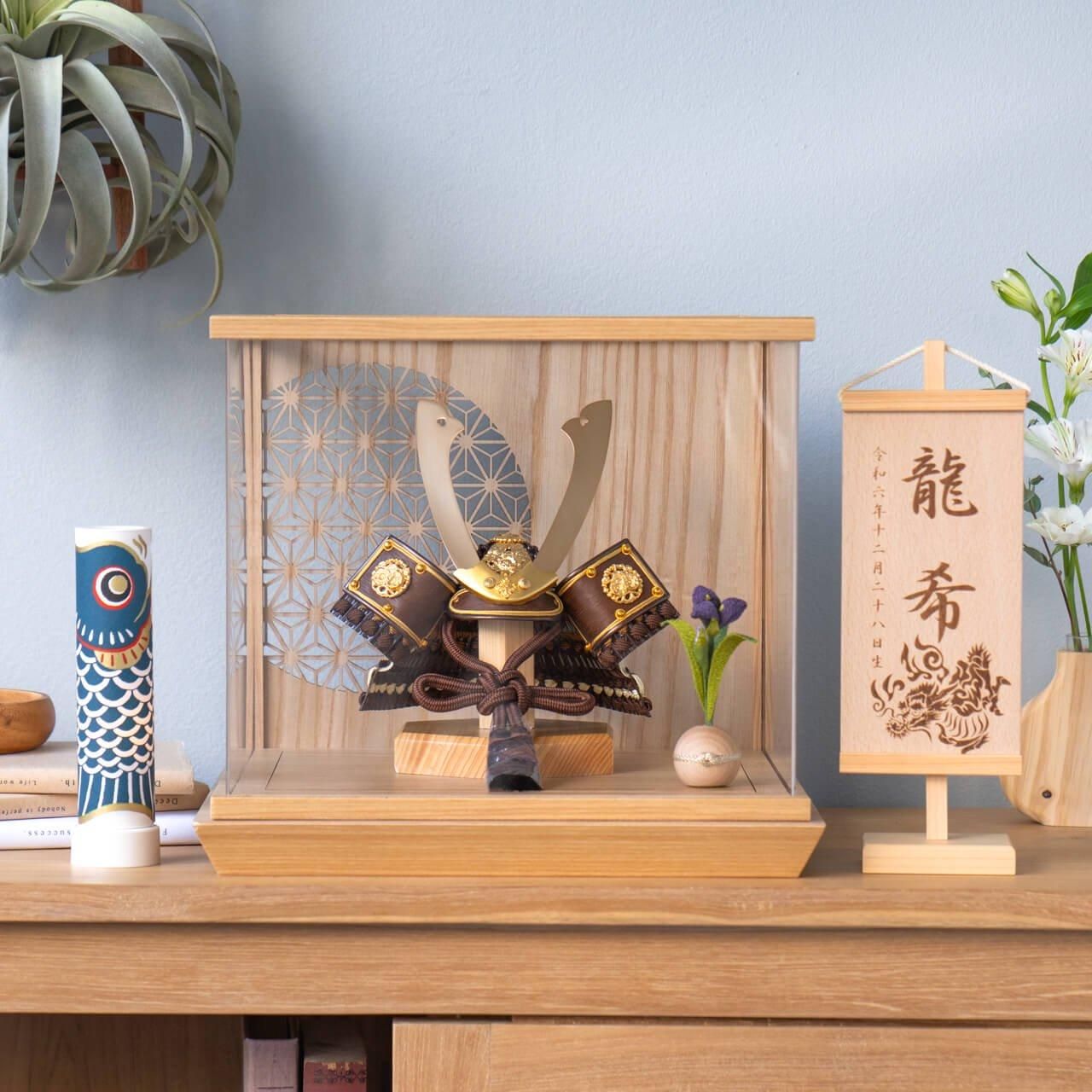 ケースでも手にとって欲しいこだわりの兜ケース伝統工芸の技術、裏側や後ろ側、内部の見えない箇所、素材にまでこだわり抜いた兜飾り。道具も木のぬくもりを感じて頂くために無垢材を使用しております。あえて飾る手間を残し、お子様とご一緒に手にとっていただき本物の素材、質感を感じてほしい「ことの兜」です。※ 細かい部品が含まれています。3歳未満のお子様は、保護者の方と一緒にお遊びください。コンパクトでちょうどいいサイズコンパクトでちょうどいいサイズ今どきのおうちに合わせたコンパクトなサイズに仕上げました。飾るスペースが狭くなりがちなマンションや子ども部屋にもぴったり。伝統的な兜をモダンに仕上げたシンプルなデザイン伝統的な兜をモダンに仕上げたシンプルなデザイン伝統的な製法で作られた兜に天然木の素材を活かしたシンプルなデザインの兜です。モダンでシンプルなデザインは、どんなお部屋の雰囲気にもピッタリ。選び抜いた素材と手間をかけた技法でつくる兜鉢選び抜いた素材と手間をかけた技法でつくる兜鉢ことの兜の兜鉢は、伝統的な本式の合せ鉢という技法でつくられています。本式の合せ鉢とは、戦国時代に頭部を守るために考案され、三角状の鉢部品を重ね合わせ、多数の星鋲をカシメる事で強度を高める技法です。日本の伝統柄 麻の葉日本の伝統柄 麻の葉模様は、麻の葉と呼ばれています。麻の丈夫さ・成長の早さにあやかり、子供の健やかな成長の願いが込められています。ケースでも手にとって欲しいこだわりの兜ケースでも手にとって欲しいこだわりの兜通常ケースタイプの商品は「取り付け型」と言われ飾る手間を省くために設置箇所が固定されています。本兜は、あえて飾る手間を残し本物の素材や質感をお子様とご一緒に手にとって飾る体験をしてもらいたい為、設置箇所は固定されておりません。また、上部、前、左右にはガラスではなくアクリル板が設置されていますので、万が一の際も安心です。お子さまの感性を育む天然木へのこだわりお子さまの感性を育む天然木へのこだわり素材には、タモ、ブナといった天然木を使用。お子さまへの一生に一度の贈り物だから、木都は自然素材の天然木にこだわり続けています。※ 生産時期により使用する素材が一部変更になる場合がございます。熟練の職人による確かな手仕事熟練の職人による確かな手仕事伝統工芸の技術を受け継ぐ日本国内の熟練の職人が、一つひとつ丁寧に手づくりしています。おしゃれなギフト包装でお届けしますおしゃれなギフト包装でお届けします和の雰囲気を感じさせる越前和紙のギフト用ラッピングでお届け。料金がわかるものもお入れしていないので、そのまま贈り物として利用できます。商品レビュー記入でもれなくもらえる天然木のミニ名前札プレゼント商品レビュー記入でもれなくもらえる天然木のミニ名前札プレゼントミニサイズのお名前札 (通常販売価格1,980円) をプレゼント♪商品到着後、商品レビューをご記入の上、商品と同梱のチラシ記載のQRコードから応募フォームへ必要事項をご入力ください。店舗よりレビュー特典を発送いたします。※ お名前札の生年月日の表記は和暦となります。(例:令和七年)商品のご注文へ収納方法とセット内容兜・鍬形・芯木・菖蒲・ケース素材:タモ重量:3,000g サイズ:W330mm × D290mm × H295mm兜のみ:約 W175mm × D145mm × H165mm注意事項本品は、金属をふんだんに使用しております。取り扱われる方の人体にすり傷、切り傷、刺傷を及ぼす場合がございますので、左記注意事項をよく読んでお取り扱い下さい。甲冑について飾り付ける際に必ず手袋をご使用ください。錆や変色などの予防にもなります。本品の上には絶対に乗らないでください。本品または本品の部品は装飾品です。他の目的に使用しないで下さい。部品には小さなものがございます。お子様がお口に入れないようにご注意いください。木製品について色合いなど実際のものと写真とでは多少の誤差が生じる場合がございます。また、手作りであり天然木を使用している為、多少の仕様の変化や風合いがひとつひとつ異なります。あらかじめご了承ください。部品には小さなものがございます。お子様がお口に入れないようにご注意いください。菖蒲には針金が入っております。お好みで角度を調整して下さい。材質により刻印の濃淡に差が生じますが不良品ではございません。木製品である限り自然なこととご承知下さいませ。保管場所は変色やカビ、サビの原因になりますので湿気の少ない場所・直射日光の当たらない場所に保管してください。ご不明点がございましたら > お問い合わせページ からご相談ください。