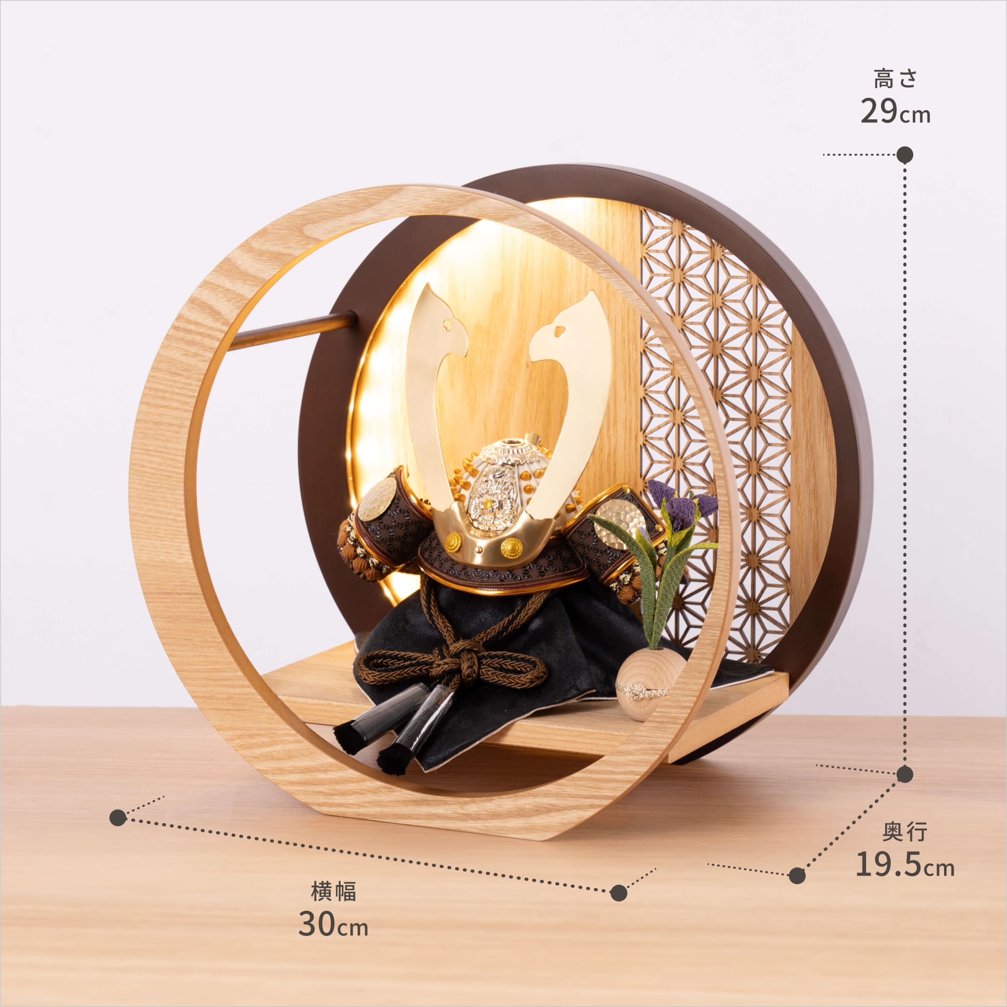 実際に手に取ると天然木の素材ならではの優しいぬくもりが伝わります。てづくり工房「木都」の職人が、伝統工芸の技術と天然木の素材を活かし、真心込めて1つ1つ丁寧につくりました。親しみやすく、お子様と一緒に飾れる「ことの兜」です。※ 細かい部品が含まれています。3歳未満のお子様は、保護者の方と一緒にお遊びください。コンパクトでちょうどいいサイズコンパクトでちょうどいいサイズ今どきのおうちに合わせたコンパクトなサイズに仕上げました。飾るスペースが狭くなりがちなマンションや子ども部屋にもぴったり。伝統的な兜をモダンに仕上げたシンプルなデザイン伝統的な兜をモダンに仕上げたシンプルなデザイン伝統的な製法で作られた兜に天然木の素材を活かしたシンプルなデザインの兜です。モダンでシンプルなデザインは、どんなお部屋の雰囲気にもピッタリ。選び抜いた素材と手間をかけた技法でつくる兜鉢選び抜いた素材と手間をかけた技法でつくる兜鉢ことの兜の兜鉢は、伝統的な本式の合せ鉢という技法でつくられています。本式の合せ鉢とは、戦国時代に頭部を守るために考案され、三角状の鉢部品を重ね合わせ、多数の星鋲をカシメる事で強度を高める技法です。健やかな成長への願いを込めた麻の葉文様健やかな成長への願いを込めた麻の葉文様古来からの日本伝統の吉祥文様である麻の葉文様。麻の丈夫さ・成長の早さにあやかり、お子さまの健やかな成長への願いが込められています。お子さまの感性を育む天然木へのこだわりお子さまの感性を育む天然木へのこだわり素材には、タモ、ブナといった天然木を使用。お子さまへの一生に一度の贈り物だから、木都は自然素材の天然木にこだわり続けています。※ 生産時期により使用する素材が一部変更になる場合がございます。熟練の職人による確かな手仕事熟練の職人による確かな手仕事伝統工芸の技術を受け継ぐ日本国内の熟練の職人が、一つひとつ丁寧に手づくりしています。おしゃれなギフト包装でお届けしますおしゃれなギフト包装でお届けします和の雰囲気を感じさせる越前和紙のギフト用ラッピングでお届け。料金がわかるものもお入れしていないので、そのまま贈り物として利用できます。商品レビュー記入でもれなくもらえる天然木のミニ名前札プレゼント商品レビュー記入でもれなくもらえる天然木のミニ名前札プレゼントミニサイズのお名前札 (通常販売価格1,980円) をプレゼント♪商品到着後、商品レビューをご記入の上、商品と同梱のチラシ記載のQRコードから応募フォームへ必要事項をご入力ください。店舗よりレビュー特典を発送いたします。※ お名前札の生年月日の表記は和暦となります。(例:令和七年)商品のご注文へ収納方法とセット内容兜・鍬形・袱紗・芯木・菖蒲・飾り台・電源ケーブル素材:タモ重量:1,320g サイズ:W300mm × D195mm × H290mm梱包時:W340mm × D240mm × H330mm兜のみ:約 W180mm × D140mm × H150mm注意事項本品は、金属をふんだんに使用しております。取り扱われる方の人体にすり傷、切り傷、刺傷を及ぼす場合がございますので、左記注意事項をよく読んでお取り扱い下さい。甲冑について飾り付ける際に必ず手袋をご使用ください。錆や変色などの予防にもなります。本品の上には絶対に乗らないでください。本品または本品の部品は装飾品です。他の目的に使用しないで下さい。部品には小さなものがございます。お子様がお口に入れないようにご注意いください。木製品について色合いなど実際のものと写真とでは多少の誤差が生じる場合がございます。また、手作りであり天然木を使用している為、多少の仕様の変化や風合いがひとつひとつ異なります。あらかじめご了承ください。部品には小さなものがございます。お子様がお口に入れないようにご注意いください。菖蒲には針金が入っております。お好みで角度を調整して下さい。材質により刻印の濃淡に差が生じますが不良品ではございません。木製品である限り自然なこととご承知下さいませ。保管場所は変色やカビ、サビの原因になりますので湿気の少ない場所・直射日光の当たらない場所に保管してください。ご不明点がございましたら > お問い合わせページ からご相談ください。