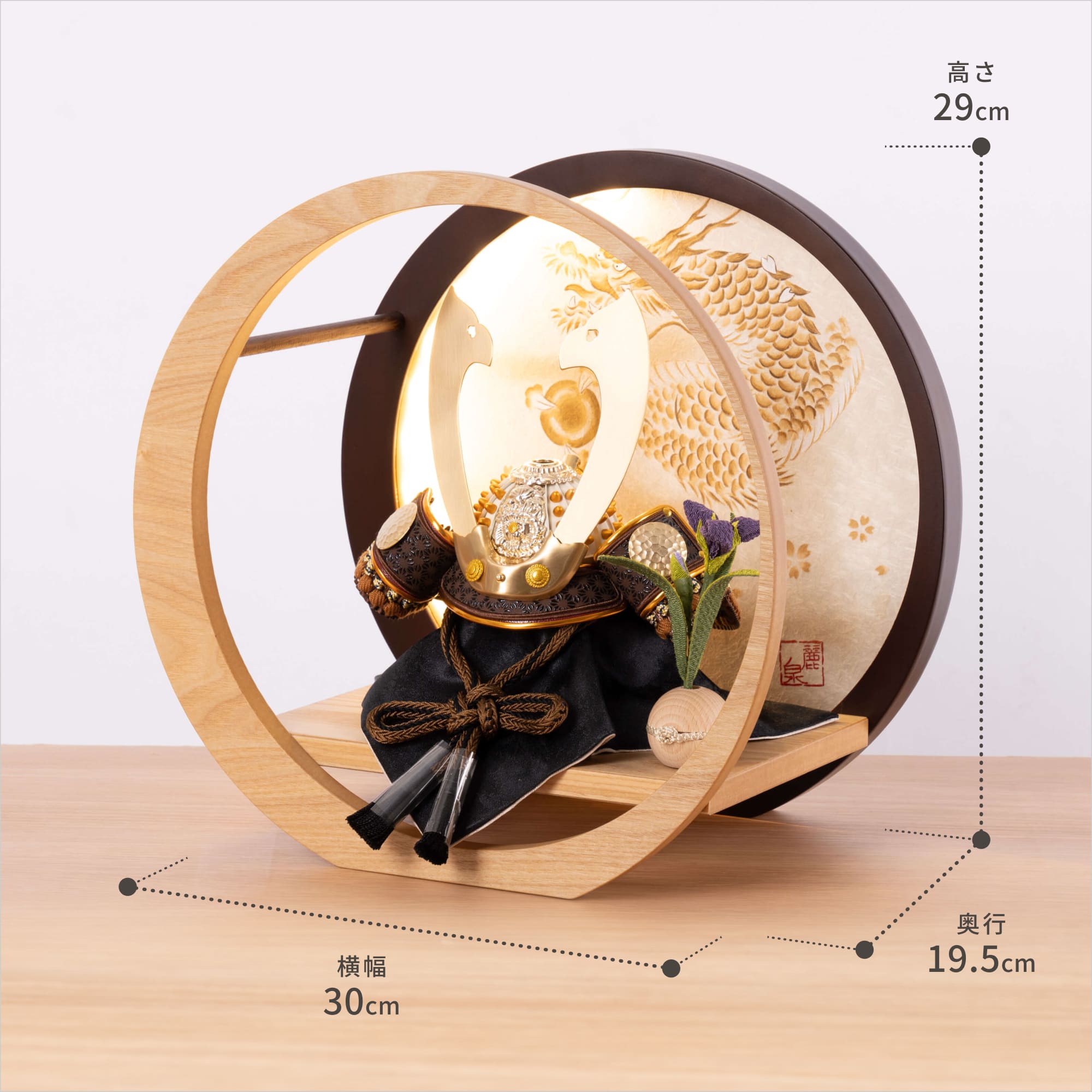 実際に手に取ると天然木の素材ならではの優しいぬくもりが伝わります。てづくり工房「木都」の職人が、伝統工芸の技術と天然木の素材を活かし、真心込めて1つ1つ丁寧につくりました。親しみやすく、お子様と一緒に飾れる「ことの兜」です。※ 細かい部品が含まれています。3歳未満のお子様は、保護者の方と一緒にお遊びください。コンパクトでちょうどいいサイズコンパクトでちょうどいいサイズ今どきのおうちに合わせたコンパクトなサイズに仕上げました。飾るスペースが狭くなりがちなマンションや子ども部屋にもぴったり。伝統的な兜をモダンに仕上げたシンプルなデザイン伝統的な兜をモダンに仕上げたシンプルなデザイン伝統的な製法で作られた兜に天然木の素材を活かしたシンプルなデザインの兜です。モダンでシンプルなデザインは、どんなお部屋の雰囲気にもピッタリ。選び抜いた素材と手間をかけた技法でつくる兜鉢選び抜いた素材と手間をかけた技法でつくる兜鉢ことの兜の兜鉢は、伝統的な本式の合せ鉢という技法でつくられています。本式の合せ鉢とは、戦国時代に頭部を守るために考案され、三角状の鉢部品を重ね合わせ、多数の星鋲をカシメる事で強度を高める技法です。子供の健やかな成長を願う 龍子供の健やかな成長を願う 龍龍には悪いものを払いのけ幸運をもたらす力があるとされており、子供の健やかな成長への願いが込められています。また、出世や繁栄の象徴でもあり、子供の将来の成功を願う勇ましい装飾として親しまれています。お子さまの感性を育む天然木へのこだわりお子さまの感性を育む天然木へのこだわり素材には、タモ、ブナといった天然木を使用。お子さまへの一生に一度の贈り物だから、木都は自然素材の天然木にこだわり続けています。※ 生産時期により使用する素材が一部変更になる場合がございます。熟練の職人による確かな手仕事熟練の職人による確かな手仕事伝統工芸の技術を受け継ぐ日本国内の熟練の職人が、一つひとつ丁寧に手づくりしています。おしゃれなギフト包装でお届けしますおしゃれなギフト包装でお届けします和の雰囲気を感じさせる越前和紙のギフト用ラッピングでお届け。料金がわかるものもお入れしていないので、そのまま贈り物として利用できます。商品レビュー記入でもれなくもらえる天然木のミニ名前札プレゼント商品レビュー記入でもれなくもらえる天然木のミニ名前札プレゼントミニサイズのお名前札 (通常販売価格1,980円) をプレゼント♪商品到着後、商品レビューをご記入の上、商品と同梱のチラシ記載のQRコードから応募フォームへ必要事項をご入力ください。店舗よりレビュー特典を発送いたします。※ お名前札の生年月日の表記は和暦となります。(例:令和七年)商品のご注文へ収納方法とセット内容兜・鍬形・袱紗・芯木・菖蒲・飾り台・電源ケーブル素材:タモ重量:1,320g サイズ:W300mm × D195mm × H290mm梱包時:W340mm × D240mm × H330mm兜のみ:約 W180mm × D140mm × H150mm注意事項本品は、金属をふんだんに使用しております。取り扱われる方の人体にすり傷、切り傷、刺傷を及ぼす場合がございますので、左記注意事項をよく読んでお取り扱い下さい。甲冑について飾り付ける際に必ず手袋をご使用ください。錆や変色などの予防にもなります。本品の上には絶対に乗らないでください。本品または本品の部品は装飾品です。他の目的に使用しないで下さい。部品には小さなものがございます。お子様がお口に入れないようにご注意いください。木製品について色合いなど実際のものと写真とでは多少の誤差が生じる場合がございます。また、手作りであり天然木を使用している為、多少の仕様の変化や風合いがひとつひとつ異なります。あらかじめご了承ください。部品には小さなものがございます。お子様がお口に入れないようにご注意いください。菖蒲には針金が入っております。お好みで角度を調整して下さい。材質により刻印の濃淡に差が生じますが不良品ではございません。木製品である限り自然なこととご承知下さいませ。保管場所は変色やカビ、サビの原因になりますので湿気の少ない場所・直射日光の当たらない場所に保管してください。ご不明点がございましたら > お問い合わせページ からご相談ください。