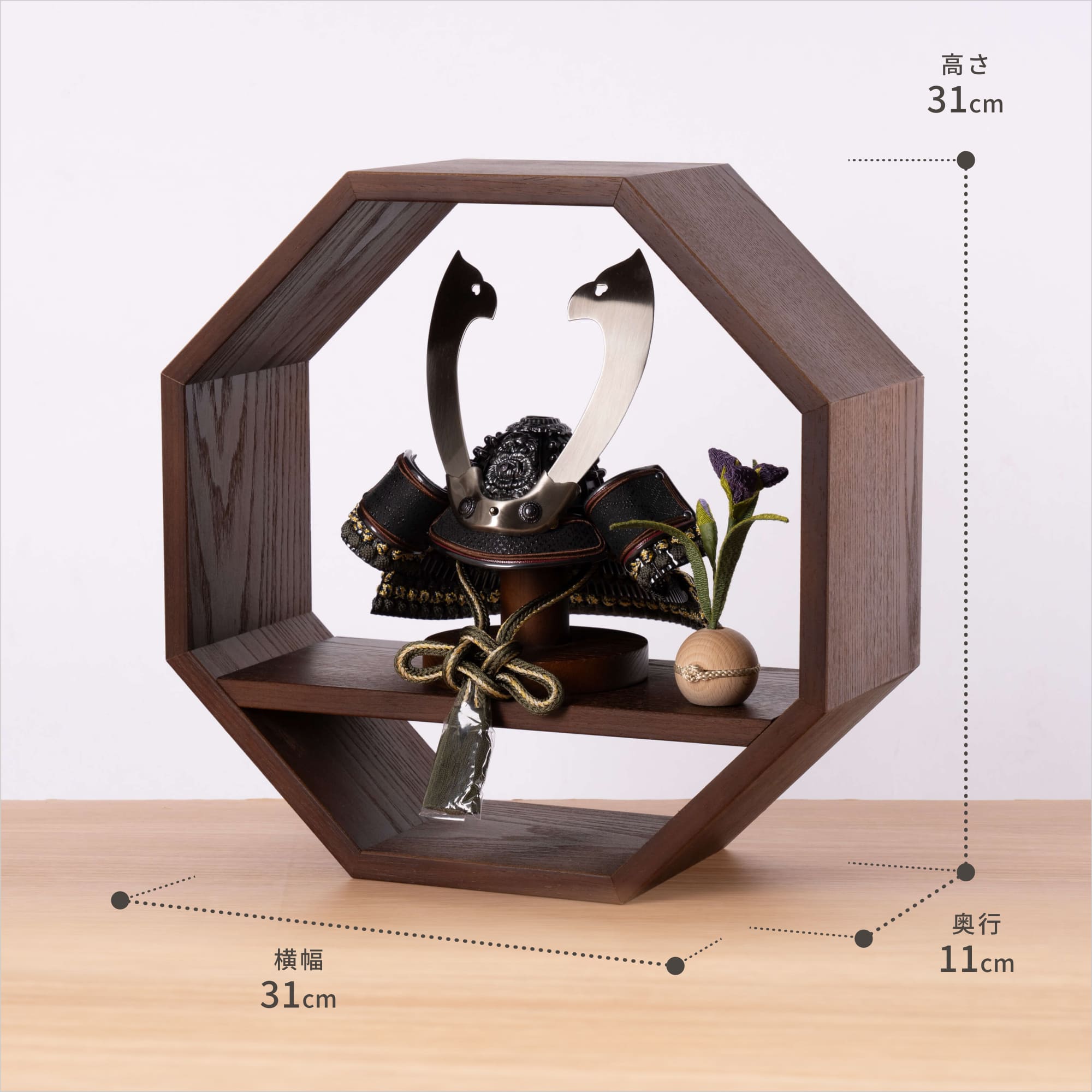 実際に手に取ると天然木の素材ならではの優しいぬくもりが伝わります。てづくり工房「木都」の職人が、伝統工芸の技術と天然木の素材を活かし、真心込めて1つ1つ丁寧につくりました。親しみやすく、お子様と一緒に飾れる「ことの兜」です。※ 細かい部品が含まれています。3歳未満のお子様は、保護者の方と一緒にお遊びください。コンパクトでちょうどいいサイズコンパクトでちょうどいいサイズ今どきのおうちに合わせたコンパクトなサイズに仕上げました。飾るスペースが狭くなりがちなマンションや子ども部屋にもぴったり。伝統的な兜をモダンに仕上げたシンプルなデザイン伝統的な兜をモダンに仕上げたシンプルなデザイン伝統的な製法で作られた兜に天然木の素材を活かしたシンプルなデザインの兜です。モダンでシンプルなデザインは、どんなお部屋の雰囲気にもピッタリ。選び抜いた素材と手間をかけた技法でつくる兜鉢選び抜いた素材と手間をかけた技法でつくる兜鉢ことの兜の兜鉢は、伝統的な本式の合せ鉢という技法でつくられています。本式の合せ鉢とは、戦国時代に頭部を守るために考案され、三角状の鉢部品を重ね合わせ、多数の星鋲をカシメる事で強度を高める技法です。幸せを引き寄せる八角形幸せを引き寄せる八角形八角形は「縁起が良い」とされる形の一つで、「繁栄」「幸運」「幸福」などを象徴するシンボルでもあります。風水では“八方位”を表すとされており、全ての方角から幸せを引き寄せると伝えられています。お子さまの感性を育む天然木へのこだわりお子さまの感性を育む天然木へのこだわり素材には、タモ、ブナといった天然木を使用。お子さまへの一生に一度の贈り物だから、木都は自然素材の天然木にこだわり続けています。※ 生産時期により使用する素材が一部変更になる場合がございます。熟練の職人による確かな手仕事熟練の職人による確かな手仕事伝統工芸の技術を受け継ぐ日本国内の熟練の職人が、一つひとつ丁寧に手づくりしています。おしゃれなギフト包装でお届けしますおしゃれなギフト包装でお届けします和の雰囲気を感じさせる越前和紙のギフト用ラッピングでお届け。料金がわかるものもお入れしていないので、そのまま贈り物として利用できます。商品レビュー記入でもれなくもらえる天然木のミニ名前札プレゼント商品レビュー記入でもれなくもらえる天然木のミニ名前札プレゼントミニサイズのお名前札 (通常販売価格1,980円) をプレゼント♪商品到着後、商品レビューをご記入の上、商品と同梱のチラシ記載のQRコードから応募フォームへ必要事項をご入力ください。店舗よりレビュー特典を発送いたします。※ お名前札の生年月日の表記は和暦となります。(例:令和七年)商品のご注文へ収納方法とセット内容兜・鍬形・芯木・菖蒲・飾り台素材:タモ重量:1,620g サイズ:W310mm × D110mm × H310mm梱包時:W460mm × D370mm × H160mm兜のみ:約 W180mm × D140mm × H150mm注意事項本品は、金属をふんだんに使用しております。取り扱われる方の人体にすり傷、切り傷、刺傷を及ぼす場合がございますので、左記注意事項をよく読んでお取り扱い下さい。甲冑について飾り付ける際に必ず手袋をご使用ください。錆や変色などの予防にもなります。本品の上には絶対に乗らないでください。本品または本品の部品は装飾品です。他の目的に使用しないで下さい。部品には小さなものがございます。お子様がお口に入れないようにご注意いください。木製品について色合いなど実際のものと写真とでは多少の誤差が生じる場合がございます。また、手作りであり天然木を使用している為、多少の仕様の変化や風合いがひとつひとつ異なります。あらかじめご了承ください。部品には小さなものがございます。お子様がお口に入れないようにご注意いください。菖蒲には針金が入っております。お好みで角度を調整して下さい。材質により刻印の濃淡に差が生じますが不良品ではございません。木製品である限り自然なこととご承知下さいませ。保管場所は変色やカビ、サビの原因になりますので湿気の少ない場所・直射日光の当たらない場所に保管してください。ご不明点がございましたら > お問い合わせページ からご相談ください。