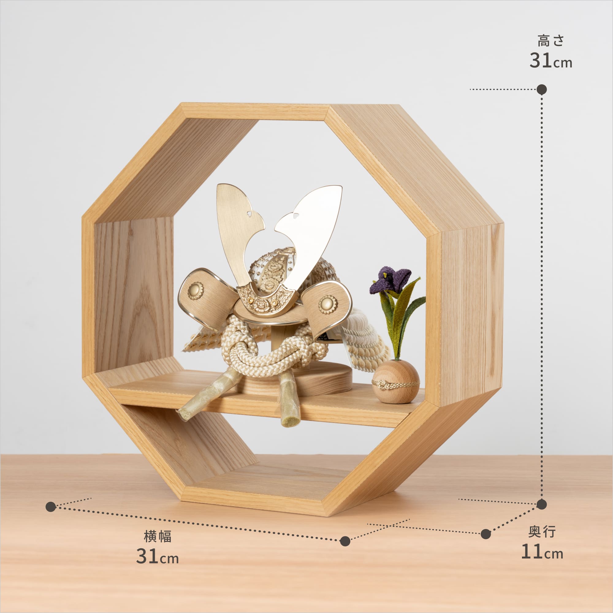 実際に手に取ると天然木の素材ならではの優しいぬくもりが伝わります。てづくり工房「木都」の職人が、伝統工芸の技術と天然木の素材を活かし、真心込めて1つ1つ丁寧につくりました。親しみやすく、お子様と一緒に飾れる「ことのおぼこ兜」です。※ 細かい部品が含まれています。3歳未満のお子様は、保護者の方と一緒にお遊びください。コンパクトでちょうどいいサイズコンパクトでちょうどいいサイズ今どきのおうちに合わせたコンパクトなサイズに仕上げました。飾るスペースが狭くなりがちなマンションや子ども部屋にもぴったり。伝統的な兜をモダンに仕上げたシンプルなデザイン伝統的な兜をモダンに仕上げたシンプルなデザイン伝統的な製法で作られた兜に天然木の素材を活かしたシンプルなデザインの兜です。モダンでシンプルなデザインは、どんなお部屋の雰囲気にもピッタリ。丸みを帯びた親しみやすいフォルム丸みを帯びた親しみやすいフォルム吹き返しやまびさし、鍬形にいたるまで、全体的に丸みを帯びた形状に仕上げました。伝統的な兜でありながら、親しみやすさを感じる兜です。選び抜いた素材と手間をかけた技法でつくる兜鉢選び抜いた素材と手間をかけた技法でつくる兜鉢ことのおぼこ兜の兜鉢は、伝統的な本式の合せ鉢という技法でつくられています。本式の合せ鉢とは、戦国時代に頭部を守るために考案され、三角状の鉢部品を重ね合わせ、多数の星鋲をカシメる事で強度を高める技法です。幸せを引き寄せる八角形幸せを引き寄せる八角形八角形は「縁起が良い」とされる形の一つで、「繁栄」「幸運」「幸福」などを象徴するシンボルでもあります。風水では“八方位”を表すとされており、全ての方角から幸せを引き寄せると伝えられています。お子さまの感性を育む天然木へのこだわりお子さまの感性を育む天然木へのこだわり素材には、タモ、ブナといった天然木を使用。お子さまへの一生に一度の贈り物だから、木都は自然素材の天然木にこだわり続けています。※ 生産時期により使用する素材が一部変更になる場合がございます。熟練の職人による確かな手仕事熟練の職人による確かな手仕事伝統工芸の技術を受け継ぐ日本国内の熟練の職人が、一つひとつ丁寧に手づくりしています。おしゃれなギフト包装でお届けしますおしゃれなギフト包装でお届けします和の雰囲気を感じさせる越前和紙のギフト用ラッピングでお届け。料金がわかるものもお入れしていないので、そのまま贈り物として利用できます。商品レビュー記入でもれなくもらえる天然木のミニ名前札プレゼント商品レビュー記入でもれなくもらえる天然木のミニ名前札プレゼントミニサイズのお名前札 (通常販売価格1,980円) をプレゼント♪商品到着後、商品レビューをご記入の上、商品と同梱のチラシ記載のQRコードから応募フォームへ必要事項をご入力ください。店舗よりレビュー特典を発送いたします。※ お名前札の生年月日の表記は和暦となります。(例:令和七年)商品のご注文へ収納方法とセット内容兜・鍬形・芯木・菖蒲・飾り台素材:タモ重量:1,240g サイズ:W310mm × D110mm × H310mm梱包時:W460mm × D370mm × H160mm兜のみ:約 W180mm × D140mm × H130mm注意事項甲冑について飾り付ける際に必ず手袋をご使用ください。錆や変色などの予防にもなります。本品の上には絶対に乗らないでください。本品または本品の部品は装飾品です。他の目的に使用しないで下さい。部品には小さなものがございます。お子様がお口に入れないようにご注意いください。木製品について色合いなど実際のものと写真とでは多少の誤差が生じる場合がございます。また、手作りであり天然木を使用している為、多少の仕様の変化や風合いがひとつひとつ異なります。あらかじめご了承ください。部品には小さなものがございます。お子様がお口に入れないようにご注意いください。菖蒲には針金が入っております。お好みで角度を調整して下さい。材質により刻印の濃淡に差が生じますが不良品ではございません。木製品である限り自然なこととご承知下さいませ。保管場所は変色やカビ、サビの原因になりますので湿気の少ない場所・直射日光の当たらない場所に保管してください。ご不明点がございましたら > お問い合わせページ からご相談ください。
