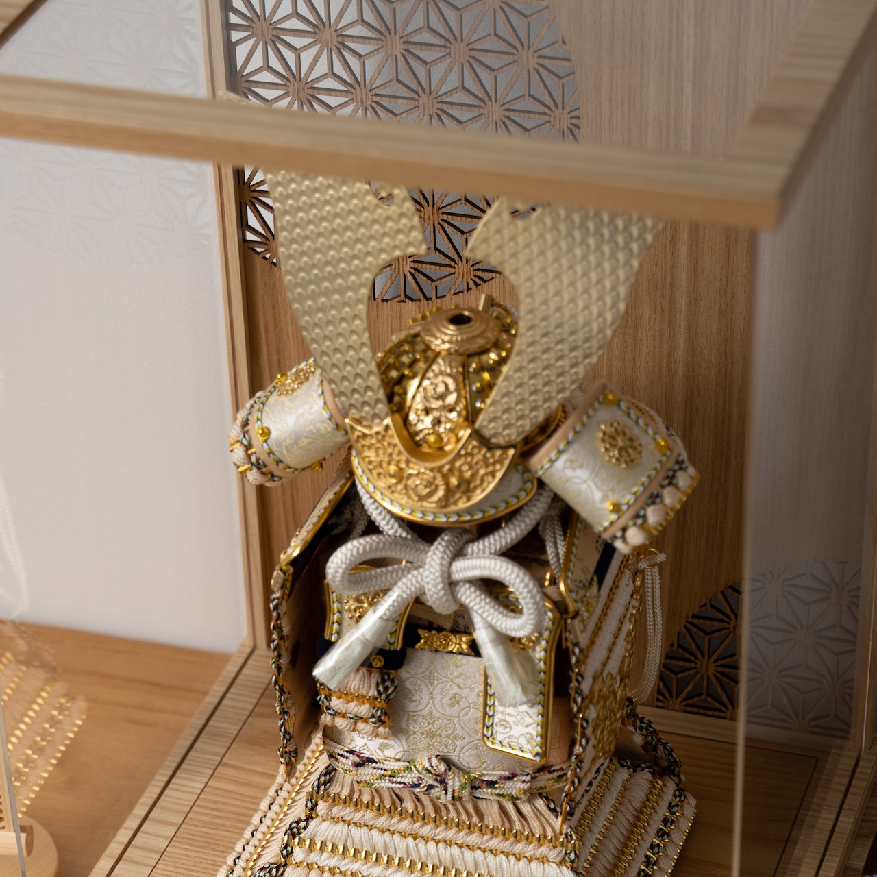 ケースでも手にとって欲しいこだわりの兜通常ケースタイプの商品は「取り付け型」と言われ飾る手間を省くために設置箇所が固定されています。本兜は、あえて飾る手間を残し本物の素材や質感をお子様とご一緒に手にとって飾る体験をしてもらいたい為、設置箇所は固定されておりません。また、上部、前、左右にはガラスではなくアクリル板が設置されていますので、万が一の際も安心です。