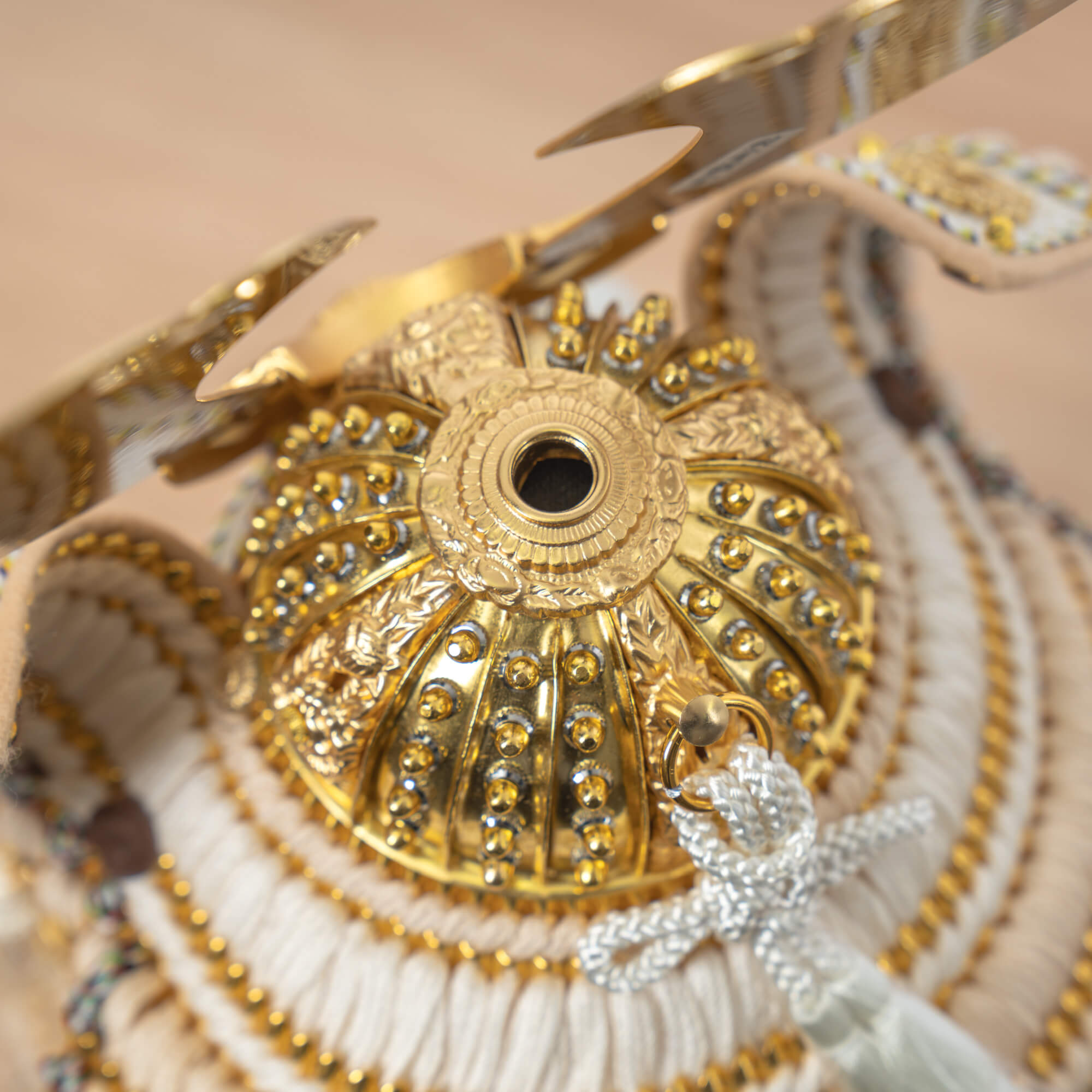 選び抜いた素材と手間をかけた技法でつくる兜鉢ことの奉納鎧の兜鉢は、伝統的な本式の合せ鉢という技法でつくられています。本式の合せ鉢とは、戦国時代に頭部を守るために考案され、三角状の鉢部品を重ね合わせ、多数の星鋲をカシメる事で強度を高める技法です。