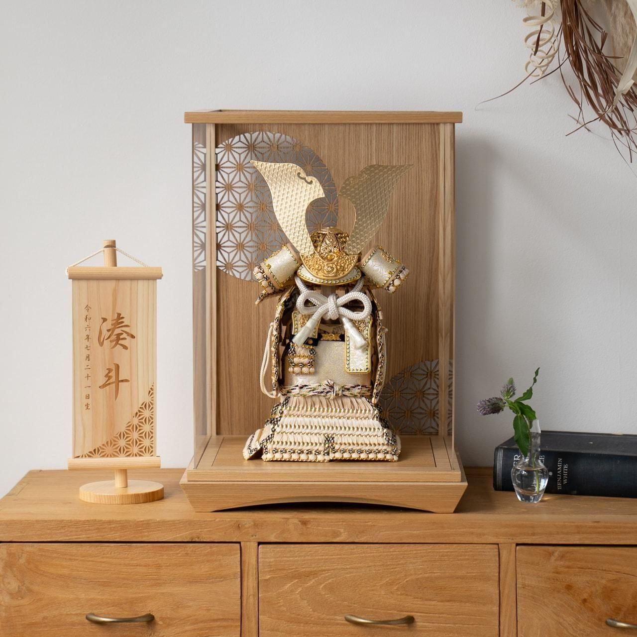 実際に手に取ると天然木の素材ならではの優しいぬくもりが伝わります。てづくり工房「木都」の職人が、伝統工芸の技術と天然木の素材を活かし、真心込めて1つ1つ丁寧につくりました。親しみやすく、お子様と一緒に飾れることの「ことの奉納鎧」です。※ 細かい部品が含まれています。3歳未満のお子様は、保護者の方と一緒にお遊びください。コンパクトでちょうどいいサイズコンパクトでちょうどいいサイズ今どきのおうちに合わせたコンパクトなサイズに仕上げました。飾るスペースが狭くなりがちなマンションや子ども部屋にもぴったり。伝統的な兜をモダンに仕上げたシンプルなデザイン伝統的な兜をモダンに仕上げたシンプルなデザイン伝統的な製法で作られた兜に天然木の素材を活かしたシンプルなデザインの兜です。モダンでシンプルなデザインは、どんなお部屋の雰囲気にもピッタリ。選び抜いた素材と手間をかけた技法でつくる兜鉢選び抜いた素材と手間をかけた技法でつくる兜鉢ことの奉納鎧の兜鉢は、伝統的な本式の合せ鉢という技法でつくられています。本式の合せ鉢とは、戦国時代に頭部を守るために考案され、三角状の鉢部品を重ね合わせ、多数の星鋲をカシメる事で強度を高める技法です。健やかな成長への願いを込めた麻の葉文様健やかな成長への願いを込めた麻の葉文様古来からの日本伝統の吉祥文様である麻の葉文様。麻の丈夫さ・成長の早さにあやかり、お子さまの健やかな成長への願いが込められています。ケースでも手にとって欲しいこだわりの兜ケースでも手にとって欲しいこだわりの兜通常ケースタイプの商品は「取り付け型」と言われ飾る手間を省くために設置箇所が固定されています。本兜は、あえて飾る手間を残し本物の素材や質感をお子様とご一緒に手にとって飾る体験をしてもらいたい為、設置箇所は固定されておりません。また、上部、前、左右にはガラスではなくアクリル板が設置されていますので、万が一の際も安心です。お子さまの感性を育む天然木へのこだわりお子さまの感性を育む天然木へのこだわり素材には、タモ、ブナといった天然木を使用。お子さまへの一生に一度の贈り物だから、木都は自然素材の天然木にこだわり続けています。※ 生産時期により使用する素材が一部変更になる場合がございます。熟練の職人による確かな手仕事熟練の職人による確かな手仕事伝統工芸の技術を受け継ぐ日本国内の熟練の職人が、一つひとつ丁寧に手づくりしています。おしゃれなギフト包装でお届けしますおしゃれなギフト包装でお届けします和の雰囲気を感じさせる越前和紙のギフト用ラッピングでお届け。料金がわかるものもお入れしていないので、そのまま贈り物として利用できます。商品レビュー記入でもれなくもらえる天然木のミニ名前札プレゼント商品レビュー記入でもれなくもらえる天然木のミニ名前札プレゼントミニサイズのお名前札 (通常販売価格1,980円) をプレゼント♪商品到着後、商品レビューをご記入の上、商品と同梱のチラシ記載のQRコードから応募フォームへ必要事項をご入力ください。店舗よりレビュー特典を発送いたします。※ お名前札の生年月日の表記は和暦となります。(例:令和七年)商品のご注文へ収納方法とセット内容鎧・ケース素材:タモ重量:4,400g サイズ:W310mm × D280mm × H460mm鎧兜のみ:約 W210mm × D170mm × H340mm注意事項甲冑について飾り付ける際に必ず手袋をご使用ください。錆や変色などの予防にもなります。本品の上には絶対に乗らないでください。本品または本品の部品は装飾品です。他の目的に使用しないで下さい。部品には小さなものがございます。お子様がお口に入れないようにご注意いください。木製品について色合いなど実際のものと写真とでは多少の誤差が生じる場合がございます。また、手作りであり天然木を使用している為、多少の仕様の変化や風合いがひとつひとつ異なります。あらかじめご了承ください。部品には小さなものがございます。お子様がお口に入れないようにご注意いください。材質により刻印の濃淡に差が生じますが不良品ではございません。木製品である限り自然なこととご承知下さいませ。保管場所は変色やカビ、サビの原因になりますので湿気の少ない場所・直射日光の当たらない場所に保管してください。ご不明点がございましたら > お問い合わせページ からご相談ください。